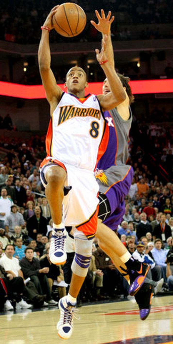 NBA í nótt: Ellis batt enda á sigurgöngu Phoenix Eiríkur Stefán Ásgeirsson skrifar 27. nóvember 2007 09:18 Monta Ellis fór á kostum í nótt með Golden State. Hér kemur Steve Nash engum vörnum við. Nordic Photos / Getty Images Monta Ellis gerði sér lítið fyrir og skoraði fimmtán stig í röð undir lok leiks Golden State og Phoenix og tryggði þar með fyrrnefnda liðinu sigur í leiknum, 129-114. Phoenix hafði unnið síðustu átta leiki sína í röð en Golden State fór gríðarlega mikinn í fyrri hálfleik og skoraði þá 72 stig gegn 63 hjá Phoenix. Golden State skoraði til að mynda 45 stig í fyrsta leikhluta og lagði þar með grunninn að sigri liðsins. Phoenix náði aldrei að jafna leikinn eftir þetta og sigur Golden State var nokkuð öruggur. Phoenix náði reyndar að minnka muninn í níu stig þegar tíu mínútur voru eftir af leiknum en þá tók Ellis til sinna mála. Ellis skoraði 31 stig í eliknum en Stephen Jackson var stigahæstur hjá Golden State með 32 stig. Baron Davis var með 28 stig og tíu fráköst. Hjá Phoenix var Steve Nash stigahæstur með 23 stig og þrettán stoðsendingar og Shawn Marion var með tíu stig og fjórtán fráköst. San Antonio Spurs töpuðu einnig í nótt eftir fimm sigurleiki í röð. Það var Sacramento Kings sem batt enda á sigurgöngu liðsins með góðum sigri, 112-99. Beno Udrih var með 27 stig í leiknum en stigahæstur hjá Spurs var Tim Duncan með fimmtán stig. Þá tapaði enn eina stórveldið, Dallas Mavericks, sínum fyrsta heimaleik á tímabilinu er liðið tapaði fyrir Washington Wizards, 110-98. Caron Butler var með 35 stig fyrir Washington og Antawn Jamison 27. Dirk Nowitzky var með 31 stig fyrir Dallas. Stephon Marbury fór á kostum þegar New York Knicks vann Utah Jazz í nótt, 103-109. Hann skoraði 28 stig og Zach Randolph var með 25 stig og fjórtán fráköst. Hjá Utah var Carlos Boozer stigahæstur með 30 stig. Minnesota Timberwolves vann aðeins sinn annan sigur á tímabilinu er liðið vann New Orleans Hornets, 103-94. Marko Jaric var með 21 stig fyrir Minnesota og Sebastian Telfair 20. Chris Paul var með 31 stig hjá New Orleans. Að síðustu skoraði Tracy McGrady 36 stig fyrir Houston sem vann LA Clippers, 88-71, á útivelli. McGrady skoraði nítján stig í fjórða leikhluta en Yao Ming var næst stigahæstur með fjórtán stig. NBA Mest lesið Dómarinn hlýtur mikið lof fyrir stundarbræði í garð Jake Paul og Joshua Sport Pílukastarinn biðst afsökunar á að hafa fallið á lyfjaprófinu og öllum lygunum Sport Tvenna frá Rogers tryggði Villa sigur gegn Manchester United Enski boltinn Albert skoraði í fyrsta sigri Fiorentina Fótbolti Haaland gaf barnabarni Hareide gjöf Enski boltinn Arnór Ingvi orðinn leikmaður KR Íslenski boltinn Sakaður um svindl á HM í pílukasti Sport Tvær títanplötur settar í Jake Paul eftir kjálkabrotið Sport Ronaldo á nærbuxunum lætur Elon Musk efast um sjálfan sig Fótbolti „Ef dómarinn hefði sinnt sínu starfi almennilega hefði Romero ekki fengið spjald“ Enski boltinn Fleiri fréttir Kolbrún María kom við sögu í endurkomu Hannover Næstframlagshæstur í grátlegu tapi Fékk næstum 4,5 milljóna króna sekt fyrir að sýna dómara fingurinn „Komum eins og aumingjar inn í þennan leik“ „Jólasteikin mun bragðast betur í ljósi þessa sigurs“ Stjarnan - Álftanes 108-104 | Unnu grannaslaginn naumlega Uppgjörið: Ármann - ÍA 102-83 | Ármann náði í gríðarlega mikilvæg stig í fallbaráttunni með sigri gegn Skagamönnum Jokic tók NBA-met af Abdul-Jabbar í nótt KR á frábærum stað en getur ekki unnið titilinn Útilokar ekki breytingar: „Er klárlega að líta í kringum mig“ Uppgjörið: Keflavík - Njarðvík 93-83 | Enn taplausir í Sláturhúsinu „Ánægður að spila ekki betur en þetta en vinna samt“ „Svo lengi sem það er ekki jákvæð og góð umfjöllun um okkur erum við sáttir“ „Hefðum þurft að hafa heppnina með okkur í liði“ ÍR - Valur 82-85 | Baráttusigur í Breiðholti „Sáttur að geta farið heim, borðað vel og fengið mér nokkra kalda“ Tindastóll - KR 130-117 | Kláruðu gestina í seinni hálfleik Þór Þ. - Grindavík 94-106 | Baráttusigur gegn löskuðu liði Þórs Liðsfélagar Guðbjargar ekki fæddir þegar hún spilaði fyrsta leikinn Þola þeir ekki gott umtal? „Helmingur minna leikmanna skilur ekki íslensku“ „Ef við hefðum ekki verið að setja þessi skot þá hefðum við skíttapað“ KR á toppinn Uppgjörið: Grindavík - Haukar 92-93 | Fullkomin jólagjöf Spilaði 13 mínútur en var stigahæstur Rýndu í gamlar myndir: „Svakalega ertu kringlóttur í framan“ Guðbjörg fyrsta konan í fjögur hundruð leikina Stjarnan og Grindavík mætast í bikarnum Tryggvi og Sara best á árinu New York Knicks vann titil í nótt Umfjöllun: Keflavík 97 - 84 Ármann | Sannfærandi sigur heimakvenna Sjá meira