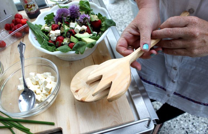 „Þetta salat gerir þú bara á einni til tveimur mínútum vil ég meina..." sagði Rósa Guðbjartsdóttir áður en hún sýndi okkur hvernig útbúa má einfalt, hollt og kærleiksríkt salat sem borða má með hverju sem er. Með því að smella á hnappinn Horfa á myndskeið með frétt má sjá viðtalið. Eldað af lífi og sál - matreiðslubók (bókin hennar Rósu). Viljið þið sjá hvað hún er að rækta!! (óbirt efni) ATH: Áhöldin (úr tré) sem sjá má á myndunum fást í Sólheimum Grímsnesi.
