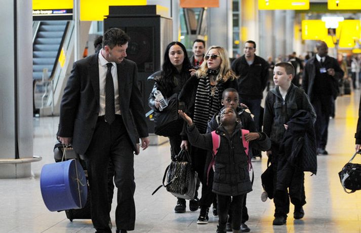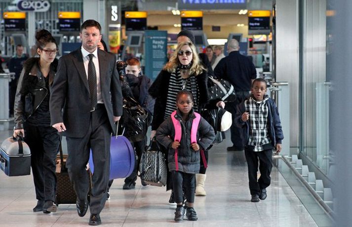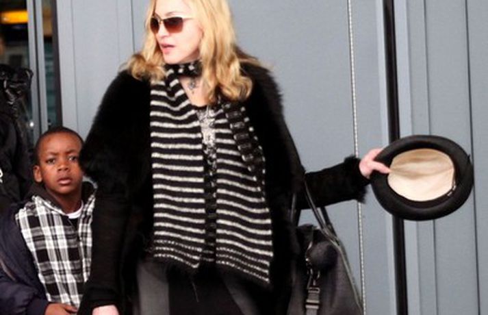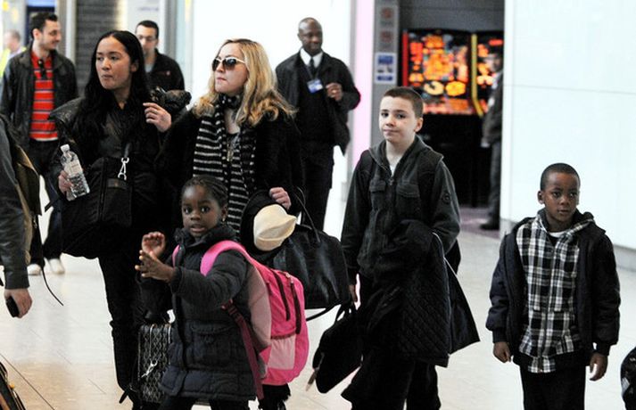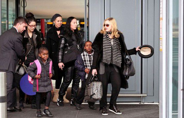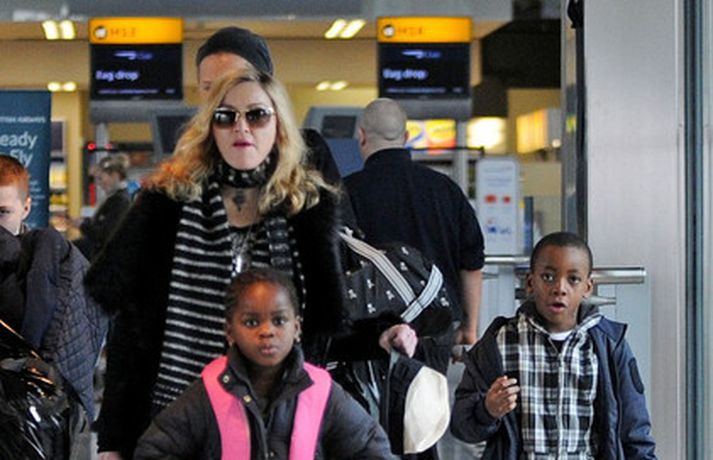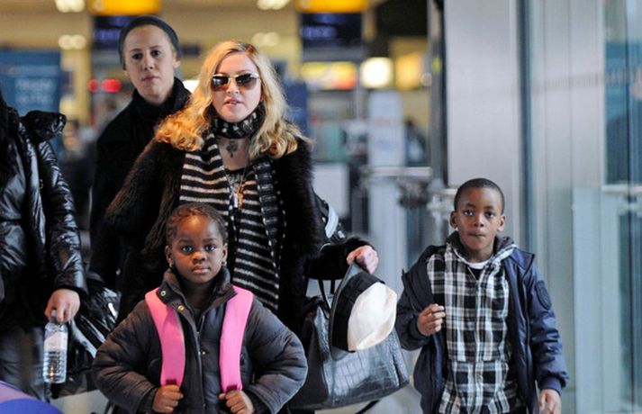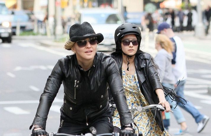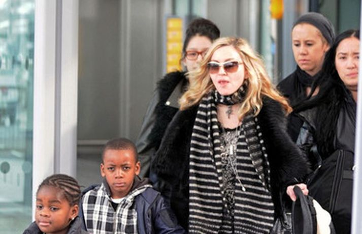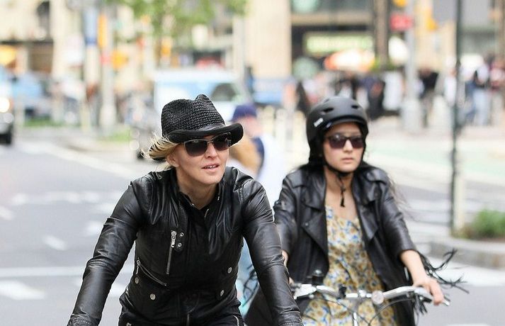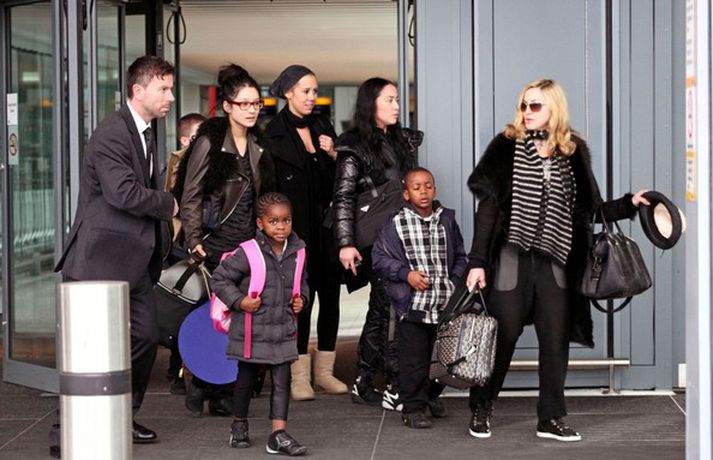 Eins og myndirnar sýna var Madonna, 52 ára, klædd í ljósbláan Stellu McCartney síðkjól og Sergio Rossi skó í New York á dögunum, stórglæsileg að vanda. Þá má sjá söngkonuna hjóla um götur New York borgar og með börnum sínum, Rocco John, 11 ára, David Banda Ritchie, 6 ára og Mercy, 5 ára, á Heathrow flugvellinum.