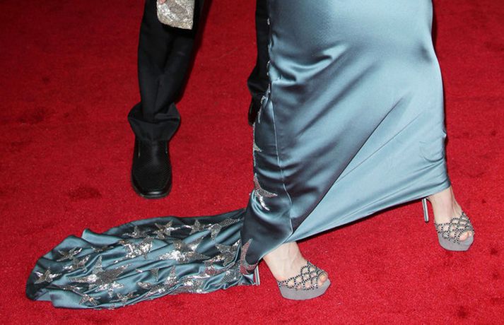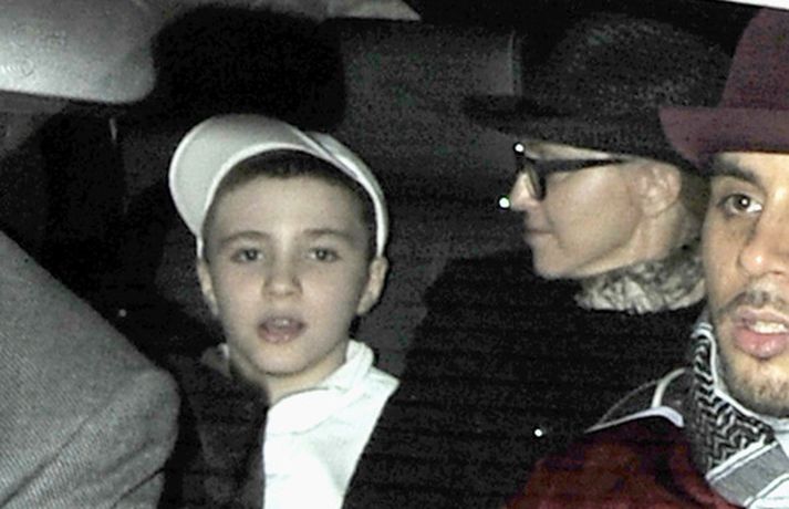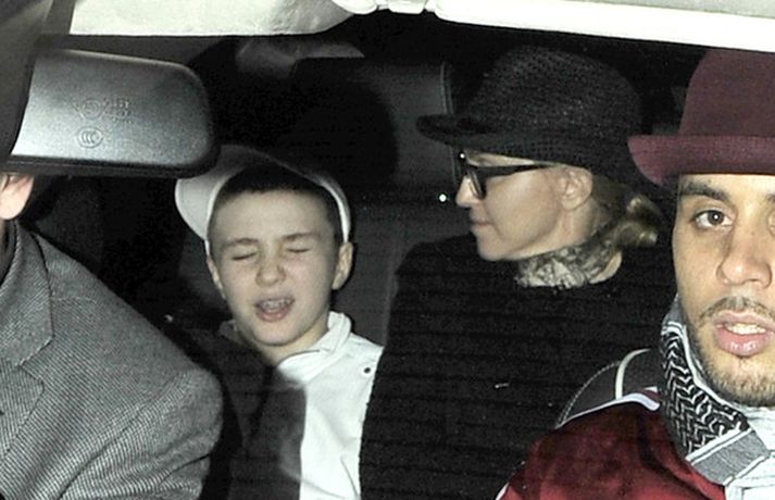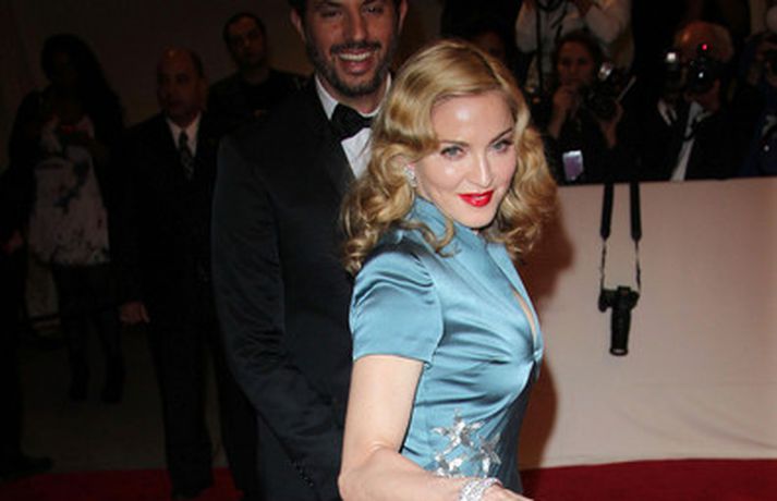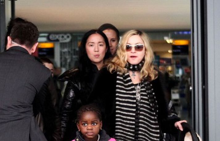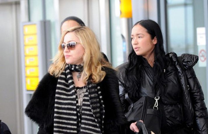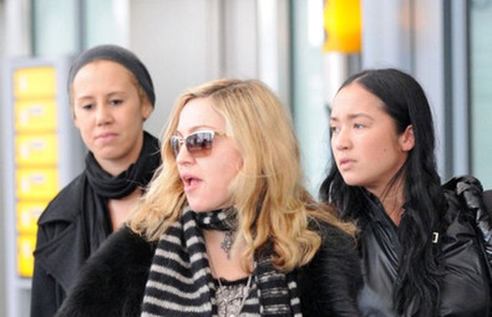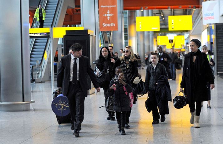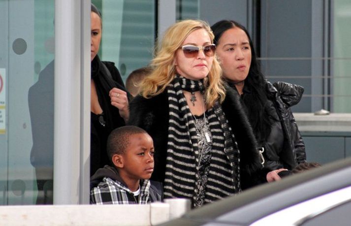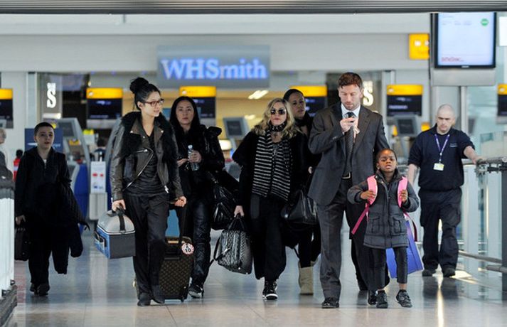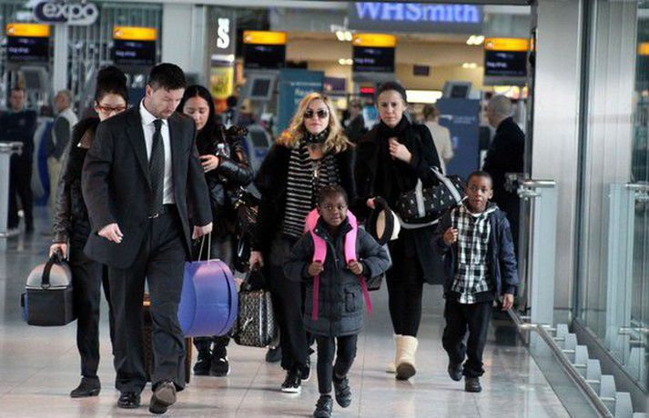 Eins og myndirnar sýna var Madonna, 52 ára, klædd í ljósbláan Stellu McCartney síðkjól og Sergio Rossi skó í New York á dögunum, stórglæsileg að vanda. Þá má sjá söngkonuna hjóla um götur New York borgar og með börnum sínum, Rocco John, 11 ára, David Banda Ritchie, 6 ára og Mercy, 5 ára, á Heathrow flugvellinum.