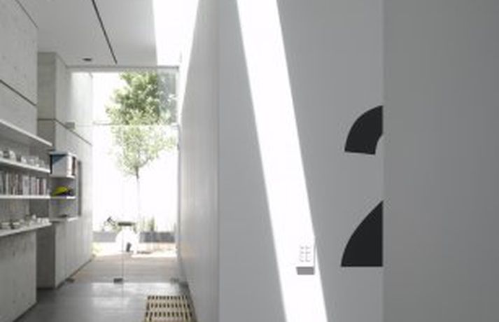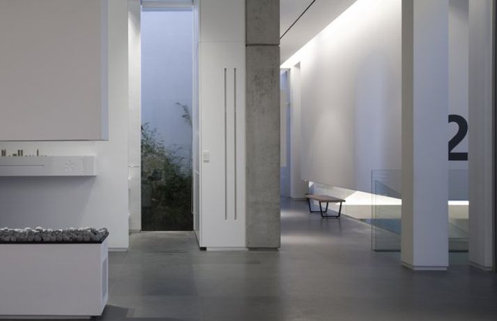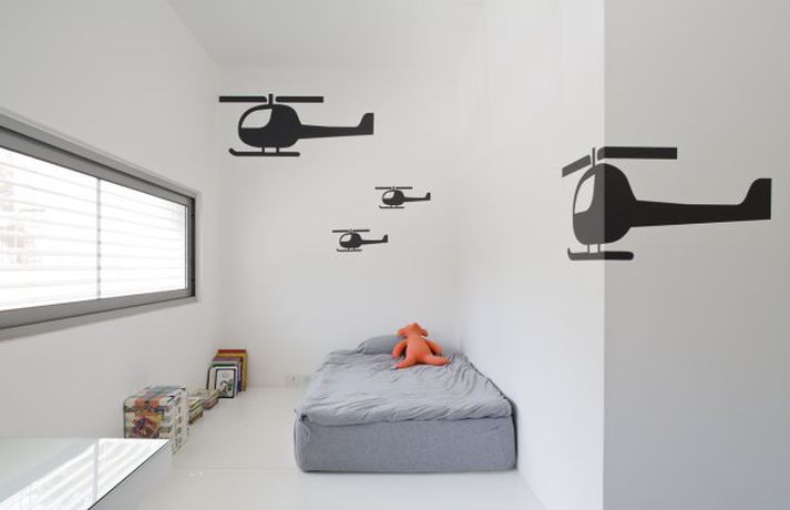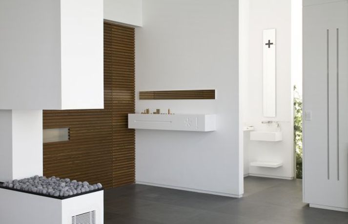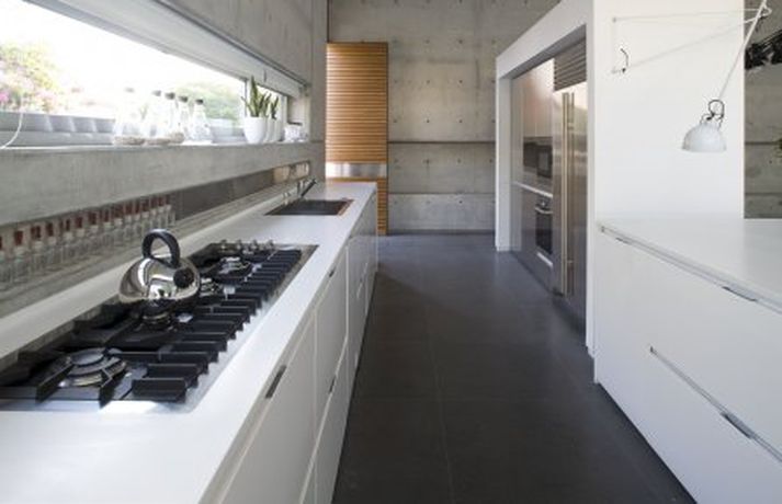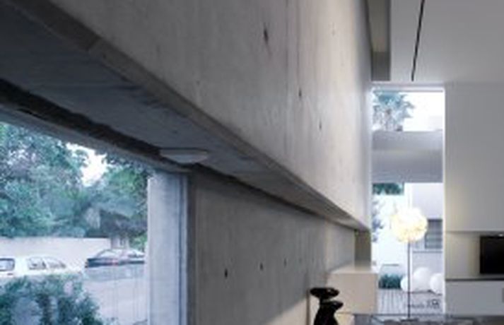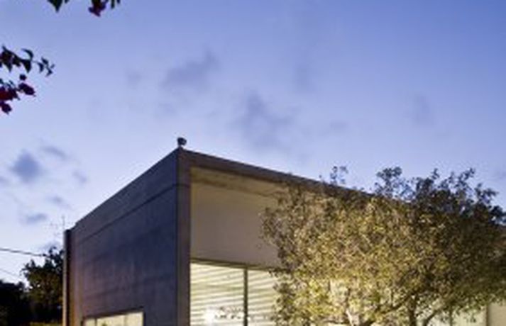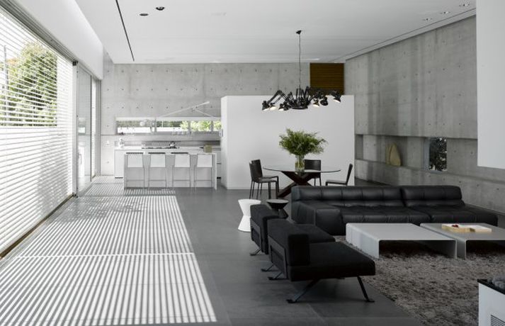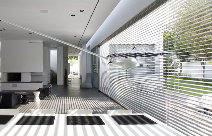 Þetta mínímalíska 500 fermetra 6 herbergja einbýlishús var byggt fyrir fjölskyldu í Tel Aviv í Ísrael fyrir tveimum árum. Það var arkítektinn Axelrod sem hannaði þetta nútímalega töffarahús sem hann kallar eHouse. Húsið er hannað út frá hugsjónum mínimalistans um að ekkert óþarfa skreyti eigi rétt á sér og allar hugmyndir þurfi að hafa notagildi en ekki bara fagurfræðilegan tilgang. Húsið er sjónsteypt með stórum gluggum sem hafa búnað sem gera það að verkum að hægt er að renna þeim til hliðar þannig að sú hlið sem snýr að garðinum opnast að mestu. Þannig getur stofan orðið sameiginlegur hluti af garðinu í einu opnu rými.Sumum kann að þykja mikil notkun glers og hrárrar steypu í innri rýmum hússins vera kuldaleg. Upplifunin er þó líklega önnur á þessum slóðum þar sem veðrið er oftast stöðugt og gott.