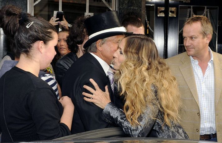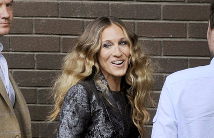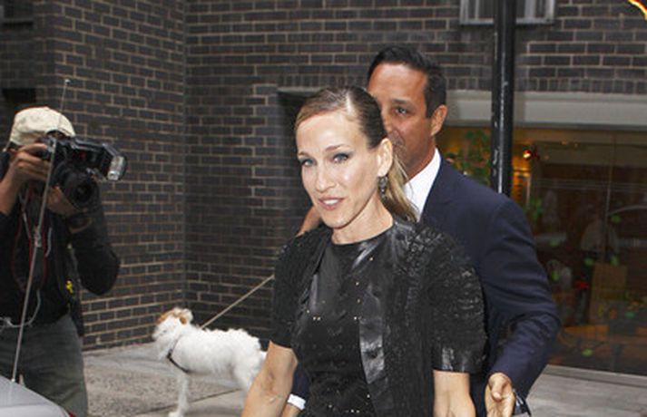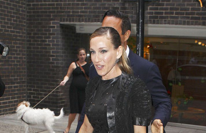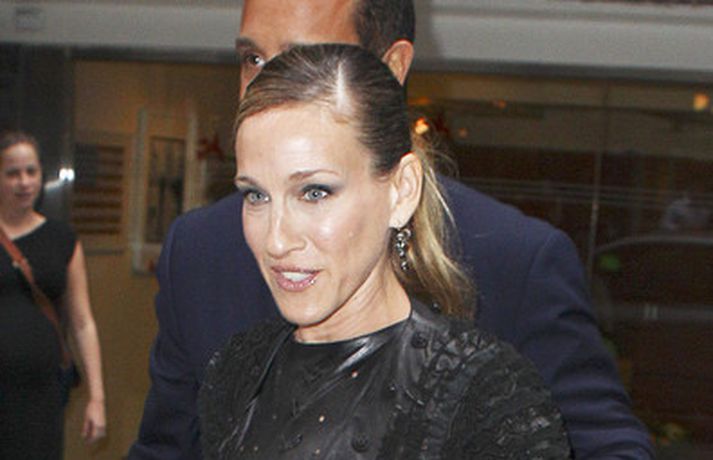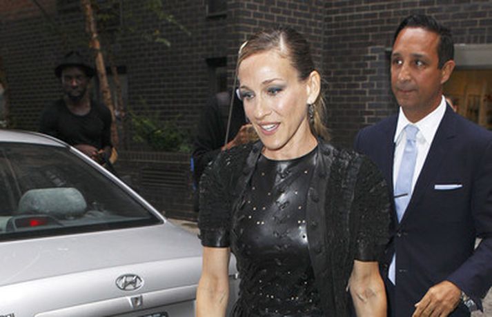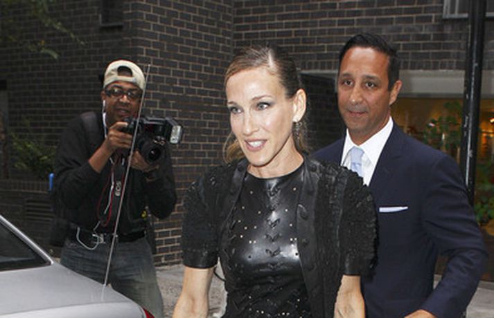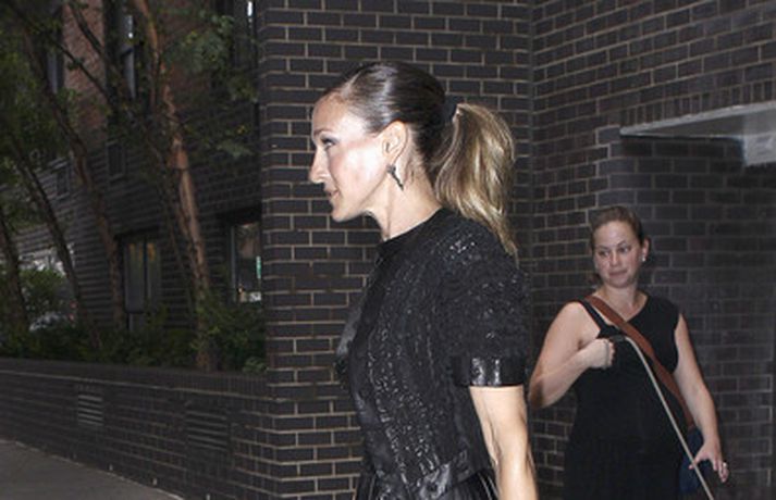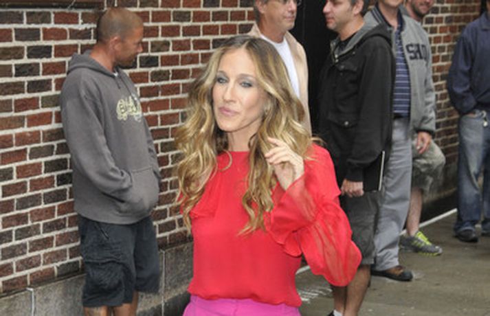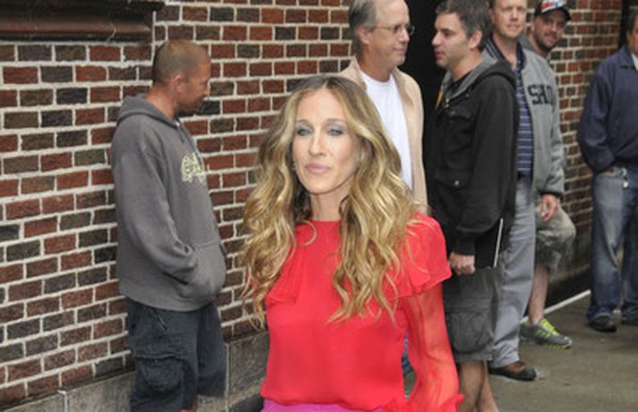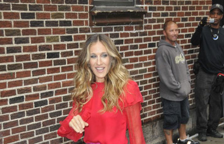 Á meðfylgjandi myndum má sjá leikkonuna Söruh Jessicu Parker, 46 ára, fyrir utan upptökuver David Letterman í fyrradag. Hún var klædd í bleikar buxur og rauða skyrtu með gegnsæjum ermum, eftir hönnuðinn Prabal Gurung - hér má skoða haustlínuna hans í ár. Sarah, sem toppaði heildarútlitið með Manolo Blahnik hælaskóm, er dugleg að kynna nýju myndina sína I Don't Know How She Does It. Þá má einnig sjá hana svartklædda með hárið tekið í tagl í myndasafni.