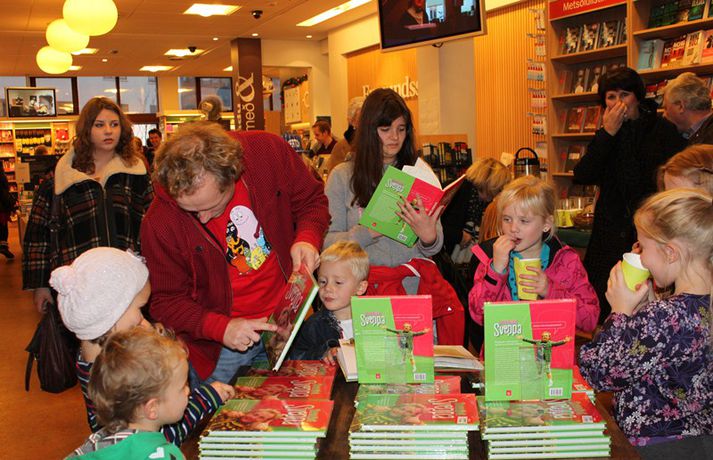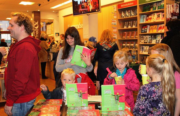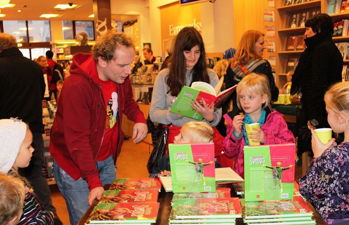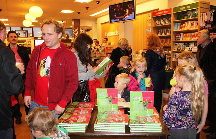 Fjöldi barna og fullorðinna mættu í Eymundsson við Skólavörðustíg í dag í tilefni af útkomu bókarinnar Skemmtibók Sveppa þar sem Sveppi hefur tekið saman alla uppáhalds leikina sína, hugmyndir að alls kyns tómstundum og dægradvöl, brandara og brellur, fyndnar örsögur, gómsætar, einfaldar uppskriftir, þrautir og ýmiss konar heilafóður. Sérstaka athygli vakti hvað Sveppi var þolinmóðir og blíður við ungu gestina sem gæddu sér á heitu súkkulaði og piparkökum á milli þess sem þeir spjölluðu við sjónvarpsstjörnuna. Ef meðfylgjandi myndir eru skoðaðar má sjá að Sveppi gerði sér lítið fyrir og skellti sér á fjórar fætur til að þurrka upp kakó sem helltist óvart niður.
