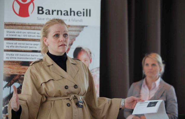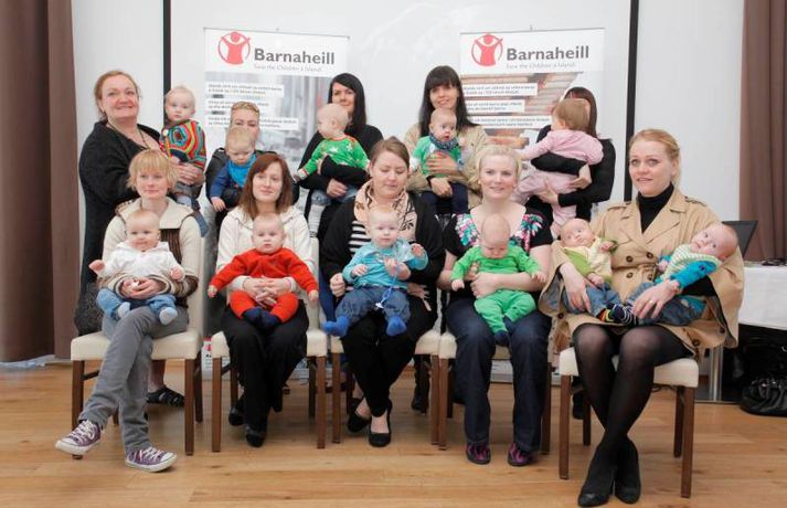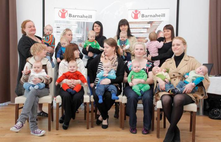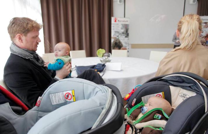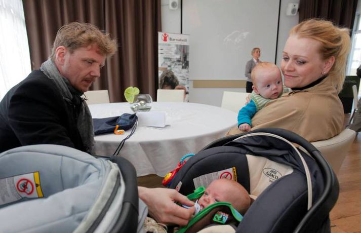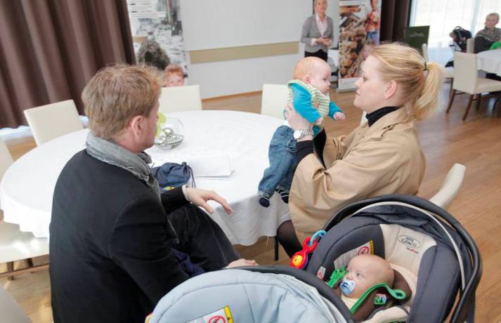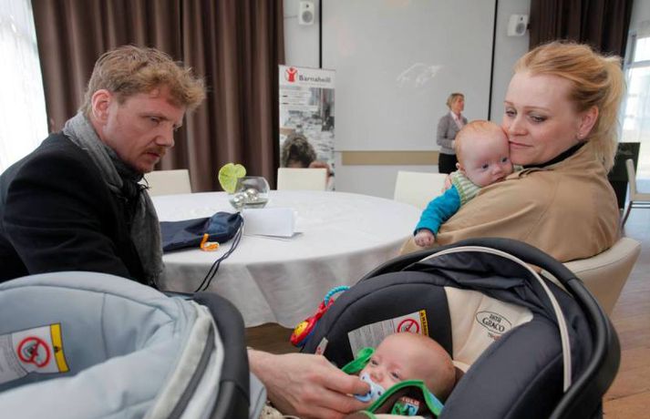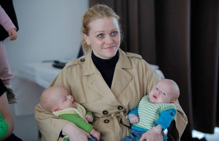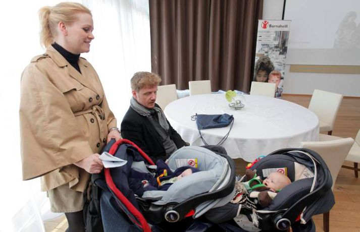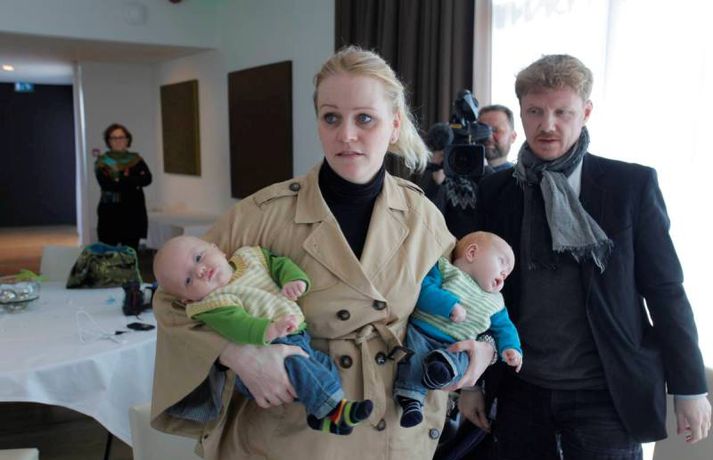 Katrín Júlíusdóttir iðnaðarráðherra og Bjarni Bjarnason eiginmaður hennar mættu með tvíburana sína, Kristófer Áka og Pétur Loga, á fund Barnaheilla - Save the Children þegar skýrsla samtakanna um stöðu mæðra í heiminum 2012 var kynnt í morgun. Skoða má Katrínu, eiginmann hennar Bjarna og tvíburana sem fæddust 23. febrúar síðastliðinn í myndasafni.
