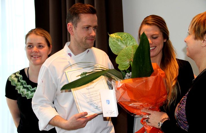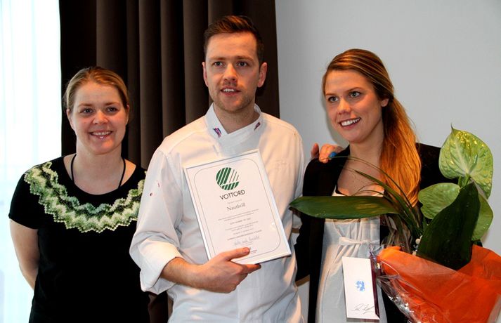 Meðfylgjandi myndir voru teknar á veitingahúsinu Nauthól í dag þegar veitingahúsið fékk afhenta umhverfisvottunina Svaninn. Veitingahúsið er það fyrsta á Íslandi sem fær slíka vottun en það þurfti að gangast undir strangt ferli og uppfylla marga þætti til að öðlast þessa eftirsóttu vottun norræna Svansmerkisins."Ferlið hefur gengið vel fyrir sig og mín tilfinning er að við munum eiga auðvelt með að framfylgja ferlum vottunarinnar í framhaldinu. Vottunin hefur mjög mikla þýðingu fyrir okkur og ekki síst þar sem Nauthóll er brautryðjandi á veitingahúsamarkaðnum á Íslandi. Það er von mín að þetta verði öðrum veiitngahúsum til eftirbreytni," sagði Guðríður María framkvæmdastjóri Nauthóls eftir að hún tók við vottuninni í dag.Nauthóll á Facebook.Svandís Svavarsdóttir umhverfis- og auðlindaráðherra afhenti Guðríði Maríu Jóhannesdóttur framkvæmdastjóra Nauthóls umhverfisvottun Svansins.Boðið var upp á kjúklingarétt og íslenskt vatn í tilefni dagsins.Mikil gleði ríkti á Nauthól í dag.