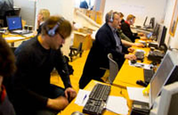 Mikil stemmning er í kosningamiðstöð Samfylkingarinnar nú þegar langt er liðið á kjördag. Frambjóðendur og stuðningsmenn slá ekki slöku við og eru að hringja í stuðningsmenn - allir sem einn. Hér að sjá nokkrar myndir sem teknar voru í kosningamiðstöðinni.Dagur sannfærir kjósendur um ágæti Samfylkingarinnar.Eva Baldursdóttir frambjóðandi nælir í atkvæði.Hallgrímur Helgason leggur hönd á plóg fyrir Samfylkinguna.Skúli Helgason niðursokkinn í vinnu.Magnús Már Guðmundsson frambjóðandi er í baráttusæti hjá Samfylkingunni.Efstu sætin leggja á ráðin.