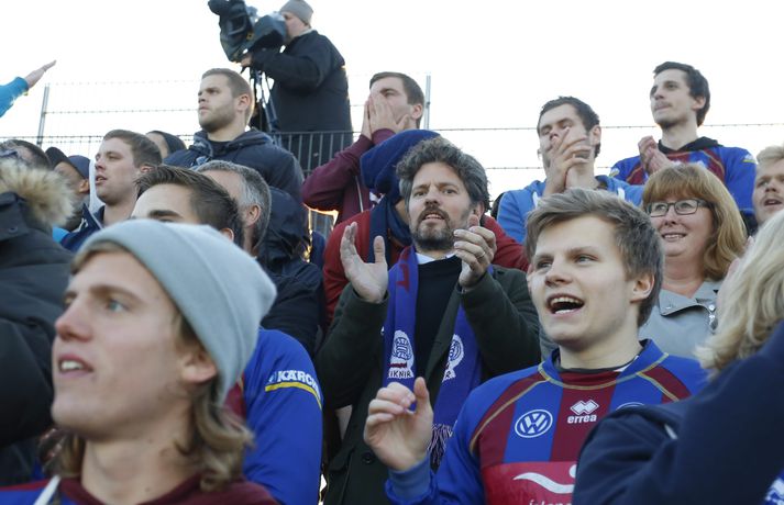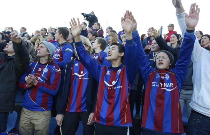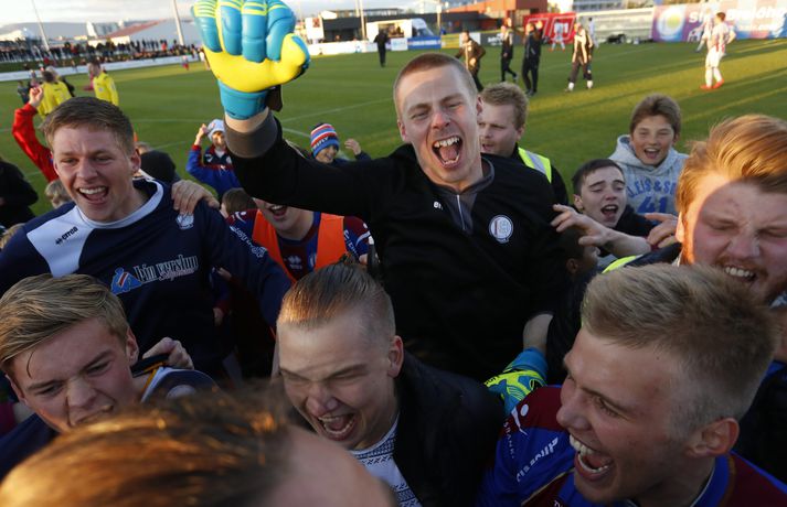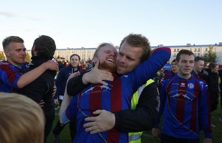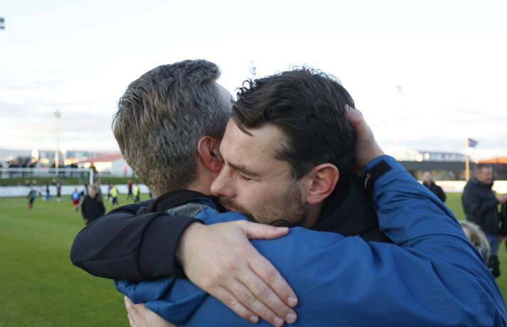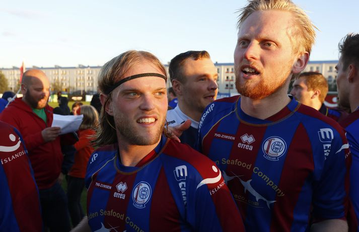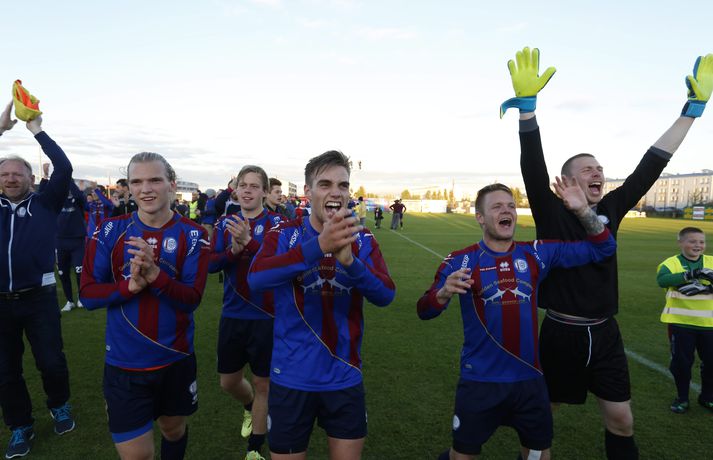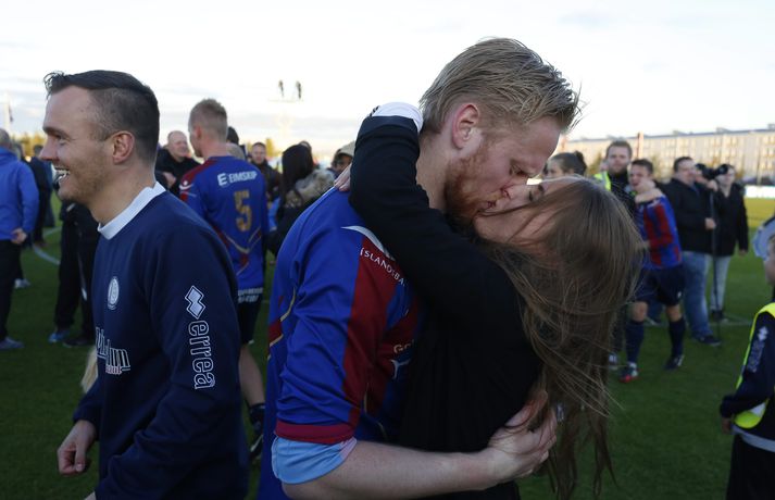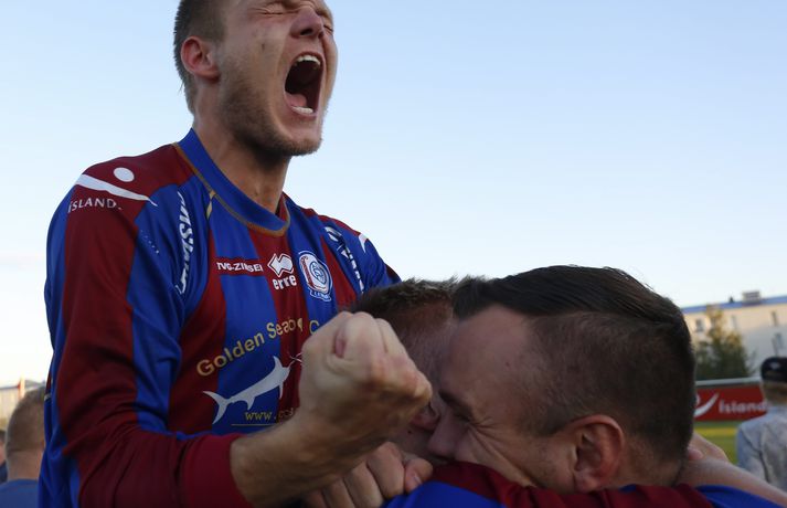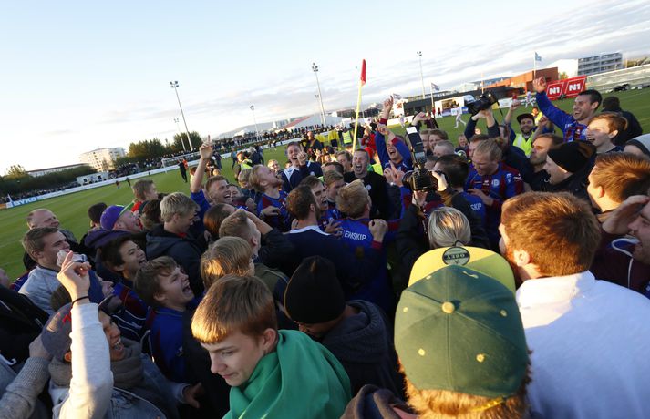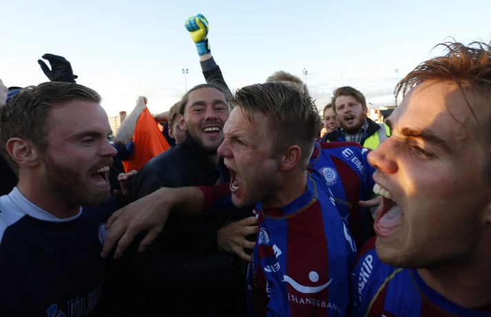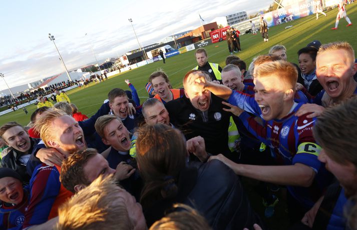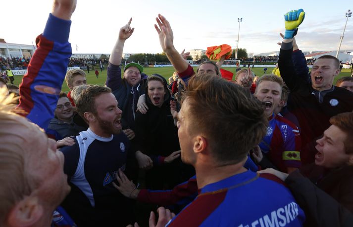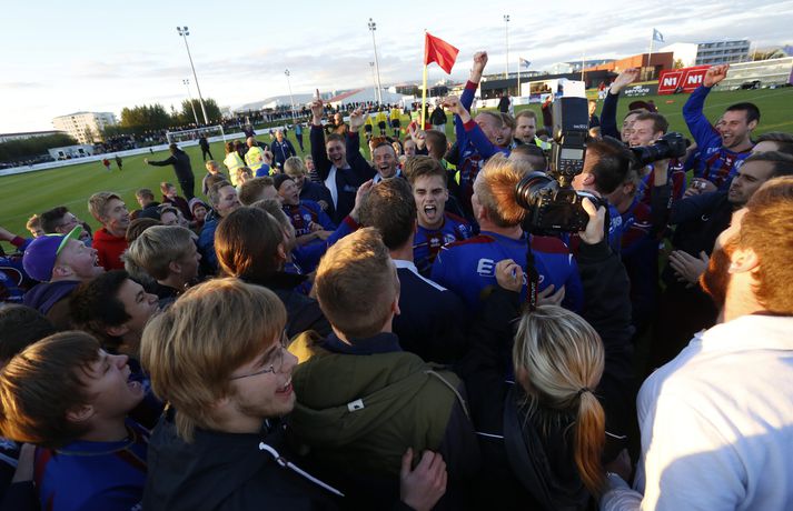 Leiknir tryggði sér sæti í Pepsí deild karla á næstu leiktíð þegar liðið lagði Þrótt 2-1 í 1. deild karla í fótbolta á Leiknisvelli í Breiðholtinu í kvöld.Valgarður Gíslason, ljósmyndari Fréttablaðsins og Vísis, fór á völlinn og smellti myndum af fagnaðarlátum Leiknismanna en myndirnar má sjá hér fyrir ofan. Það voru ósvikin fagnarlæti í Breiðholtinu þegar Þóroddur Hjaltalín dómari flautaði til leiksloka í kvöld og Leiknir tryggði sér sæti í efstu deild karla í fótbolta í fyrsta sinn. Vel var mætt á leikinn og heimamenn vel studdir í sólinni í kvöld. Fyrir leikinn í kvöld hafði Leiknir aðeins náð í tvö stig í þremur leikjum og virtist liðið eiga í örlitlum vandræðum með að taka síðasta skrefið í að tryggja sætið í Pepsí deildinni sem er búið að blasa við í nokkrar umferðir. Það tók Leikni um það bil 20 mínútur að hrista þetta stress af sér í kvöld en ekkert gekk hjá liðinu í byrjun leiks. Um leið og taugarnar róuðust náði liðið að halda boltanum betur og lék Leiknir mjög góðan fótbolta síðustu 25 mínútur fyrri hálfleiks og skoraði á þeim kafla tvö virkilega glæsileg mörk.Andri Fannar Stefánsson skoraði fyrra markið með mjög góðu skoti þegar tólf mínútur voru til hálfleiks og Hilmar Árni Halldórsson skoraði seinna markið með frábæru skoti í stöngina og inn með síðustu spyrnu fyrri hálfleiks. Leiknir sýndi þá þann leik sem liðið hefur gert í 1. deildinni í vetur og verðuskuldar liðið svo sannarlega sætið í Pepsí deildinni. Liðið er með marga mjög frambærilega leikmenn í sínu liði jafnt í vörn og sókn. Leiknir var 2-0 yfir í hálfleik og héldu margir að úrslitin væru ráðin en Þróttarar eru þekktir fyrir allt annað en að gefast upp og minnkuðu muninn snemma í seinni hálfleik. Þá lokaði Leiknir vörninni og fékk Þróttur ekki gott færi aftur fyrr en á síðasta andartaki leiksins en gestunum var ekki ætlað að skemma sigurgleðina hjá heimamönnum og Eiríkur Ingi Magnússon náði að henda sér fyrir boltann og tryggja að endingu sigurinn. Leiknir er enn á toppi deildarinnar, nú með 44 stig í 20 leikjum og með tveimur stigum meira en ÍA sem einnig er búið að tryggja sér sæti í Pepsí deildinni að ári. Þróttur er í fjórða sæti með 31 stig. Freyr: Félagið var tæknilega gjaldþrotaFreyr Alexandersson, annar þjálfari Leiknis, var gríðarlega sáttur í leikslok.Vísir/Valgarður„Ég er aðeins að ná áttum. Tilfinningin er gríðarleg gleði og svo finn ég fyrir miklu þakklæti. Ég er svo stoltur af fólkinu hjá félaginu sem hefur verið hér í öll þessi ár og aldrei gefist upp,“ sagði Freyr Alexandersson annar þjálfari Leiknis. „Ég held að fólk átti sig ekki á því að það var reynt að þvinga okkur í leggja niður laupana hérna um 2000. Félagið var tæknilega gjaldþrota en það eru foringjar hjá félaginu sem börðust og börðust og nú eigum við í dag þetta glæsilega félagsheimili, gervigras og frábæra velli. Umgjörðin hérna er æðisleg og þetta fólk á svo mikið í þessu. Ég gleðst fyrir þeirra hönd. „Ég hafði trú á því fyrir tveim, þrem umferðum að við myndum klára þetta en aldrei kom sú tilfinning að þetta væri komið fyrr en núna,“ sagði Freyr sem sagði það skipta miklu máli að klára þetta með sigri í stað þess að treysta á úrslit í öðrum leikjum. „Það hefði verið ömurlegt. Við vildum klára þetta í Ólafsvík en svo fengum við tækifæri í kvöld til að klára þetta sjálfir með sigri. Sigurinn gefur manni svo mikla vímu. „Þetta var frábær dagur, veðrið og ætli það hafi ekki verið um 800 manns á vellinum. Fín stemning og umgjörðin upp á tíu,“ sagði Freyr sem kom stressið í sínu liði í upphafi leiks á óvart. „Þeir lugu að mér strákarnir að þeir væru pollrólegir. Þeir náðu því. Ég trúði að þeir væru með fínt spennustig en þeir voru víraðir. En svo eftir um 20 mínútur þá réðumst við á þá og vorum mjög góðir síðustu 25 í fyrri hálfleik. „Þetta var svo týpískt í seinni hálfleik með allt undir. Við byrjuðum ágætlega en svo þegar þeir skora þá lokuðum við þessu niður og náðum í þessi stig,“ sagði Freyr sem segir leikmenn vera búna að vinna fyrir tækifærinu í Pepsí deildinni að ári. „Þeir eru búnir að vinna fyrir tækifærinu en höfum það hugfast að það fær enginn neitt gefins hérna þó hann sé uppalinn. Menn þurfa að hafa fyrir hlutunum. „Við förum inn í Pepsí deildina með þennan kjarna og munum eflaust bæta við okkur einhverjum styrkingum en það verður aldrei neitt til að tala um þannig séð. Við verðum að halda í okkar. „Það er þessi kjarni, gæðin í klúbbnum og þessi samheldni. Um leið og ég tek það frá þeim þá erum við ekki neitt,“ sagði Freyr að lokum. Ólafur Hrannar: Þetta er fullkominn dagurLeikmenn Leiknis fögnuðu gríðarlega í leikslok.Vísir/Valgarður„Það eru engin orð sem lýsa þessari tilfinningu, þetta er bara snilld. Þetta er fullkominn dagur. Við gátum ekki hugsað okkur betri dag til að klára þetta. Á heimavelli, fyrir framan allt fólkið okkar og klára þetta með sigri,“ sagði Ólafur Hrannar Kristjánsson fyrirliði Leiknis. „Þeir komu aðeins aðeins öðruvísi skipulagðir inn í leikinn en við bjuggumst við en við vorum fljótir að aðlagast því og jú vissulega smá skrekkur en við komum okkur í gírinn og fórum að spila okkar bolta. Þá náðum við að klára þetta,“ sagði Ólafur sem lagði upp bæði mörk Leiknis í kvöld. „Andri kom með slummu og það vita allir hversu góður Hilmar Árni er. Hann hefur skorað ófá svona frábær mörk og hann á eftir að skora fleiri. „Það hefur stundum verið eins og