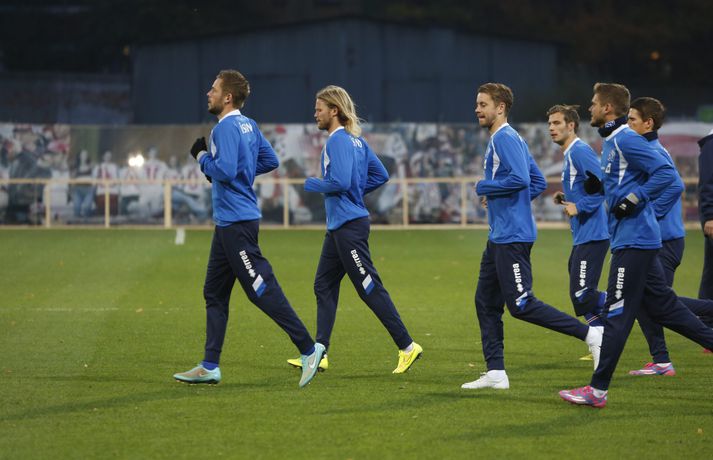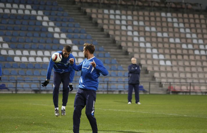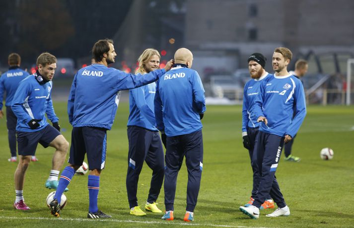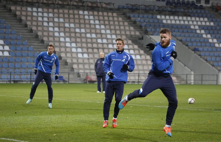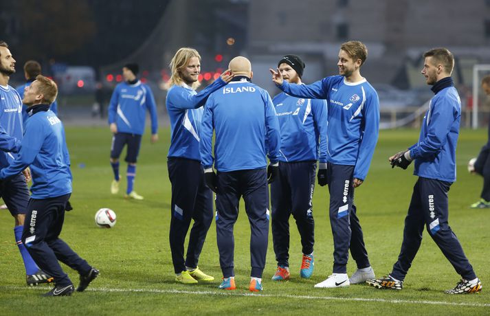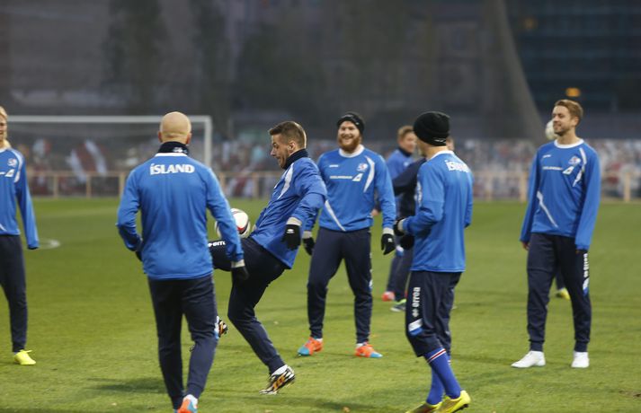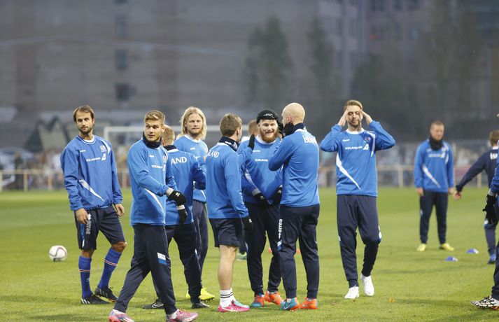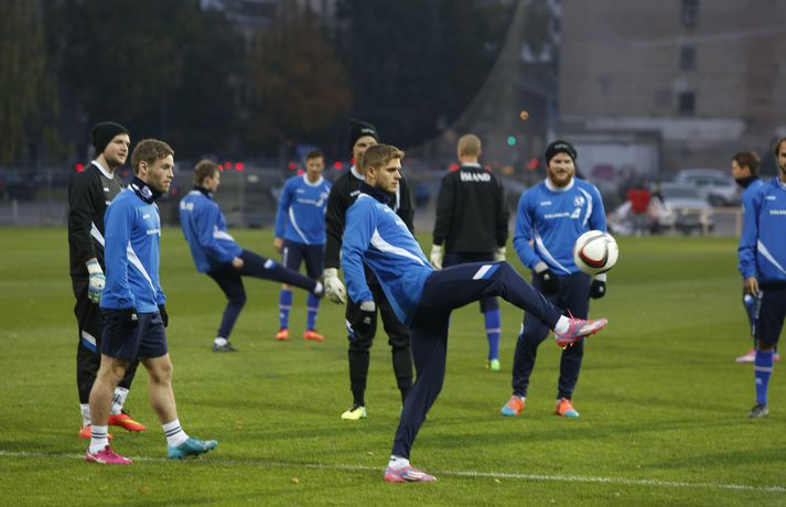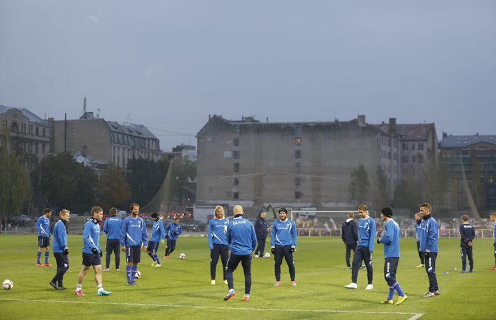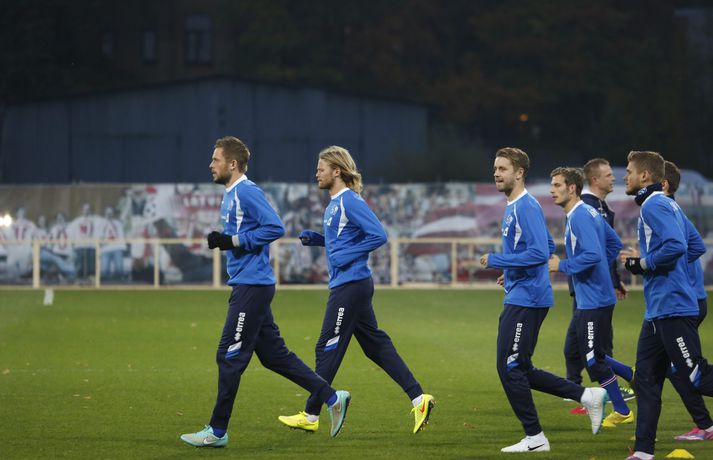 Strákarnir okkar í karlalandsliðinu í fótbolta æfðu á Skonto-vellinum í Ríga í Lettlandi í dag þar sem þeir mæta svo heimamönnum í mikilvægum leik í undankeppni EM 2016 á föstudagskvöldið. Það var létt yfir strákunum á æfingunni, en KolbeinnSigþórsson gat ekki verið með vegna smávægilegra hnémeiðsla. Hann verður þó klár fyrir leikinn á föstudaginn. Ísland vann Tyrkland, 3-0, í fyrstu umferð undankeppninnar á sama tíma og Lettland gerði markalaust jafntefli við Kasakstan. Heimamenn eru skipulagðir og erfiðir að brjóta á bak aftur.Valgarður Gíslason, ljósmyndari Fréttablaðsins og Vísis, er í Ríga og tók myndirnar sem sjá má í syrpunni hér að neðan á æfingunni í dag.