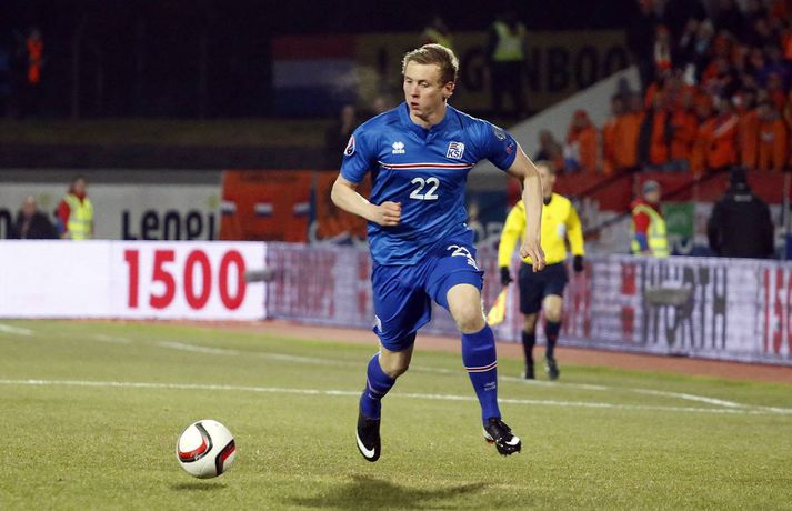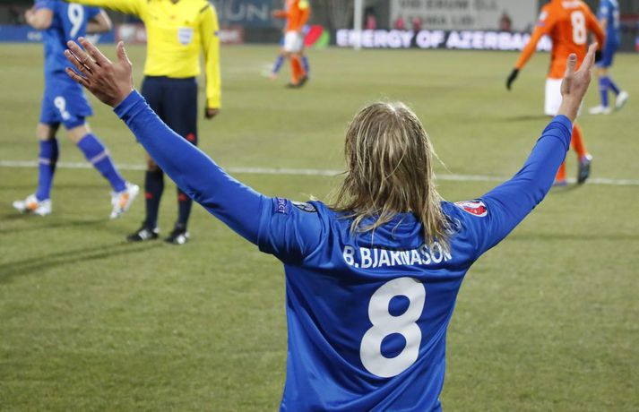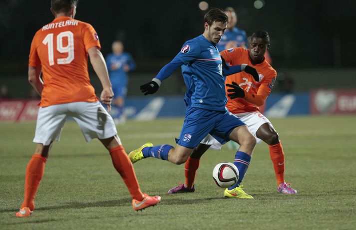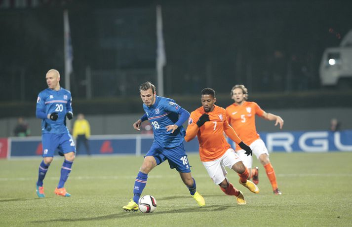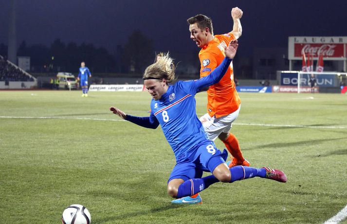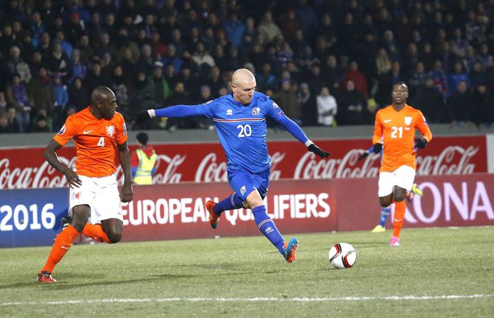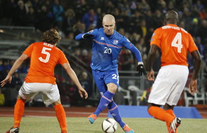 Birkir Bjarna: Var Robben að spila? Birkir Bjarnason fiskaði vítaspyrnuna sem Gylfi Þór Sigurðsson skoraði úr á 10. mínútu. Hann var skiljanlega sáttur eftir sigurinn gegn Hollandi. 13. október 2014 22:14