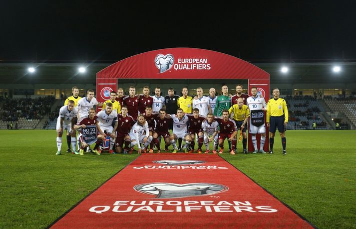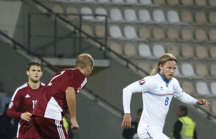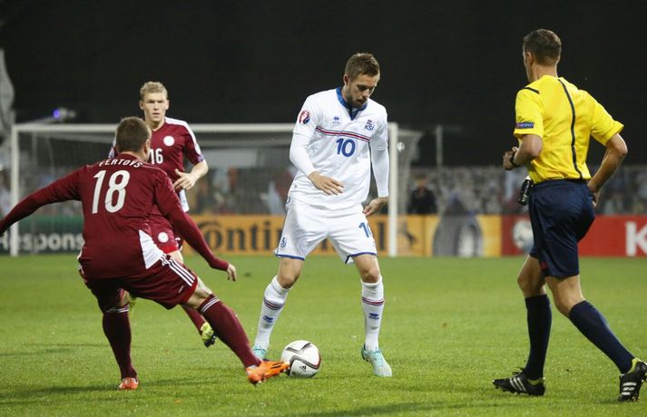 Íslenska karlalandsliðið í fótbolta vann sannfærandi 3-0 sigur á Lettum í Lettlandi í kvöld í undankeppni EM 2016. Fyrsta markið kom ekki fyrr en eftir 67 mínútur en yfirburðir íslenska liðsins voru miklir allan tímann. Þetta er í fyrsta sinn í sögu íslenska karlalandsliðsins þar sem liðið vinnur tvo fyrstu leiki sína í undankeppni og liðið er á toppi riðilsins á undan Tékkum og Hollendingum. Gylfi Þór Sigurðsson braut ísinn með frábæru marki og Aron Einar Gunnarsson og varamaðurinn Rúrik Gíslason bætti síðan við mörkum eftir að íslenska liðið varð manni fleiri. Íslenska liðið sýndi mikla þolinmæði á móti varnarsinnuðu liði heimamanna og gaf ekki færi á sér. Liðið spilaði skynsamlega og hélt boltanum vel. Tveir flottir leikir að baki og nú bíða Hollendingar á mánudaginn. Íslenska liðið er þar með með sex stig og markatöluna 6-0 eftir tvo fyrstu leiki undankeppninnar. Liðið er með jafnmörg stig og Tékkar en hefur betri markatölu. Frekari umfjöllun og viðtöl koma inn á Vísi seinna í kvöld.Gylfi Þór Sigurðsson.Vísir/Valli