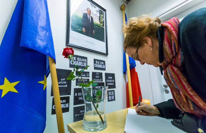 Um 300 manns mættu á samstöðufund fyrir utan franska sendiráðið í kvöld, til minningar þeirra tólf sem féllu í árásunum í París í gær. Fólk lagði blóm og kerti við fánana í sendiráðsgarðinum og flutti sendiherra Frakka, Philippe O‘Quin, stutt ávarp. Þá gátu þeir sem vildu ritað nafn sitt í minningarbók sem lá frammi í sendiráðinu. Í myndaalbúminu hér fyrir neðan má sjá myndir frá fundinum, en þær tók Vilhelm Gunnarsson ljósmyndari. Innlegg frá Franska sendiráðið á Íslandi | Ambassade de France en Islande. Innlegg frá Franska sendiráðið á Íslandi | Ambassade de France en Islande. Innlegg frá Franska sendiráðið á Íslandi | Ambassade de France en Islande. Innlegg frá Franska sendiráðið á Íslandi | Ambassade de France en Islande.