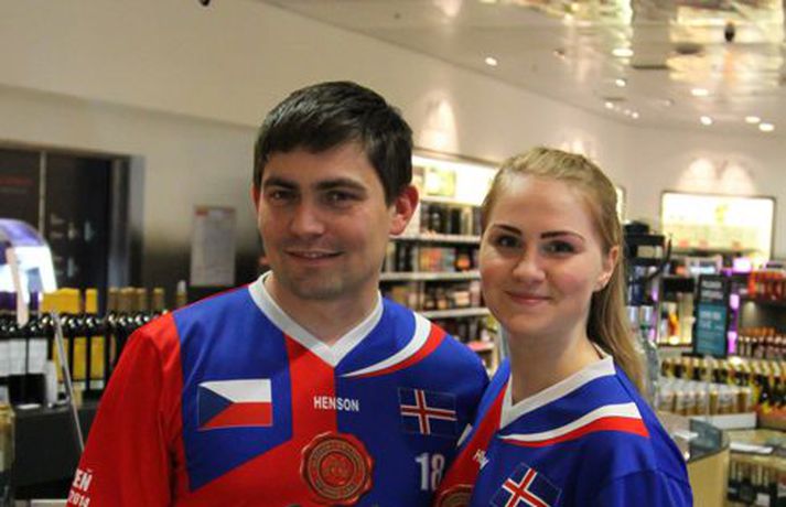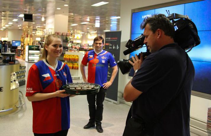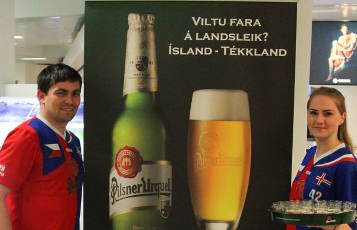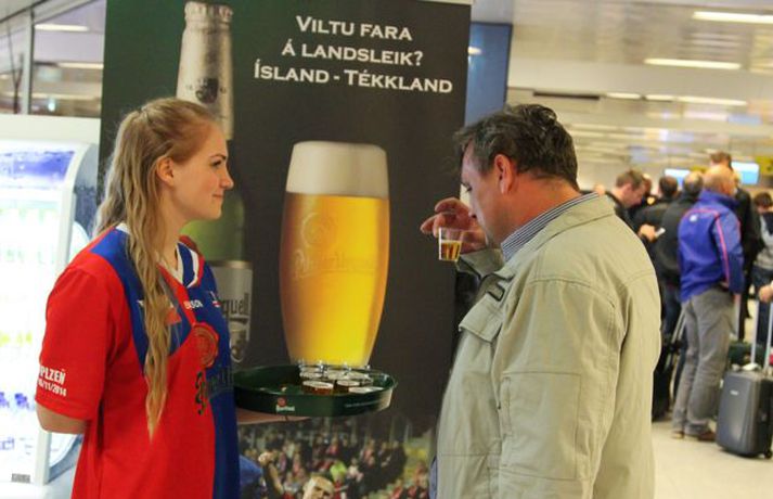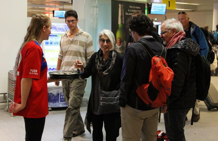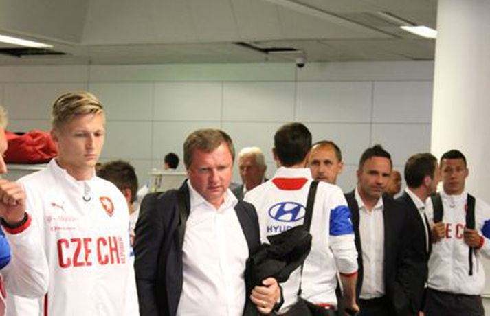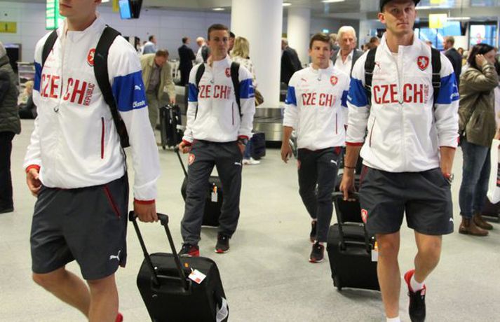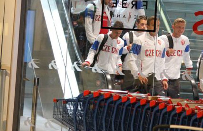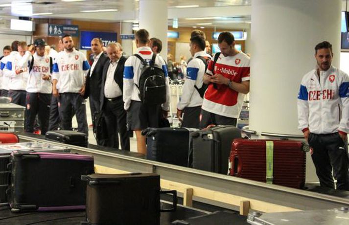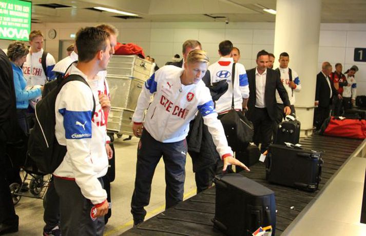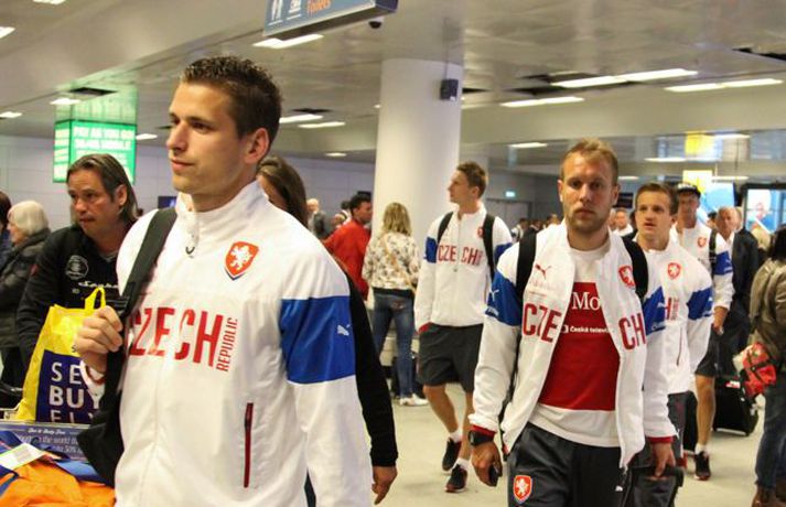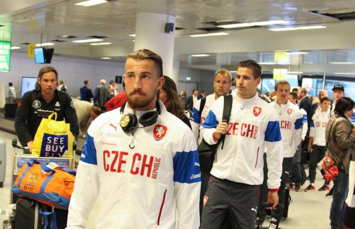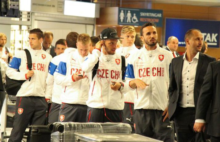 Leikmenn tékkneska landsliðsins í knattspyrnu lentu á Keflavíkurflugvelli í dag. Framundan er toppslagur í riðli okkar Íslendinga í undankeppni Evrópumótsins 2016. Tvær fullar flugvélar af stuðningsmönnum Tékkanna fylgdu leikmönnum liðsins á klakann. Umboðsmaður tékkneska bjórsins Pilsner Urquell ákvað að taka á móti gestunum í fríhöfninni með afbragðs tékkneskum bjór. Stuðningsmennirnir tóku drykknum kunnuglega fagnandi en það kom fæstum á óvart að leikmenn, með fullan huga við leikinn á föstudag, afþökkuðu pent. Vakti athygli að sumir Tékkanna voru klædddir stuttbuxum en þeir hafa mögulega ekki frétt af seinkun sumarsins á Íslandi. Myndir frá komu Tékkanna má sjá í myndasyrpunni hér að neðan. Ómar Vilhelmsson tók myndirnar.Leikmenn Tékka í Leifsstöð í dag.Mynd/Ómar Vilhelmsson