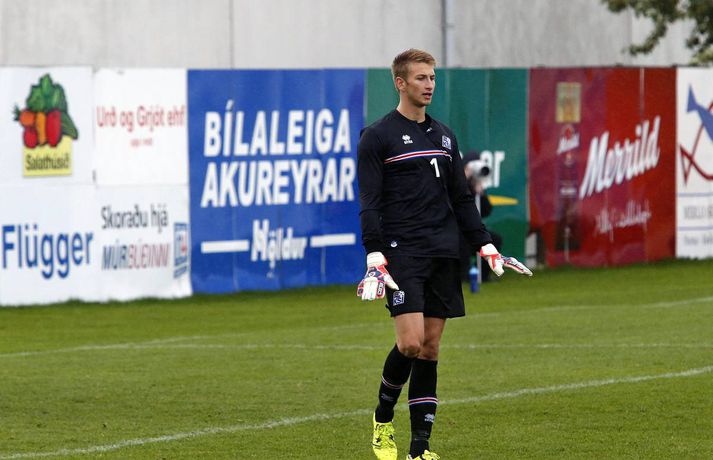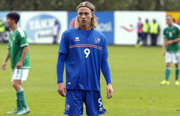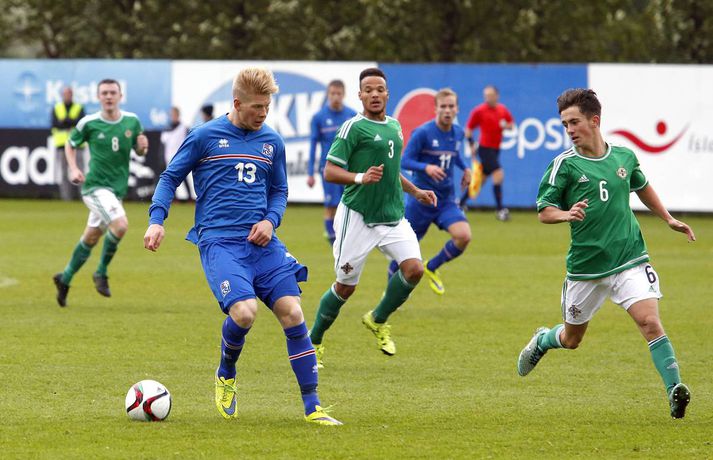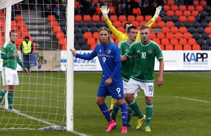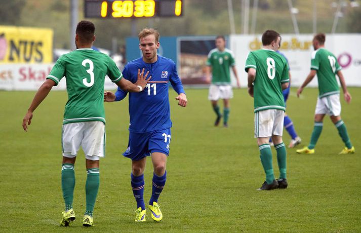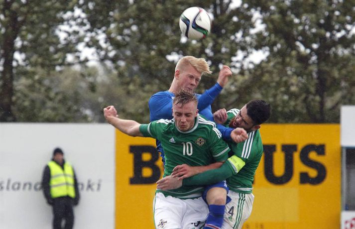 Umfjöllun, viðtöl og myndir: Ísland U21 - Norður-Írland U21 1-1 | Sjáðu mörkin Kristinn Páll Teitsson á Fylkisvelli skrifar 8. september 2015 19:30 vísir/stefán Íslenska landsliðið skipað leikmönnum undir 21 árs aldri nældi aðeins í eitt stig í 1-1 jafntefli gegn Norður-Írlandi á Fylkisvelli í kvöld.Stefán Karlsson, ljósmyndari Fréttablaðsins og Vísis, var á vellinum og tók myndirnar sem fylgja fréttinni. Íslenska liðið hafði undirtökin í leiknum en gekk illa að skapa sér marktækifæri í erfiðum aðstæðum. Ísland sat í toppsæti riðilsins með fullt hús stiga eftir tvo leiki á meðan Norður-Írland var stigalaust eftir tap gegn Skotlandi. Hefur íslenska liðið farið vel af stað en liðið fylgdi eftir 3-0 sigri á Makedóníu með 3-2 sigri á Frakklandi á laugardaginn. Norður-Írarnir fengu sannkallaða draumabyrjun en þeir komust yfir þegar rúmlega mínúta var búin af fyrri hálfleik. Skallaði þá Ryan Johnson hornspyrnu Darren McKnight í netið af stuttu færi, óverjandi fyrir Frederik Schram í marki íslenska liðsins. Eftir markið færði norður-írska liðið sig aftar á völlinn og íslenska liðið náði tökum á leiknum. Kom eina ógn Norður-Íranna úr hornspyrnum en annars buðu leikmenn liðsins ekki upp á mikla sóknartilburði. Elías Már Ómarsson fékk góð færi í fyrri hálfeik, annað þegar hann komst framhjá markmanni gestanna og reyndi skot af 25 metra færi í autt netið þrátt fyrir að vera með Aron Elís Þrándarson með sér í betri stöðu. Þá fékk Elías fínt færi þegar hann reyndi skot úr þröngu færi en Brennan Conor varði vel og örfáum sekúndum síðar var hreinsað á línu eftir góða fyrirgjöf Elíasar. Aron Elís náði að jafna metin átta mínútum fyrir lok fyrri hálfleiks með laglegu skoti. Vann hann boltann á vallarhelmingi Norður-Íranna, keyrði inn að vítateig og setti boltann í fjærhornið framhjá Conor í markinu. Lúmskt skot en verðskuldað jöfnunarmark eftir að íslenska liðið hafði ógnað töluvert undir lok fyrri hálfleiks. Stuttu síðar var flautað til hálfleiks en í seinni hálfleik var meira jafnræði með liðunum. Virtist það ekki henta íslenska liðinu betur að spila með vindinn í bakið. Norður-Írarnir sátu aftarlega á vellinum og beittu skyndisóknum sem sköpuðu nokkur álitleg færi. Fékk Mikhail Kennedy það besta er hann komst inn fyrir vörn íslenska liðsins og reyndi skot úr þröngu færi sem Frederik náði að verja í horn. Íslenska liðinu tókst illa að skapa sér færi í seinni hálfleik en hættulegustu tilraun seinni hálfleiks átti Elías Már er skot hans fyrir utan vítateiginn fór hárfínt framhjá. Reyndu þeir að færa sig framar á völlinn síðustu tíu mínútur leiksins eftir sóknarsinnaðar skiptingar en þrátt fyrir það tókst liðinu ekki að skapa sér almennileg færi og lauk leiknum með 1-1 jafntefli. Fyrir fram voru leikirnir við Norður-Írland taldir auðveldustu leikirnir og má því líta á þetta sem tvö töpuð stig fyrir íslenska liðið í von um sæti á EM í Póllandi. Besti maður íslenska liðsins í dag var Aron Elís en aðrir leikmenn íslenska liðsins náðu sér ekki á strik í sóknarleiknum. Varnarlína liðsins hélt vel allan leikinn en öll bestu tækifæri Norður-Íranna komu úr hornspyrnur.Oliver: Kæruleysi sem kostar okkur þrjú stig í dag „Þetta eru tvö töpuð stig, engin spurning. Það var eitthvað kæruleysi í okkur í dag sem kostar okkur þrjú stig að mínu mati,“ sagði Oliver Sigurjónsson, fyrirliði íslenska landsliðsins skipað undir 21 árs leikmönnum, eftir 1-1 jafntefli gegn Norður-Írlandi í dag. „Við börðumst ágætlega en að fá á sig mark úr föstu leikatriði á fyrstu mínútu leiksins er ekki í lagi. Ef menn eru ekki klárir frá fyrstu mínútu þá getur það bitnað á okkur undir lok leiks.“ Oliver var fúll að íslenska liðinu tókst ekki að nýta þau færi sem liðið skapaði sér í fyrri hálfleik. „Við fengum færi til þess að klára leikinn en við nýttum þau því miður ekki í dag. Íslensk lið verða að nýta sín færi til þess að safna stigum í landsleikjum. Við þurfum líka að vera fljótari að spila boltanum og taka betri ákvarðanir.“ Fannst honum gestirnir frá Norður-Írlandi komast nær því að skora sigurmarkið í seinni hálfleik. „Þeir voru búnir að leikgreina okkur vel og voru hættulegir úr föstum leikatriðum og skyndisóknum. Við áttum ekki toppleik í dag en við horfum bara fram á við eftir þetta. Stig er betra en ekkert en ég hefði viljað þrjú stig.“Eyjólfur: Slagveðrið virtist henta þeim betur „Tilfinningin er blendin, við fengum góð færri í fyrri hálfleik til að klára leikinn,“ sagði Eyjólfur Sverrisson, þjálfari íslenska U21 árs landsliðsins, svekktur eftir leikinn. „Þetta eru líklegast sanngjörn úrslit að leiknum loknum, við vorum undir í baráttunni og þetta slagveður virtist henta þeim betur. Þeir unnu flest öll einvígin inn á vellinum.“ Eyjólfur var ánægður með það hvernig leikmenn hans brugðust við marki Norður-Íranna sem kom á upphafsmínútu leiksins. „Það var ákveðið áfall fyrir okkur en við komum til baka og fengum færi. Við fengum nokkur tækifæri til að komast í 2-1 en í seinni hálfleik varð þetta bara djöflagangur allan hálfleikinn.“ Eyjólfur kunni ekki skýringu á því afhverju leikur liðsins hrundi í seinni hálfleik en hann sagði aðstæðurnar hafa haft mikil áhrif. „Það jafn erfitt að spila undan vindi og gegn vindi en þetta voru erfiðar aðstæður, þungur og blautur völlur og mikið rok. Þeir höfðu betur í baráttunni en við héldum haus og lokuðum á flestar sóknir þeirra.“ Eyjólfur sagði að leikskipulag gestanna hefði ekki komið sér á óvart. „Við vor