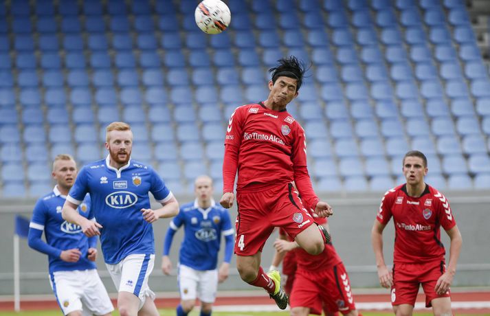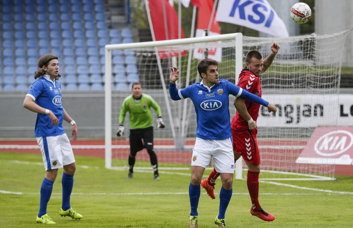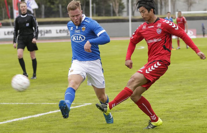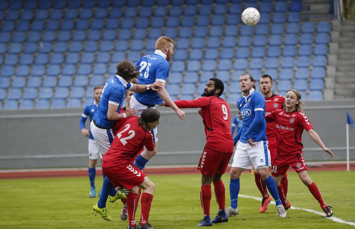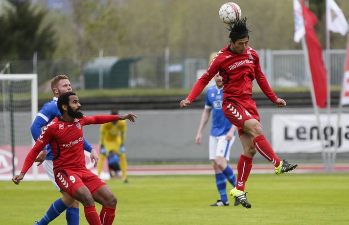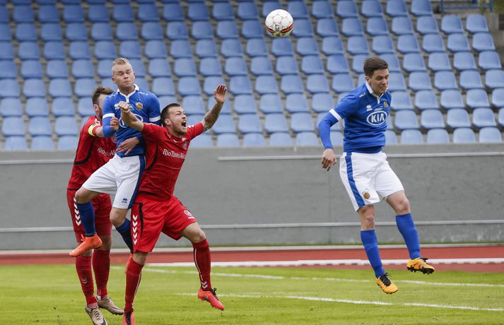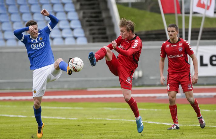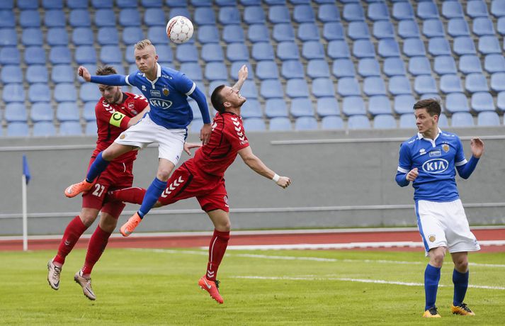 Leiknismenn eru með níu stig eftir fyrstu þrjá leikina í Inkasso-deild karla, en Leiknismenn unnu á Selfossi í dag. Fram og Haukar skildu jöfn á Laugardalsvelli. Kári Pétursson, lánsmaður frá Stjörnunni, gerði eina mark leiksins, en hann skoraði á 36. mínútu. Lokatölur 1-0. Leiknir er á toppnum með níu stig eftir þrjá leiki, en Selfoss er með þrjú stig eftir leikina þrjá. Á Laugardalsvelli skildu Fram og Haukar jöfn, 1-1. Haukarnir náðu forystunni í fyrri hálfleik, en Framarar jöfnuðu í síðari hálfleik með sínu fyrsta marki í sumar. Haukar eru með fjögur stig eftir fyrstu þrjá leikina, en Fram er með eitt. Vilhelm Gunnarsson, ljósmyndari 365, var á Laugardalsvelli í kvöld og tók meðfylgjandi myndir.Úrslit og markaskorarar kvöldsins (fengið frá urslit.net):Selfoss - Leiknir R. 0-1 0-1 Kári Pétursson (36.).Fam - Haukar 1-1 0-1 Haukur Ásberg Hilmarsson (40.), 1-1 Ivan Bubalo (65.).vísir/vilhelm