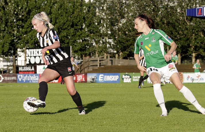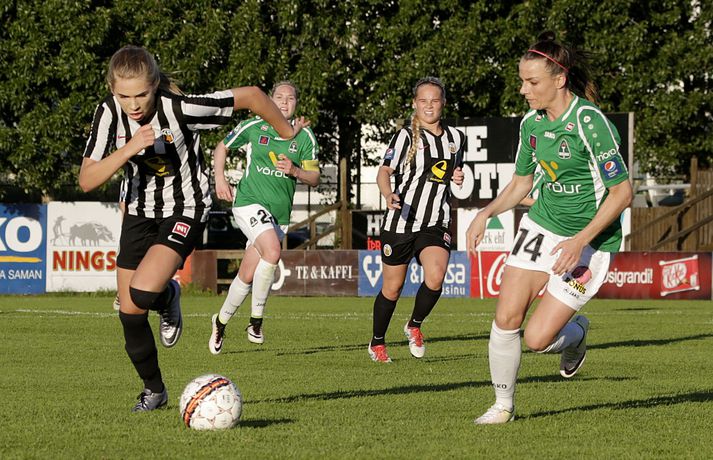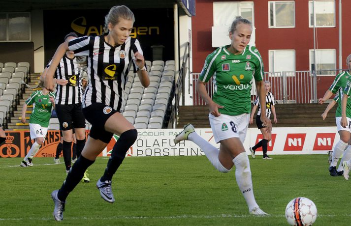 Það var blíðskaparveður á Alvogen-vellinum þegar KR tók á móti Breiðabliki í tíundu umferð Pepsi-deildar kvenna. Fyrir leik voru Kópavogsstúlkur í öðru sæti deildarinn en KR í því níunda. Leikurinn bar merki þess.Hanna K. Andrésdóttir, ljósmyndari Fréttablaðsins og Vísis, var á Alvogen-vellinum og tók meðfylgjandi myndir. Fyrir leik sagði Edda Garðarsdóttir, þjálfari KR, að liðið byrjaði með eitt stig og markmiðið væri að halda því. Það gekk allan fyrri hálfleikinn en ekki mikið lengur en það. Í upphafi síðari hálfleiksins skoraði Fjolla Shala mark með skoti úr vítateignum sem sveif yfir Ingibjörgu Valgeirsdóttur í marki KR og í netið. Síðara markið skoraði Berglind Björg Þorvaldsdóttir um miðjan síðari hálfleikinn og þar við sat.Hvers vegna vann Breiðablik? Frá fyrstu mínútu var nokkuð ljóst í hvað stefndi. Hér tók lið í botnbaráttu á móti liði í toppbaráttu og það leyndi sér ekki. Í liði Breiðabliks eru hraðar og tæknilega góðar stelpur sem voru varnarmönnum KR til trafala. Sóknarþungi Breiðabliks var mikill lengst af í leiknum án þess þó að þær hefðu skapað sér mörg dauðafæri. Nokkuð var um góð færi sem framherjar liðsins settu ekki á rammann en í raun hafði maður á tilfinningunni að það væri tímaspursmál hvenær grænklæddar myndu skora.Þessar stóðu upp úr Breiðabliksliðið sem heild átti mjög góðan dag en ef nauðsynlegt er að taka einhverjar út fyrir sviga þá er vert að minnast á Fjollu Shala og Svövu Rós Guðmundsdóttur. Fjolla vann vel á miðjunni meðan hún var inn á og skilaði af sér einu marki. Svava átti góðan dag á hægri vængnum og fór öðru hvoru illa með andstæðinga sína. Þrátt fyrir að KR hafi tapað leiknum verður að gefa liðinu hrós fyrir baráttu og varnarleik í fyrri hálfleik. Eins og áður hefur verið komið inn á stýrðu gestirnir leiknum í allan tímann en í fyrri hálfleik náðu þær lítið að skapa sér. Vörn KR-inga kom í veg fyrir að þær fengju dauðafæri og flest skot voru langskot.Hvað mátti betur fara? Breiðabliksstúlkur voru í kvöld að leika sinn þriðja leik á einni viku. Það sást aðeins á leik þeirra og þá sérstaklega í fyrri hálfleik. Úrslitasendingar og skot voru ekki alveg jafn nákvæmar og fólk á að venjast af hálfu liðsins. Margar sóknir enduðu til að mynda með skotum sem voru víðsfjarri markinu. Þegar einblínt er á varnarleikinn þá vill sóknarleikurinn oft gleymast og það var tilfellið með KR í kvöld. Þær áttu þó eina eða tvær ágætis tilraunir en of oft gerðist það að þær unnu boltann og náðu illa að létta pressunni. Slíkt er lýjandi til lengdar. Enda fór það svo að gestunum gekk betur að finna smugur á múrnum eftir því sem á leið á leikinn. Ingibjörg Valgeirsdóttir mom inn í mark KR-inga fyrir leikinn og komst reglulega í veg fyrir skot Blika. Í fyrra markinu er hins vegar spurning hvort hún hafi átt að gera betur. Staðsetning hennar var ekki eins og best verður á kosið og missti hún boltann yfir sig. Henni til varnar þá var hún á móti sólu og líklegt að það hafi haft áhrif. Ef og hefði, það er spurning hvort leikurinn hefði spilast á annan veg ef sólin hefði ekki haft áhrif og boltinn verið gripinn en ekki endað í netinu. Að endingu. Elísabet Guðmundsdóttir, þessi tækling með gult spjald á bakinu, það er ekki góð blanda. Varnarmaðurinn fékk réttilega seinna gula í uppbótartíma og fauk út af.Hvað gerist næst? Breiðablik heldur áfram að anda ofan í hálsmálið á Stjörnunni en eitt stig skilur liðin að. Kópavogsstúlkur eiga næst leiki gegn Selfossi og FH. Sé aðeins litið á töfluna ætti gott gengi liðsins því að geta haldið áfram. KR-stúlkur eru í basli. Framundan er leikur gegn Val og í kjölfarið útileikur gegn FH. Þar er á ferðinni sex stiga leikur sem Vesturbæjarliðið verður að vinna ef ekki á illa að fara. Annar slíkur verður þegar liðið mætir Selfossi tveimur umferðum síðar.Mörkin úr leiknum má sjá hér að neðan.Ásdís baráttu við Rakel Hönnudóttur í leiknum.vísir/hannaÁsdís Karen: Ætlum að halda okkur uppi „Við vissum alltaf að þær eru með mjög gott sóknar lið og hraða leikmenn. Við byrjuðum með eitt stig og ætluðum að halda því,“ sagði Ásdís Karen Halldórsdóttir í leikslok. Ásdís var valinn KR-ingur leiksins í leikslok en hún átti nokkrar ágætar rispur fram á við. „Við lágum aftarlega og þær náðu ekki að skora fyrr en með smá heppni. Þær áttu nokkuð mörg færi en við náðum að halda þessu fram í hálfleik og aðeins lengur.“ Líkt og áður hefur verið komið inn á er KR í níunda sæti og þrjú stig í liðið fyrir ofan. Liðið hefur ekki unnið í síðustu fimm leikjum og ljóst að ef gengið verður áfram svona þá mun illa fara. „Við getum klárlega haldið okkur uppi. Við eigum eftir leiki gegn liðunum í kring og getum fengið stig gegn öllum liðum. Við ætlum að halda okkur uppi,“ segir Ásdís. Hún viðurkennir þó að það sé erfitt fyrir liðið að tapa svona ítrekað. „Það er auðvitað erfitt að tapa svona og vera lengi í fallsæti en við munum berja okkur saman og halda okkur uppi.“Berglind Björg í baráttu gegn Val í síðustu vikuvísir/eyþórBerglind Björg: „Langaði að rífa mig úr að ofan“ „Guð minn góður, já. Það fóru þarna einhver þrjátíu kíló af mér og mig langaði að rífa mig úr að ofan og hlaupa um,“ sagði Berglind Björg Þorvaldsdóttir, framherji Breiðabliks, eftir 2-0 sigur Breiðabliks á KR í 10. umferð Pepsi-deildarinnar. Berglind skoraði síðara mark Breiðabliks í leiknum en hún kom til liðsins fyrir skemmstu frá Fylki. Þetta var þriðji leikur Berglindar fyrir liðið og fyrs