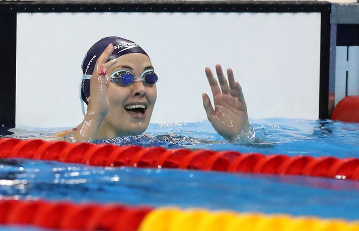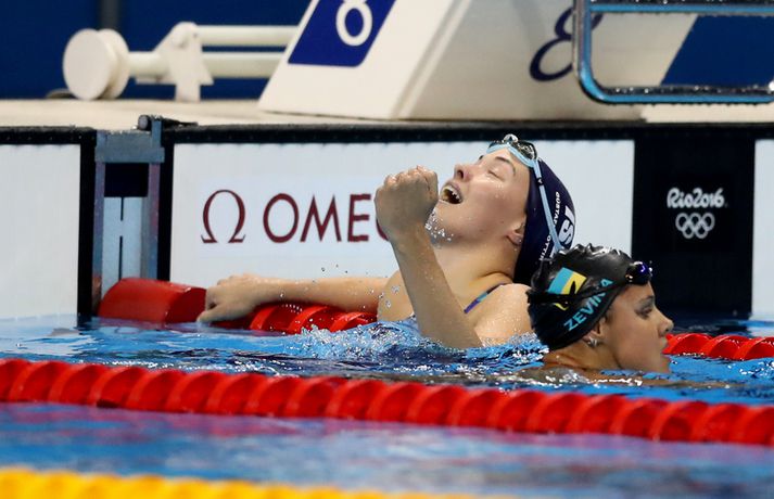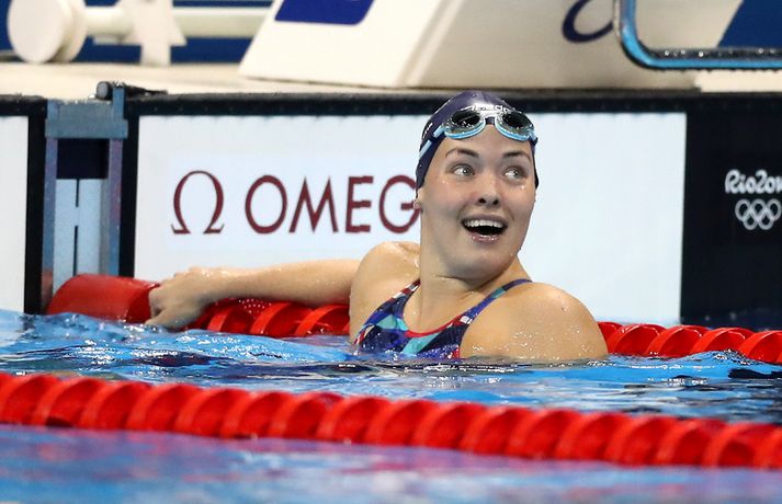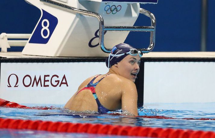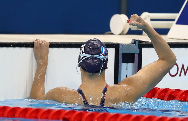 Eygló Ósk Gústafsdóttir er komin í úrslitasundið í 200 metra baksundi á Ólympíuleikunum í Ríó en hún náði sjöunda besta tímanum í undanúrslitunum í nótt.Anton Brink, ljósmyndari Vísis og Fréttablaðsins, var á sundi Eyglóar Óskar í kvöld og náði þessum flottum myndum hér fyrir ofan. Ísland hafði aldrei átt sundkonu í úrslitum fyrir þessa á Ólympíuleika en nú hafa tvær komist í átta manna úrslit á Ólympíuleikum sem risastórt skref fyrir íslenska sundið. Það var gríðarlega hart barist um sætin átta í úrslitunum. Eygló Ósk synti á 2:08.84 mínútum og setti nýtt glæsilegt Íslandsmet en gamla metið hennar var rúmlega eins árs. Það er frábært og um leið sjaldgæft að íslensk sundfólki nái að setja Íslandsmet á Ólympíuleikum. Gamla Íslandsmetið hennar var 2:09,04 mínútur. Þetta var ekki bara Íslandsmet heldur einnig Norðurlandamet. Eygló Ósk og Hrafnhildur Lúthersdóttir komust því báðar í úrslitasund á þessum Ólympíuleikum en Hrafnhildur varð í sjötta sæti í 100 metra bringusundi á mánudaginn. Hrafnhildur fylgdi því eftir með því að ná 11. sæti í 200 metra bringusundinu. Eygló Ósk var með tólfta besta tímann í undanrásunum og náði því að hækka sig um fimm sæti sem er frábær árangur. Katinka Hosszú frá Ungverjalandi var með besta tímann en hún er á eftir sínum fjórðu gullverðlaunum á leikunum í Ríó. Bandaríski Ólympíumeistarinn og heimsmethafinn, Missy Franklin, ver ekki gullið sitt því hún komst ekki í úrslitasundið. Eygló Ósk syndir úrslitasundið klukkan 22.03 annað kvöld en klukkan verður þá orðin eitt að nóttu að íslenskum tíma.Tweets by @VisirSport Eygló Ósk Gústafsdóttir fagnar eftir frábært sund sitt.Vísir/Anton