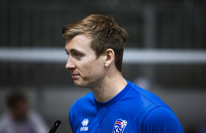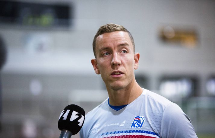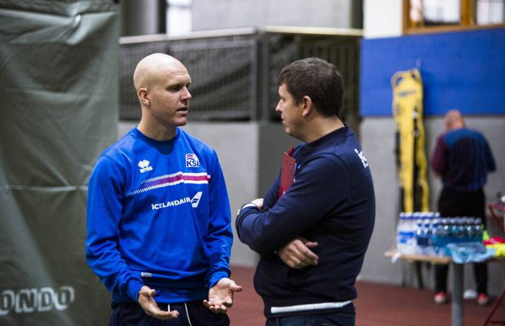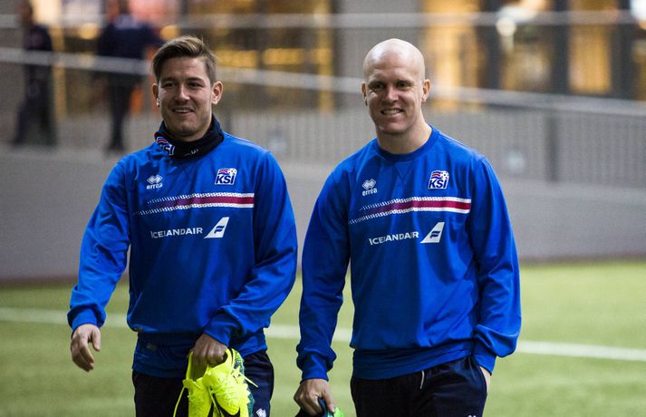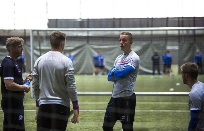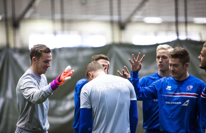 Þeir leikmenn íslenska landsliðsins í fótbolta sem spiluðu ekki gegn Finnlandi í 3-2 sigrinum á Laugardalsvelli í gærkvöldi voru mættir á æfingu í Egilshöll í morgun. Æfingin átti upphaflega að fara fram á Laugardalsveli en vegna veðurs var hún færð inn eins og var gert á mánudagskvöldið. Það var eðlilega létt yfir mannskapnum enda fyrsti sigurinn í undankeppninni kominn og þrjú stig í hús í erfiðum leik. Íslenska liðið hefur ekki tapað í mótsleik á heimavelli í níuleikjum í röð eða síðan strákanir töpuðu fyrir Slóveníu í júní 2013. Egilshöllin er vanalega þétt setin og margir um hituna þegar kemur að því að fá tíma. Landsliðið tók tíma af Borgarholtsskóla í morgun og fékk annan vallarhelminginn. Þar voru atvinnumenn á ferð en á hinum vallarhelmingnum voru áhugamenn í bumbubolta. Ernir Eyjólfsson, ljósmyndari Fréttablaðsins og Vísis, var í Egilshöll í morgun og tók myndir á æfingunni en á einni þeirra má sjá atvinnu- og landsliðsmennina æfa fyrir stórleik í undankeppni HM 2018 öðru megin og áhugamenn leika sér í bumbubolta hinum megin.