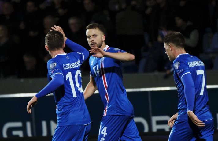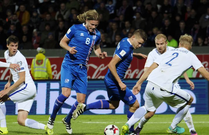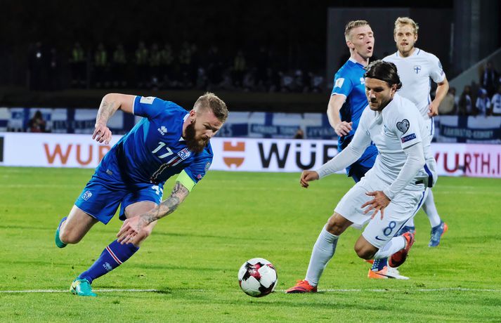 Íslenska landsliðið heimti sigur úr heljargreipum á ótrúlegan hátt gegn Finnum í undankeppni fyrir HM 2018 á Laugardalsvellinum. Finnar komust í tvígang yfir en Ísland skoraði tvö mörk í blálokin sem tryggði stigin þrjú. Það var Ragnar Sigurðsson tryggði Íslendingum stigin þrjú á 94. mínútu. Sigurmarkið var vægast sagt umdeilt og fæst væntanlega aldrei úr því skorið hvort það var löglegt eða ekki. Íslendingar voru mun sterkari aðilinn í leiknum en sofandaháttur í vörninni hefði getað reynst okkar mönnum dýrkeyptur. Finnar komust yfir með marki á 20. Þegar Teemu Pukki skallaði boltann í netið nokkuð gegn gangi leiksins. Kári Árnason svaraði á 37. mínútu með skalla eftir hornspyrnu. Finnar svöru þó jafnharðan og skoruðu aðeins tveimur mínútum síðar. Íslendingar sóttu nær án afláts í seinni hálfleik og uppskáru jöfnunarmark á 90. Mínútu þegar Alfreð Finnbogason skoraði. Strákarnir okkar þrýstu gríðarlega á Finnska landslið og uppskáru mark að lokum. Ragnar skoraði sigurmarkið af harðfylgi en það var sem áður segir afar umdeilt. Ótrúleg endurkoma Íslenska landsliðsins því staðreynd og dýrmæt þrjú stig kominn í hús en mörkin í leiknum má sjá í spilaranum hér að neðan.Sofandaháttur í vörninni Íslensku strákarnir hófu leik að krafti og á fyrstu tíu mínútunum var liðið nærri því komið yfir. Strax á 2. mínútu átti Jóhann Berg Guðmundsson bylmingsskot af löngu færi sem smaug framhjá stönginni. Kári Árnason og Björn Bergmann Sigurðason fengu í sameiningu öllu hættulegra færi á elleftu mínútu þegar sá síðarnefndi, í sínum fyrsta landsleik frá árinu 2011, stal færinu af Kára eftir hornspyrnu frá hægri. Þeir félagar voru einir á auðum sjó í markteignum en líklega hefur Björn Bergmann ekki séð Kára sem var í betra færi. Íslendingar voru meira með boltann í fyrri hálfleik en gekk illa að skapa sér færi. Uppspil liðsins var í hægari kantinum og fimm manna varnarlína Finna með þrjá miðverði í fararbroddi glímdi vel við framherjapar okkar, þá Alfreð Finnbogason og Björn Bergmann. Ljóst var að strákarnir okkar söknuðu Kolbeins og Jóns Daða í fremstu víglínu en Alfreð og Birni gekk illa í slagsmálunum við miðverði Finna. Finnum óx ásmegin um miðbik hálfleiksins og nýttu þeir sér sofandahátt í vörn Íslands þegar Teemu Pukki skallað boltann í netið óáreittur umkringdur varnarmönnum Íslands. Finnar höfðu sótt frá vinstri og opnað vörn Íslands í tvígang áður en að þeir færðu boltann til hægri þaðan sem stoðsendingin kom. Svo virtist sem að varnarlína Íslands hafi alfarið gleymt að fylgjast með Puukki. Heimir brást við með því að færa kantmenn okkar, þá Birki Bjarnason og Jóhann Berg um kanta. Strákar sóttu stíft að marki Finna en ógnuðu þó nánast eingöngu með langskotum, svo þéttur var varnarmúr Finna. Ísinn brotnaði þó á 37. mínútu þegar Kári Árnason skallaði hornspyrnu Jóhanns Berg í autt markið eftir skógarhlaup finnska markmannsins. Við þetta bjuggust flestir við að Ísland myndi taka öll völd á vellinum en Finnar létu markið ekki á sig fá og svöruðu nánast strax. Einhver svefnsýki virðist hafa gripið um sig í varnarlínu Íslands í fyrri hálfleik en seinna mark Finna kom á 39. mínútu þegar Robin Lod fékk umtalsvert fleiri sekúndur til að athafna sig fyrir framan mark Íslendinga en boðlegt er á þessu stigi knattspyrnunnar. Misheppnað skot hans tók út varnarlínu Íslands og við það fékk Lod annað tækifæri. Hann lét ekki bjóða sér það þrisvar og smellti boltanum í markhornið á snyrtilegan hátt. Staðan var 1-2 í hálfleik og þrátt fyrir að Ísland hafi heilt yfir sterkari aðilinn var það klaufagangir í vörninni sem gerði það að verkum að Ísland var undir í hálfleik.Ótrúleg dramatík í uppbótartímaÞað blés þó byrlega í upphafi seinni hálfleiks þegar Kári Árnason fiskaði vítaspyrnu á 49. mínútu. Sá meðbyr endist þó ekki lengi, á punktinn fór Gylfi Sigurðsson og á einhvern ótrúlegan hátt tókst honum ekki að skora. Víti hans fór í innanverða slánna, þaðan í bak markvarðarins og af honum stefndi boltinn í netið. Það segir þó ýmislegt um gang leiksins að Finnar voru mun ákveðnari í að ná frákastinu og tókst markmanninn að henda sér aftur og blaka boltanum frá marki undir mikilli pressu. Gylfi var aftur á ferðinni á 56. mínútu þegar þegar skot hans fyrir utan teig söng í utanverðri stönginni. Allt leit út fyrir að boltinn vildi hreinlega ekki í netið. Strákarnir okkar sýndu þó gríðarlegan karakter og hættu ekki. Uppskáru þeir tvö mörk í uppbótartíma. Það fyrra skoraði Alfreð Finnbogason eftir frábæra sendingu Gylfa. Öll von um sigur virtist úti en okkar menn héldu nú ekki og skoruðu afar umdeild mark í síðustu sókn sinni í leiknum á 94. mínútu. Ragnar Sigurðsson náði einhvern veginn að ýta boltanum í átt að marki aðþrengdur eftir að Kári fleytti spyrnu Ara Freys að marki. Finnski markvörðurinn varði á línunni og svo kom Alfreð og táaði boltann úr lúkum hans yfir línuna. Allt ætlaði um koll að keyra en sá norski dæmdi mark. Afar mikilvægur sigur því staðreynd og en Ísland situr nú í öðru sæti riðilsins á eftir Króatíu á markatölu. Bæði lið eru með fjögur stig en Króatar rótburstuðu Kósovó í kvöld. Framundan er leikur gegn Tyrklandi hér heima en þeir gerðu jafntefli gegn Úkraínu á heimavelli. Þrátt fyrir að mikið megi laga í leik Íslands er ljóst að þessi sigur mun gefa strákunum okkar mikið í framhaldinu.