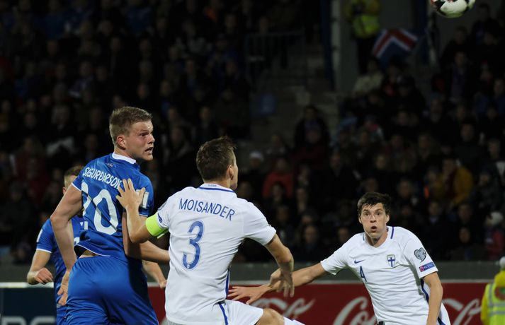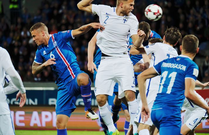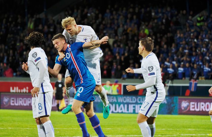 Umfjöllun og myndir: Ísland - Finnland 3-2 | Stórkostleg endurkoma í uppbótartíma í Laugardalnum Tryggvi Páll Tryggvason skrifar 6. október 2016 20:45 Ragnar Sigurðsson skallar að marki. Skömmu síðar lá boltinn í netinu. Vísir/anton Íslenska landsliðið heimti sigur úr heljargreipum á ótrúlegan hátt gegn Finnum í undankeppni fyrir HM 2018 á Laugardalsvellinum. Finnar komust í tvígang yfir en Ísland skoraði tvö mörk í blálokin sem tryggði stigin þrjú. Það var Ragnar Sigurðsson tryggði Íslendingum stigin þrjú á 94. mínútu. Sigurmarkið var vægast sagt umdeilt og fæst væntanlega aldrei úr því skorið hvort það var löglegt eða ekki. Íslendingar voru mun sterkari aðilinn í leiknum en sofandaháttur í vörninni hefði getað reynst okkar mönnum dýrkeyptur. Finnar komust yfir með marki á 20. Þegar Teemu Pukki skallaði boltann í netið nokkuð gegn gangi leiksins. Kári Árnason svaraði á 37. mínútu með skalla eftir hornspyrnu. Finnar svöru þó jafnharðan og skoruðu aðeins tveimur mínútum síðar. Íslendingar sóttu nær án afláts í seinni hálfleik og uppskáru jöfnunarmark á 90. Mínútu þegar Alfreð Finnbogason skoraði. Strákarnir okkar þrýstu gríðarlega á Finnska landslið og uppskáru mark að lokum. Ragnar skoraði sigurmarkið af harðfylgi en það var sem áður segir afar umdeilt. Ótrúleg endurkoma Íslenska landsliðsins því staðreynd og dýrmæt þrjú stig kominn í hús en mörkin í leiknum má sjá í spilaranum hér að neðan.Sofandaháttur í vörninni Íslensku strákarnir hófu leik að krafti og á fyrstu tíu mínútunum var liðið nærri því komið yfir. Strax á 2. mínútu átti Jóhann Berg Guðmundsson bylmingsskot af löngu færi sem smaug framhjá stönginni. Kári Árnason og Björn Bergmann Sigurðason fengu í sameiningu öllu hættulegra færi á elleftu mínútu þegar sá síðarnefndi, í sínum fyrsta landsleik frá árinu 2011, stal færinu af Kára eftir hornspyrnu frá hægri. Þeir félagar voru einir á auðum sjó í markteignum en líklega hefur Björn Bergmann ekki séð Kára sem var í betra færi. Íslendingar voru meira með boltann í fyrri hálfleik en gekk illa að skapa sér færi. Uppspil liðsins var í hægari kantinum og fimm manna varnarlína Finna með þrjá miðverði í fararbroddi glímdi vel við framherjapar okkar, þá Alfreð Finnbogason og Björn Bergmann. Ljóst var að strákarnir okkar söknuðu Kolbeins og Jóns Daða í fremstu víglínu en Alfreð og Birni gekk illa í slagsmálunum við miðverði Finna. Finnum óx ásmegin um miðbik hálfleiksins og nýttu þeir sér sofandahátt í vörn Íslands þegar Teemu Pukki skallað boltann í netið óáreittur umkringdur varnarmönnum Íslands. Finnar höfðu sótt frá vinstri og opnað vörn Íslands í tvígang áður en að þeir færðu boltann til hægri þaðan sem stoðsendingin kom. Svo virtist sem að varnarlína Íslands hafi alfarið gleymt að fylgjast með Puukki. Heimir brást við með því að færa kantmenn okkar, þá Birki Bjarnason og Jóhann Berg um kanta. Strákar sóttu stíft að marki Finna en ógnuðu þó nánast eingöngu með langskotum, svo þéttur var varnarmúr Finna. Ísinn brotnaði þó á 37. mínútu þegar Kári Árnason skallaði hornspyrnu Jóhanns Berg í autt markið eftir skógarhlaup finnska markmannsins. Við þetta bjuggust flestir við að Ísland myndi taka öll völd á vellinum en Finnar létu markið ekki á sig fá og svöruðu nánast strax. Einhver svefnsýki virðist hafa gripið um sig í varnarlínu Íslands í fyrri hálfleik en seinna mark Finna kom á 39. mínútu þegar Robin Lod fékk umtalsvert fleiri sekúndur til að athafna sig fyrir framan mark Íslendinga en boðlegt er á þessu stigi knattspyrnunnar. Misheppnað skot hans tók út varnarlínu Íslands og við það fékk Lod annað tækifæri. Hann lét ekki bjóða sér það þrisvar og smellti boltanum í markhornið á snyrtilegan hátt. Staðan var 1-2 í hálfleik og þrátt fyrir að Ísland hafi heilt yfir sterkari aðilinn var það klaufagangir í vörninni sem gerði það að verkum að Ísland var undir í hálfleik.Ótrúleg dramatík í uppbótartímaÞað blés þó byrlega í upphafi seinni hálfleiks þegar Kári Árnason fiskaði vítaspyrnu á 49. mínútu. Sá meðbyr endist þó ekki lengi, á punktinn fór Gylfi Sigurðsson og á einhvern ótrúlegan hátt tókst honum ekki að skora. Víti hans fór í innanverða slánna, þaðan í bak markvarðarins og af honum stefndi boltinn í netið. Það segir þó ýmislegt um gang leiksins að Finnar voru mun ákveðnari í að ná frákastinu og tókst markmanninn að henda sér aftur og blaka boltanum frá marki undir mikilli pressu. Gylfi var aftur á ferðinni á 56. mínútu þegar þegar skot hans fyrir utan teig söng í utanverðri stönginni. Allt leit út fyrir að boltinn vildi hreinlega ekki í netið. Strákarnir okkar sýndu þó gríðarlegan karakter og hættu ekki. Uppskáru þeir tvö mörk í uppbótartíma. Það fyrra skoraði Alfreð Finnbogason eftir frábæra sendingu Gylfa. Öll von um sigur virtist úti en okkar menn héldu nú ekki og skoruðu afar umdeild mark í síðustu sókn sinni í leiknum á 94. mínútu. Ragnar Sigurðsson náði einhvern veginn að ýta boltanum í átt að marki aðþrengdur eftir að Kári fleytti spyrnu Ara Freys að marki. Finnski markvörðurinn varði á línunni og svo kom Alfreð og táaði boltann úr lúkum hans yfir línuna. Allt ætlaði um koll að keyra en sá norski dæmdi mark. Afar mikilvægur sigur því staðreynd og en Ísland situr nú í öðru sæti riðilsins á eftir Króatíu á markatölu. Bæði lið eru með fjögur stig en Króatar rótburstuðu Kósovó í kvöld. Framundan er leikur gegn Tyrklandi hér heima en þeir gerðu jafntefli gegn Úkraínu á heimavelli. Þrátt fyrir að mikið megi laga í