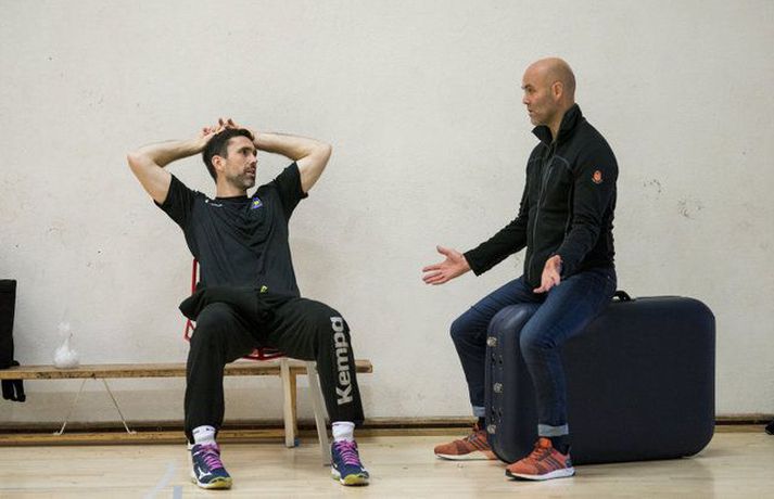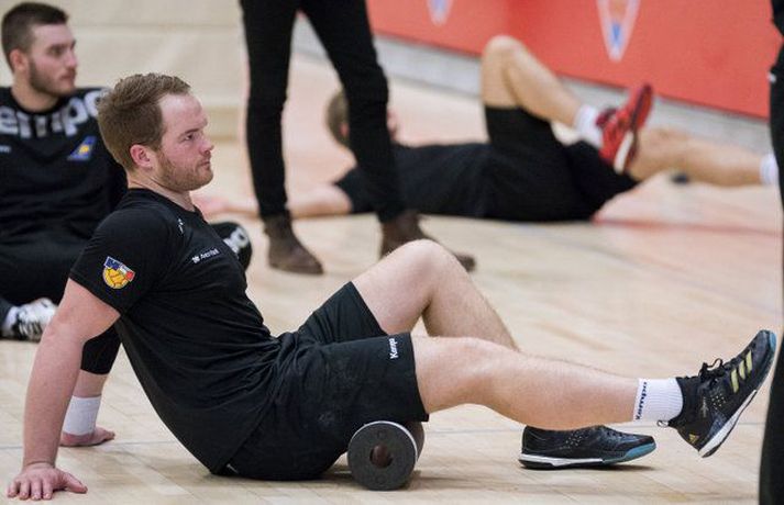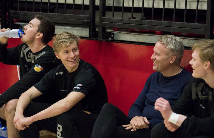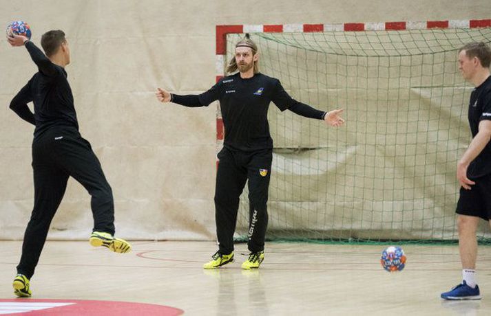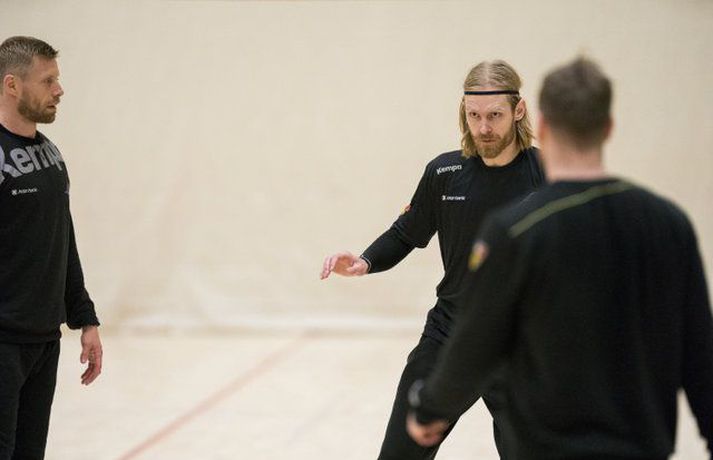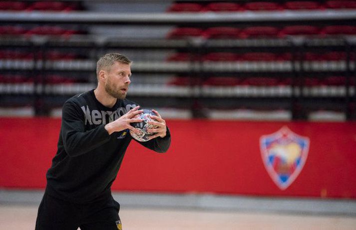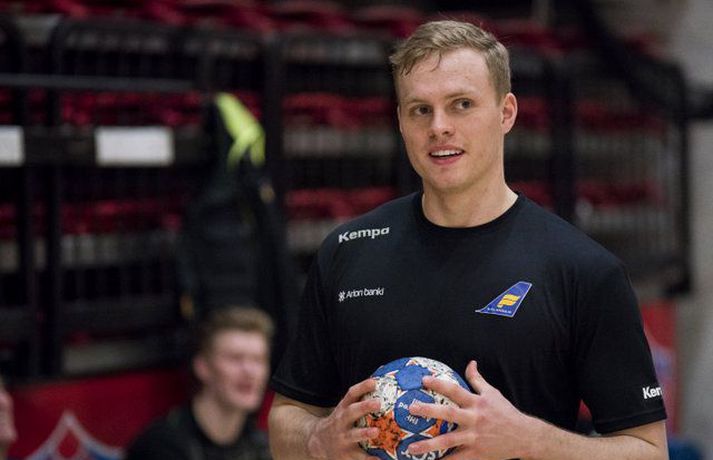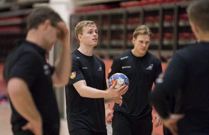 Ásgeir Örn Hallgrímsson segir líklegt að hann geti tekið þátt í vináttulandsleikjunum gegn Svíum í Laugardalshöllinni. Sá fyrri fer fram annað kvöld og sá síðari á laugardaginn. Ásgeir Örn hefur glímt við meiðsli í upphafi tímabils og lítið komið við sögu hjá sínu félagsliði, Nimes í Frakklandi. Hann segist þó vera á batavegi. „Staðan er þokkaleg. Þetta er búið að vera frekar hægt haust en ég er allur að koma til. Núna er þetta allt á uppleið,“ sagði Ásgeir Örn sem hefur verið meiddur mjöðm síðan í lok ágúst. Aðspurður sagðist Ásgeir Örn vera bjartsýnn á að geta spilað allavega annan leikinn gegn Svíum. Ásgeir Örn, sem er 33 ára, er næstelsti leikmaðurinn í íslenska hópnum sem er mjög ungur að þessu sinni.„Þetta eru ungir og ferskir strákar. Þetta er vissulega nýtt og öðruvísi. Það felast nýjar áskoranir í því. En maður saknar auðvitað gömlu vinanna,“ sagði Ásgeir Örn sem reynir hvað hann getur til að hjálpa yngri leikmönnunum í íslenska liðinu. „Maður gerir það sem maður getur til að hjálpa þeim og gera þetta létt. Við erum allir að reyna að vinna leiki og maður reynir að miðla af reynslunni.“ Ásgeir Örn hefur leikið í Frakklandi síðan 2012, fyrstu tvö árin með Paris Saint-Germain og síðan með Nimes. „Ég gerði nýjan þriggja ára samning í fyrra þannig að ég á þetta tímabil og næsta eftir. Síðan tekur maður stöðuna. Þá verður maður orðinn 35 ára og allt eins líklegt að maður fari heim. En maður veit aldrei,“ sagði Ásgeir Örn. Hauka, uppeldisfélag Ásgeirs Arnar, vantar örvhenta skyttu. Er ekki gráupplagt fyrir hann að fylla það skarð? „Það er aldrei að vita. Maður sér til,“ sagði Ásgeir hlæjandi.Ásgeir Örn hefur leikið 247 landsleiki.vísir/eyþór