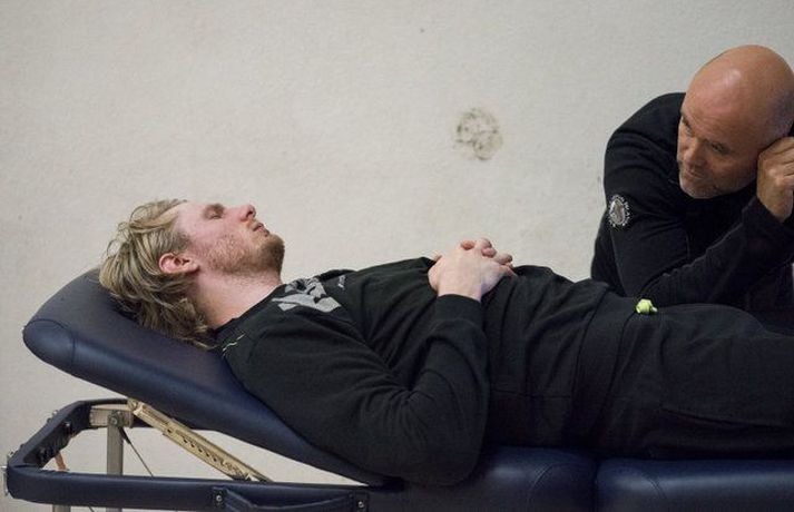 Ásgeir Örn vonast til að spila annan leikinn gegn Svíum Ingvi Þór Sæmundsson skrifar 25. október 2017 19:15 Ásgeir Örn ræðir við Pétur Örn Gunnarsson sjúkraþjálfara. vísir/eyþór Ásgeir Örn Hallgrímsson segir líklegt að hann geti tekið þátt í vináttulandsleikjunum gegn Svíum í Laugardalshöllinni. Sá fyrri fer fram annað kvöld og sá síðari á laugardaginn. Ásgeir Örn hefur glímt við meiðsli í upphafi tímabils og lítið komið við sögu hjá sínu félagsliði, Nimes í Frakklandi. Hann segist þó vera á batavegi. „Staðan er þokkaleg. Þetta er búið að vera frekar hægt haust en ég er allur að koma til. Núna er þetta allt á uppleið,“ sagði Ásgeir Örn sem hefur verið meiddur mjöðm síðan í lok ágúst. Aðspurður sagðist Ásgeir Örn vera bjartsýnn á að geta spilað allavega annan leikinn gegn Svíum. Ásgeir Örn, sem er 33 ára, er næstelsti leikmaðurinn í íslenska hópnum sem er mjög ungur að þessu sinni.„Þetta eru ungir og ferskir strákar. Þetta er vissulega nýtt og öðruvísi. Það felast nýjar áskoranir í því. En maður saknar auðvitað gömlu vinanna,“ sagði Ásgeir Örn sem reynir hvað hann getur til að hjálpa yngri leikmönnunum í íslenska liðinu. „Maður gerir það sem maður getur til að hjálpa þeim og gera þetta létt. Við erum allir að reyna að vinna leiki og maður reynir að miðla af reynslunni.“ Ásgeir Örn hefur leikið í Frakklandi síðan 2012, fyrstu tvö árin með Paris Saint-Germain og síðan með Nimes. „Ég gerði nýjan þriggja ára samning í fyrra þannig að ég á þetta tímabil og næsta eftir. Síðan tekur maður stöðuna. Þá verður maður orðinn 35 ára og allt eins líklegt að maður fari heim. En maður veit aldrei,“ sagði Ásgeir Örn. Hauka, uppeldisfélag Ásgeirs Arnar, vantar örvhenta skyttu. Er ekki gráupplagt fyrir hann að fylla það skarð? „Það er aldrei að vita. Maður sér til,“ sagði Ásgeir hlæjandi.Ásgeir Örn hefur leikið 247 landsleiki.vísir/eyþór EM 2018 í handbolta Tengdar fréttir Gísli Þorgeir: Handbolti spyr ekki um aldur Gísli Þorgeir Kristjánsson leikur væntanlega sína fyrstu landsleiki þegar Ísland mætir Svíþjóð í tveimur vináttulandsleikjum í Laugardalshöll annað kvöld og á laugardaginn. 25. október 2017 13:00 Létt yfir strákunum í morgun | Myndir Íslenska karlalandsliðið í handbolta mætir því sænska í fyrri vináttulandsleik liðanna í Laugardalshöllinni annað kvöld. Liðin mætast aftur á laugardaginn, sjálfan kjördaginn. 25. október 2017 16:00 Tuttugu ára aldursmunur á leikmönnum A-landsliðsins Það munar rétt tæplega tuttugu árum á tveimur leikmönnum íslenska A-landsliðsins í handbolta sem er að fara mæta Svíum í tveimur vináttulandsleikjum í Laugardalshöllinni á næstu dögum. 25. október 2017 10:30 Guðjón: Aron á eftir að rita nafn sitt stórum stöfum í sögu Barcelona Landsliðsfyrirliðinn Guðjón Valur Sigurðsson er afar ánægður fyrir hönd Arons Pálmarssonar sem í gær varð formlega leikmaður Barcelona. 24. október 2017 14:30 Mest lesið Vonast til að komast í Kórinn: „Menn hafa aldrei séð annað eins“ Fótbolti Fær þrjár milljónir á dag næstu sex árin fyrir að gera ekkert Sport Landsleiknum aflýst og framhaldið óljóst Fótbolti Stöðufundur í Laugardal klukkan 10:30 Fótbolti Enska úrvalsdeildin í jólaköttinn Enski boltinn Elsta konan til klára Járnkarlinn Sport Markvörður Inter banaði háöldruðum manni í hjólastól Sport Nýi íþróttastjóri Kjartans stal mörgæs og endaði í fangelsi í Singapúr Fótbolti Segir að Slot verði að taka tvo leikmenn út úr Liverpool-liðinu Enski boltinn Brendan Rodgers sagði starfinu sínu lausu eftir ásakanir Fótbolti Fleiri fréttir Gísli bjó til meira en þriðjung markanna Haukur magnaður í sigri Löwen Blær skoraði þrjú og lagði upp jöfnunarmarkið KA/Þór sótti sigur gegn Fram og stigalausar Stjörnukonur Fram kjöldró HK og spenna í Eyjum Meistararnir unnu gegn ÍBV og ÍR hafði betur gegn Selfyssingum Donni og félagar björguðu stigi undir lokin Afturelding komst upp að hlið Hauka Seldu bleika búninginn hennar Herrem fyrir meira en milljón „Leið vel þegar ég fór inn úr færinu“ Uppgjörið FH - Haukar 27-26 | Birgir Már tryggði FH sigur eftir spennutrylli Bernard fór mikinn en Valsmenn sluppu með sigurinn Fyrsti sigur Þórsara síðan í byrjun september Ómar Ingi með fullkomnan leik í Meistaradeildinni Guðjón Valur og lærisveinar hársbreidd frá því að vinna Kiel Hlakka til að sjá Viktor Gísla aftur og senda honum skilaboð Neyddar í sömu stöðu og Ísland og límdu melónur á skóna Hatar hvítu stuttbuxurnar Fjölga stórmótum landsliða í handboltanum Allt jafnt í bikarslag íslensku stelpnanna Orri fagnaði í Íslendingaslag í Meistaradeildinni Hjartavandamál halda Reyni frá keppni Stórar breytingar á Evrópukeppnum í handbolta Framarar töpuðu aftur á heimavelli í Evrópudeildinni Magdeburg komst örugglega áfram í sextán liða úrslitin Íslensku strákarnir áberandi í Evrópudeildinni „Stærri og sterkari en liðin sem við þekkjum hérna heima“ Viktor til liðs við frænda sinn og bróður Uppgjörið: Portúgal - Ísland 26-25 | Annar eltingaleikur íslenska liðsins endar með öðru tapi Kom að fjórtán mörkum í stórsigri á Leipzig Sjá meira