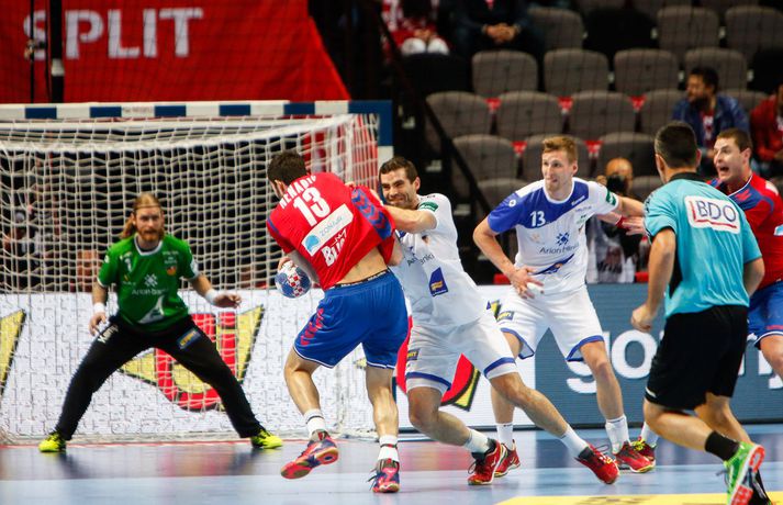 Myndasyrpa: Súrt tap gegn Serbum Eiríkur Stefán Ásgeirsson skrifar 16. janúar 2018 20:23 Þrátt fyrir að hafa verið með fjögurra marka forystu í síðari hálfleik náðu strákarnir okkar í íslenska landsliðinu að glopra niður forystunni á erfiðum lokakafla gegn Serbíu á EM í Króatíu í kvöld. Niðurstaðan varð þriggja marka tap, 29-26, og hanga vonir okkar um að komast áfram í milliriðla á bláþræði. Til þess þurfa strákarnir okkar að stóla á sigur Króatíu gegn Svíþjóð. Það hefði þó getað verið verra þar sem fjögurra marka tap hefði þýtt að Ísland væri úr leik, óháð úrslitanna í síðari leik riðilsins. Ernir Eyjólfsson, ljósmyndari Fréttablaðsins og Vísis, var á leiknum í kvöld og festi hann á filmu. Myndum hans er hægt að fletta hér fyrir neðan.Hvorugt lið fagnaði mikið eftir leik.Vísir/Ernir EM 2018 í handbolta Tengdar fréttir Í beinni: Króatía - Svíþjóð | Örlög strákanna ráðast í kvöld Ísland er úr leik á EM í Serbíu. Það varð ljóst eftir óvæntan sigur Svíþjóðar á gestgjöfum Króatíu í kvöld. 16. janúar 2018 21:00 Einkunnir Íslands: Guðjón Valur bestur Vísir gefur leikmönnum og þjálfara einkunn fyrir frammistöðu sína á EM í Króatíu. 16. janúar 2018 19:52 Twitter eftir leik: „Algjört gjaldþrot" Það var líf og fjör á Twitter eins og alltaf þegar íslenskt íþróttafólk er í eldlínunni. Hér að neðan má sjá eitt og annað sem var rætt um á Twitter í kvöld. 16. janúar 2018 18:52 Kári: Við förum áfram með tvö stig og allir góðir Ísland þarf að treysta á að Króatía vinni Svíþjóð til þess að fara áfram í milliriðla á Evrópumótinu í handbolta eftir þriggja marka tap gegn Serbum 16. janúar 2018 19:25 Umfjöllun: Ísland - Serbía 26-29 | EM á bláþræði eftir tap gegn Serbíu Strákarnir okkar fóru afar illa að ráði sínu gegn Serbíu og þurfa nú að treysta á að Króatía vinni Svíþjóð í kvöld. 16. janúar 2018 19:15 Tölfræði HB Statz: Sóknarleikurinn varð Íslandi að falli HB Statz greinir frammistöðu Íslands í tapinu gegn Serbíu á EM í kvöld. 16. janúar 2018 20:11 Mest lesið Vonast til að komast í Kórinn: „Menn hafa aldrei séð annað eins“ Fótbolti Landsleiknum aflýst og framhaldið óljóst Fótbolti Fær þrjár milljónir á dag næstu sex árin fyrir að gera ekkert Sport Stöðufundur í Laugardal klukkan 10:30 Fótbolti Enska úrvalsdeildin í jólaköttinn Enski boltinn Elsta konan til klára Járnkarlinn Sport Markvörður Inter banaði háöldruðum manni í hjólastól Sport Segir að Slot verði að taka tvo leikmenn út úr Liverpool-liðinu Enski boltinn Nýi íþróttastjóri Kjartans stal mörgæs og endaði í fangelsi í Singapúr Fótbolti Landsliðskonur aðstoðuðu ökumenn í vanda Fótbolti Fleiri fréttir Teitur inn í landsliðið Gísli bjó til meira en þriðjung markanna Haukur magnaður í sigri Löwen Blær skoraði þrjú og lagði upp jöfnunarmarkið KA/Þór sótti sigur gegn Fram og stigalausar Stjörnukonur Fram kjöldró HK og spenna í Eyjum Meistararnir unnu gegn ÍBV og ÍR hafði betur gegn Selfyssingum Donni og félagar björguðu stigi undir lokin Afturelding komst upp að hlið Hauka Seldu bleika búninginn hennar Herrem fyrir meira en milljón „Leið vel þegar ég fór inn úr færinu“ Uppgjörið FH - Haukar 27-26 | Birgir Már tryggði FH sigur eftir spennutrylli Bernard fór mikinn en Valsmenn sluppu með sigurinn Fyrsti sigur Þórsara síðan í byrjun september Ómar Ingi með fullkomnan leik í Meistaradeildinni Guðjón Valur og lærisveinar hársbreidd frá því að vinna Kiel Hlakka til að sjá Viktor Gísla aftur og senda honum skilaboð Neyddar í sömu stöðu og Ísland og límdu melónur á skóna Hatar hvítu stuttbuxurnar Fjölga stórmótum landsliða í handboltanum Allt jafnt í bikarslag íslensku stelpnanna Orri fagnaði í Íslendingaslag í Meistaradeildinni Hjartavandamál halda Reyni frá keppni Stórar breytingar á Evrópukeppnum í handbolta Framarar töpuðu aftur á heimavelli í Evrópudeildinni Magdeburg komst örugglega áfram í sextán liða úrslitin Íslensku strákarnir áberandi í Evrópudeildinni „Stærri og sterkari en liðin sem við þekkjum hérna heima“ Viktor til liðs við frænda sinn og bróður Uppgjörið: Portúgal - Ísland 26-25 | Annar eltingaleikur íslenska liðsins endar með öðru tapi Sjá meira