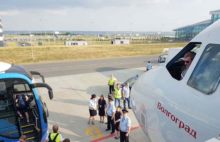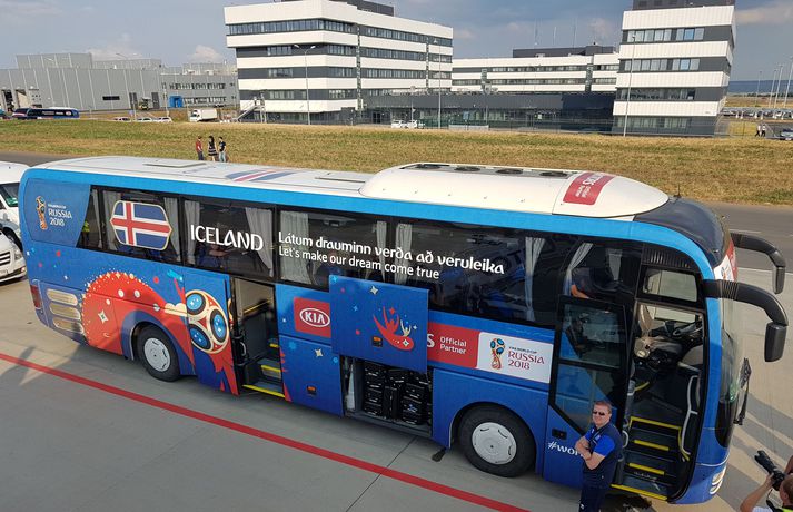Íslenska landsliðið í knattspyrnu er lent í Rostov þar sem liðið leikur gegn Króatíu í síðatsa leik riðlakeppninnar á þriðjudag. Strákarnir lentu á flugvellinum í Rostov klukkan sex að staðartíma en rúta íslenska liðsins beið við flugvélina er strákarnir lentu. Við tekur klukkutíma akstur inn í borgina á hótelið þar sem strákarnir okkar dvelja fyrir leikinn mikilvæga gegn Króatíu á þriðjudaginn. Eiður Smári Guðjohnsen var með í flugvélinni en hann er einn sparkspekinga RÚV á meðan mótinu stendur. Hann spjallaði við formann KSÍ, Guðna Bergsson, áður en haldið var upp í rútu í Rostov.