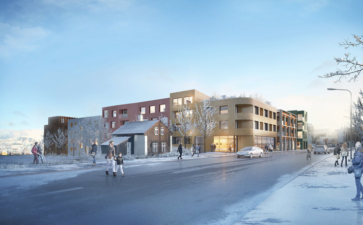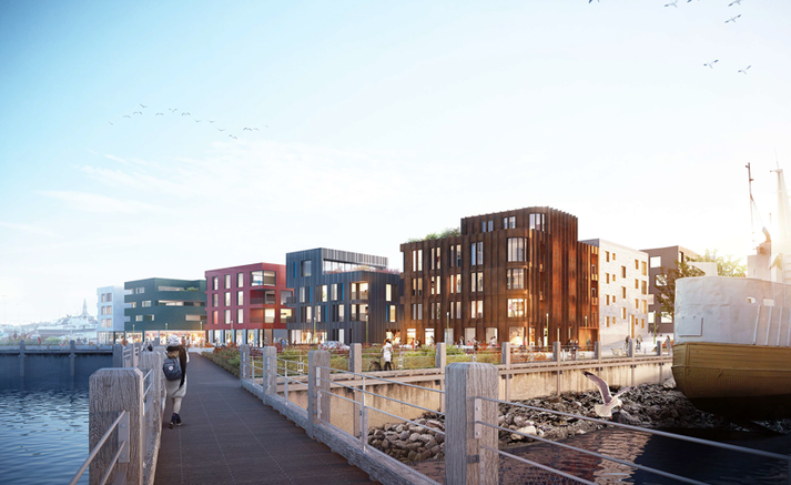 Stefnt er að því að hundrað og níutíu íbúðir verði risnar í Vesturbugt við gamla slippinn í Reykjavík innan fimm ára. Verkefnið hefur tekið nokkrum breytingum frá því það var kynnt fyrst og íbúðum fjölgað. Í maí 2017 skrifuðu Reykjavíkurborg og byggingarfélagið Vesturbugt undir samning um byggingu 176 íbúða á einstakri og stórri lóð í Vesturbugtinni. Framkvæmdir áttu að hefjast haustið 2018. Það dróst hins vegar af ýmsum ástæðum en nú er stefnt að því að hefja framkvæmdir næsta vor. Svona gæti hluti Vesturbugtar litið út innan fimm ára.Grafík mynd/Vesturbugt Félagið Vesturbugt er í eigu VSÓ og Kaldalóns og var stofnað utan um verðlaunatillögu um uppbyggingu svæðisins. Eftir nánari skoðun á hugmyndinni og með tilliti til markaðsaðstæðana hefur íbúðunum verið fjölgað um fjórtan. Jónas Þór Þorvaldsson framkvæmdastjóri Kaldalóns segir það einstakt tækifæri að fá að þróa byggð á þessari lóð við gömlu höfnina.Stöð 2/Baldur Jónas Þór Þorvaldsson framkvæmdastjóri kaldalóns segir að nú sé áhersla lögð á litlar og meðalstórar íbúðir. En áður hafði nokkur fjöldi íbúða verið í stærri kantinum sem nokkuð hafi verið byggt af annars staðar á miðborgarsvæðinu. Framtíðarsýn að Vesturbugtinni frá Sjóminjasafninu.Grafík mynd/Vesturbugt „Við stöndum hér við Hlésgötuna. Vestan meginn verður Hlésgata eitt og austan megin Hlésgata tvö. Það verða væntanlega um 120 íbúðir í seinni áfanganum sem er Hlésgata eitt og sjötíu íbúðir austan megin á Hlésgötu tvö,“ segir Jónas. Íbúðirnar verði í fimmtán byggingum með þjónustu á neðstu hæðum í útjöðrum og samkvæmt samningi fái borgin hluta húsnæðisins til ráðstöfunar. „Borgin fær eins og gert var ráð fyrir í samningnum einhverja fjögur þúsund fermetra. Undir íbúðir í félagslega kerfinu, stúdenta og félagsbústaði,“ segir Jónas. Það sé einstakt tækifæri að fá að þróa byggð á þessari lóð við höfnina. Nýja byggðin mun ná upp að lóðarmörkum gamla húsins fremst á myndinni sem mun standa áfram.Grafík mynd/Vesturbugt „Hún er alveg sérstök að því leytinu til að hún snýr auðvitað beint að höfninni til norðurs. Stutt í miðbæinn en hefur samt ákveðna friðsæld frá umferðarmesta svæðinu,“ segir Jónas. Ef allt gangi eftir verði fyrsta áfanga lokið 2023. „Hinn gæti byrjað ári eftir að sá fyrri fer af stað. Þá er þetta vonandi búið öðru hvoru meginn við 2024 og 2025 ef allt gengur upp,“ segir Jónas Þór Þorvaldsson.