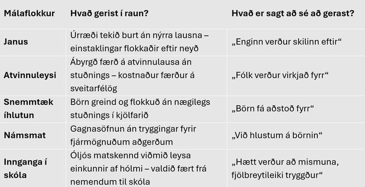 Það er freistandi að taka undir hugmyndir á borð við „hlustum á börnin“, „snemmtæk íhlutun“ eða „aukin virkni atvinnuleitenda“. Slíkar yfirlýsingar eru hlýlegar á yfirborðinu og gefa til kynna að ábyrg stjórnvöld hyggist efla velferð samfélagsins með metnaðarfullum aðgerðum. En þegar þróun þessara stefna er skoðuð nánar, einkum hvernig þær skarast á milli ólíkra málaflokka , kemur í ljós önnur og dekkri mynd: Ásýnd velferðar þar sem dregið er úr stuðningi og auknar byrðar eru lagðar á þá sem minnst mega sín. Sýndarvelferð Hækkun örorkulífeyris hljómar vel. Pólitískt vinsæl aðgerð og hagræn innspýting. Fjármunir renna hratt í mat, húsnæði og lyf, því öryrkjar hafa sjaldan sparnaðargetu. En þegar stjórnmálaflokkur sem hefur brotið lög fær aðgang að viðkvæmum gögnum og stýrir aðstoðinni sjálfur, vakna spurningar: Er verið að styðja fólk eða skrá það, stýra því og skilgreina? Þegar sömu aðilar sem meta þörf úthluta úrræðum, dregur úr aðskilnaði valds og velferðar. Traustið sem notendur þurfa að bera – er ekki lengur aðeins faglegt, heldur pólitískt. Þá verður spurningin þessi: Hver skilgreinir þörfina – og í hvaða tilgangi? Janus – þjónusta sem breyttist í óáþreifanlegt framtíðarloforð Lokun Janusar, eina sérhæfða geðendurhæfingarúrræðis landsins fyrir ungt fólk – er lýsandi dæmi. Þrátt fyrir árangur og þúsundir undirskrifta var úrræðinu lokað án þess að raunhæf framtíðaráætlun lægi fyrir. Einstaklingar sem þegar hafa brotakennda vernd, standa nú frammi fyrir tómum loforðum. Ábyrgð færist á milli ráðuneyta og stofnana, á meðan þjónustan sjálf hverfur. Þannig er hættan sú að aðeins þeir sem metnir eru í „mestri neyð“ fái áfram stuðning. Með öðrum orðum: Fólk er hvatt til að vera sem verst statt. Atvinnuleysisbætur – virkni sem magnar óöryggi Á sama tíma er hámarksbótaréttur atvinnuleitenda styttur, en án þess að raunveruleg úrræði taki við. Ábyrgðin færist frá ríkinu yfir á einstaklinga og á sveitarfélög, sem þurfa að axla aukna ábyrgð og bera þyngri kostnað. „Sparnaður“ ríkisins – metinn á fjóra milljarða – virðist í raun tilfærsla á vandanum. Með þverrandi rétti eykst þrýstingurinn á að flokka fólk: Í þá sem ná að bjarga sér – og hina sem lenda í neyðarúrræðum. Stimplun í stað lausna Áhersla á „snemmtæka íhlutun“ í leikskólum lofar góðu, en án raunverulegs fjármagns verða þessar greiningar markmið í sjálfu sér, ekki leið að lausn. Börn eru metin og flokkuð – án þess að tryggð sé raunveruleg aðstoð. Sams konar þróun má sjá í nýju námsmati, þar sem gögnum eru safnað, en aðgerðir og úrbætur eru óljósar. Þannig breytast gögnin í tæki til flokkunar, ekki stuðnings. Flokkun í nafni fjölbreytileikans Breytingar á innritun í framhaldsskóla leggja áherslu á fjölbreytileika og réttlæti. Ný matsviðmið, byggð á huglægum upplýsingum frá nemendum og mati skóla, færa valdið frá nemendum til stofnana. Úr varðveislu sanngjarns aðgengis verður ný tegund flokkunar, nú undir yfirskini réttlætis. Nemendur þurfa áfram að sanna að þeir eigi erindi – en eftir enn óljósari viðmiðum. Úr flokkun í raunverulega velferð Til að sporna gegn þessari þróun og verja raunveruleg réttindi gegn sýndarvelferð og skaðlegri flokkun þarf að efla gagnsæi og lýðræðislegt aðhald í ákvarðanatöku. Mat á þörf á að aðskilja frá úthlutun aðstoðar. Atvinnuleitendur og ungt fólk í vanda þurfa raunverulegt val og fjölbreytni í úrræðum – ekki aðeins neyðarúrræði fyrir þá sem metnir eru „verðugastir“. Þarfagreining á að vera einstaklingsmiðuð og byggð á samráði við notendur, ekki á miðlægum gagnagrunnum sem takmarka sjálfsákvörðunarrétt. Þegar kemur að skólainnritun verður að tryggja raunverulegt valfrelsi. Matskenndar reglur og óljós viðmið mega ekki ryðja sér til rúms á kostnað skýrrar og sanngjarnrar aðkomu nemenda að eigin framtíð. Þannig má byggja velferðarkerfi og menntakerfi sem hlustar – en flokkar ekki. Í þessari þversögn liggur svo kjarni spurningarinnar: Er velferðarkerfið vettvangur lausna – eða smiðja nýrra stimpla? Höfundur er lögfræðingur.