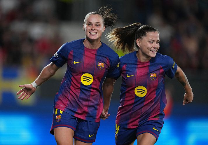 Glódís gat ekki stöðvað slátrunina Sindri Sverrisson skrifar 7. október 2025 21:16 Glódís Perla Viggósdóttir til varnar gegn Vicky Lopez á Johan Cruyff leikvanginum í Barcelona í kvöld. Getty/Judit Cartiel Barcelona vann ótrúlegan 7-1 sigur gegn Bayern München í Meistaradeild Evrópu í fótbolta kvenna í kvöld. Ríkjandi meistarar Arsenal töpuðu á heimavelli gegn Lyon, 2-1. Leikið er með nýju fyrirkomulagi í Meistaradeild kvenna í vetur þar sem nú eru öll átján liðin saman í einni deild, svipað og hjá körlunum. Fjórir fyrstu leikirnir voru í kvöld og eru Glódís Perla Viggósdóttir og stöllur hennar í Bayern því núna neðstar, eftir þennan mikla skell. Glódís, sem glímt hefur við meiðsli í upphafi tímabils, var á varamannabekknum í fyrri hálfleik og gat því ekkert gert við því að Bayern lenti þá 4-1 undir. Furðuðu lýsendur ESPN sig á því að Glódís skyldi ekki byrja þennan stórleik og bentu á vandræðin sem vörn Bayern var í án hennar. Ewa Pajor og Claudia Pina skoruðu tvö mörk hvor í kvöld.Getty Staðan var svo orðin 5-1 þegar Glódís kom inn á, hálftíma fyrir leikslok, og löngu ljóst hvert stigin þrjú færu, en Claudia Pina bætti við tveimur mörkum í lokin. Ewa Pajor skoraði einnig tvö mörk og þær Alexia Putellas, Esmee Brugts og Salma Paralluelo eitt mark hver. Klara Bühl skoraði mark gestanna. Eins og fyrr segir sótti Lyon þrjú stig til Lundúna með 2-1 sigri á Arsenal. Heimakonur komust þó yfir með marki Alessia Russo en Melchie Dumornay svaraði með tveimur mörkum á fimm mínútum, um miðjan fyrri hálfleik, og þar við sat. Paris og OH Leuven gerðu 2-2 jafntefli og Juventus vann 2-1 sigur gegn Benfica. Erfið staða hjá Ísabellu og Diljá Í kvöld var einnig keppt í undankeppni nýja Evrópubikarsins, eins konar B-Evrópukeppni kvenna, þar sem þrjú Íslendingalið voru á ferðinni. Ísabella Sara Tryggvadóttir var í byrjunarliði Rosengård sem tapaði 3-0 á útivelli í fyrri leik sínum við Sporting í Portúgal, og Diljá Ýr Zomers kom inn á sem varamaður í seinni hálfleik fyrir Brann sem tapaði 4-1 gegn Hammarby í Svíþjóð. Landsliðsmarkvörðurinn Fanney Inga Birkisdóttir var svo á varamannabekknum hjá Häcken sem vann 4-0 stórsigur gegn Katowice frá Póllandi. Seinni leikirnir verða í næstu viku. Meistaradeild Evrópu í fótbolta kvenna Mest lesið Aðdáendur pirraðir eftir „ákvörðun“ LeBron James Körfubolti „Mér finnst hún skipta sér af málum sem koma henni ekki við“ Fótbolti Sló golfhögg með krókódíl rétt fyrir aftan sig Golf LeBron boðar aðra Ákvörðun Körfubolti Sekúndubrot á milli Tomma og Nablans í fyrstu grein Ólympíuleika Extra Sport Bjargaði lífi mótherja í miðjum leik Fótbolti Stórefnilegur og hafnaði níu milljarða króna samningi Sport „Maður verður bara að styðja við bakið á honum“ Fótbolti Uppgjörið: Valur - Njarðvík 77-80| Njarðvíkursigur í spennutrylli Körfubolti Gætu kvatt Bestu deildina án þjálfarans og lykilmanna Íslenski boltinn Fleiri fréttir Glódís gat ekki stöðvað slátrunina Gætu kvatt Bestu deildina án þjálfarans og lykilmanna „Maður verður bara að styðja við bakið á honum“ Annar fóstbróðir Messis lætur gott heita „Skoraði í fyrsta leik og hef ekki hætt síðan“ Raya að skrifa undir nýjan samning Haaland hefur skorað á öllum völlum nema einum Tíu milljóna punda kjarakaup Sölvi hæstánægður með Gylfa og vill sjá hann í landsliðinu Þorlákur verður áfram með Eyjamenn John Stones íhugaði að hætta í fótbolta Engar leynilegar viðræður í gangi um framtíð Meistaradeildarinnar Hvetur fólk til að skipta Gyökeres og Joao Pedro út ef þeir taka ekki vítin Hefur verið í liðinu eftir að ný leikstaða uppgötvaðist í Sambandsdeildinni „Enginn vissi hvað ég var að ganga í gegnum“ Er eitthvað óeðlilegt að búið sé að gagnrýna þetta Valslið? Metár hjá David Beckham Rooney gagnrýnir Mo Salah og vill færa hann til á vellinum „Mér finnst hún skipta sér af málum sem koma henni ekki við“ Bjargaði lífi mótherja í miðjum leik „Skil ekki hvernig má kýla einhvern í andlitið?“ Hafa fengið áttatíu prósent stiga í boði með Gunnar í byrjunarliðinu Uppgjörið: Valur - Stjarnan 1-3 | Stjarnan lyftir sér upp í fjórða Fótboltaiðkendur með fatlanir kíktu á landsliðsæfingu UEFA grætur niðurstöðuna en gefur grænt ljós Depay fastur í Brasilíu án vegabréfs Úsbekar leita í reynslu Cannavaro fyrir fyrsta HM „Þetta er enginn flugeldasýningar Íslandsmeistaratitill“ Ekki gerst á Skaganum síðan Garðar átti markamánuð lífs síns Guardiola ætlar að skipuleggja kvöldverð með Wenger og Ferguson Sjá meira