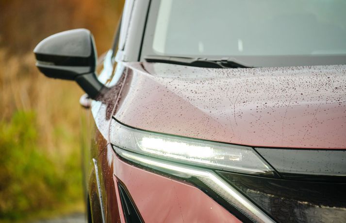 Nissan Ariya er glæsilegur sportjeppi sem er jafnvígur á innanbæjarakstur og lengri ferðalög um landið. Bíllinn kom fyrst á markað árið 2022 og hefur síðan verið að festa sig í sessi sem stílhreinn og áreiðanlegur rafbíll með ríkulegan staðalbúnað og þægindi í hæsta gæðaflokki. Það fyrsta sem vekur athygli er einföld og nútímaleg hönnun bílsins. Hann beið mín við höfuðstöðvar BL við Sævarhöfða í Reykjavík, hreinn, glansandi og með yfirbragði öryggis og krafts. Þetta er stæltur sportjeppi og ég var heldur betur tilbúinn í fjörið. 12,3” stafrænt mælaborð inniheldur allar helstu upplýsingar í skýru og einföldu uppsettu formi, stílhreint og smekklegt.Vísir/Anton Brink. Ariya kemur í þremur útgáfum; Advance, Evolve (framhjóladrifinn) og Evolve fjórhjóladrifinn sem var sá bíll sem ég fékk að prófa. Vísir/Anton Brink. Ariya býr yfir e-4ORCE aldrifskerfi með tvöföldum rafmótor sem skilar meira hámarkstogi, stöðugleika og snerpu á nánast hvaða undirlagi sem er. Rafhlaðan er 87 kWh með allt að 530 km drægni og með hraðhleðslu má bæta við 300 km á um 30 mínútum. Bókaðu reynsluakstur hér. Plássið fyrir ökumann er mjög gott og ég sest inn í rafdrifið og upphitað ökumannssæti með stillanlegum mjóhryggsstuðningi – smáatriði sem skipta miklu máli fyrir langar vegalengdir. Leðurklætt stýrið er sportlegt og þétt í hendi, ekki of stórt og gefur góða tilfinningu í akstri. Það er góð tilfinning fyrir nettar hendur að handleika svona þétt stýri við aksturinn. Fyrir framan mig blasir við 12,3” stafrænt mælaborð þar sem allar helstu upplýsingar eru í skýru og einföldu uppsettu formi, stílhreint og smekklegt. LED-stemningslýsingin setur smá diskó í bíltúrinn.Vísir/Anton Brink. LED-stemningslýsingin undir mælaborðinu og í hurðum setur skemmtilegan svip á innra rýmið. Gott dæmi um eiginleika bíls sem skiptir í sjálfu sér litlu máli en setur mjög skemmtilegan svip á innra rýmið og eykur aðeins stemninguna. Í Evolve-útgáfunni bætist svo við Bose-hljómkerfi með 10 hátölurum og sérstökum bassahátalara. Hljómburðurinn er frábær, hvort sem hlustað er á Sálumessu Mozarts, rifjaðar upp eldri plötur Oasis í tilefni endurkomu bræðranna óstýrlátu eða nýjustu plötu Páls Óskars og Benn Hemm Hemm. Þetta er bíll sem gerir góðan dag enn betri – og mögulega heyrnina aðeins verri! Eitthvað sem miðaldra og aðeins heyrnaskertur bílstjórinn mátti nú varla við. Nettur miðjustokkurinn setur skemmtilegan svip á innra rýmið. Vísir/Anton Brink. Miðjustokkurinn er hreyfanlegur og hægt að færa hann fram og aftur eftir þörfum. Hann er einfaldur í hönnun en úthugsaður, með litla gírstöng, þráðlausa farsímahleðslu og snyrtileg geymsluhólf sem rúmar vatnsflösku, kaffimál eða ýmsa nauðsynlega smáhluti. Geymsluhólfinu er svo hægt að loka með fallegu viðarloki. Það er smá „Zen“ í þessari japönsku hönnun. Aftursætin eru rúmgóð og þægileg.Vísir/Anton Brink. Það fer mjög vel um farþega í aftursætunum, fótarýmið er rúmt og sætin eru bæði falleg og þægileg. Hægt er að hita aftursætin og tengja síma í gegnum USB-tengi. Armpúði með glasahöldum bætir við þægindin og með 60:40 niðurfellanlegum sætisbökum er auðvelt að stækka farangursrýmið án þess að fella niður öll sætin. Þannig er hægt að koma skíðum eða brettum með í ferðina en samt halda einu sæti lausu fyrir farþega. Intelligent-baksýnisspegillinn getur komið að góðum notum ef skyggnið bak við bílinn er slæmt.Vísir/Anton Brink. Baksýnisspegillinn í Nissan ARIYA er svokallaður Intelligent-baksýnisspegill. Hann er þeim kostum búinn að ef eitthvað byrgir fyrir útsýni úr honum, t.d. hávaxnir farþegar eða mjög mikill farangur, er hægt að skipta yfir á innbyggða LCD-skjáinn og fá þar með góða yfirsýn úr bakkmyndavélinni. Farangursrýmið er rúmgott og þægilegt.Vísir/Anton Brink. Farangursrýmið sjálft er 468 lítrar sem tekur fjórar meðalstórar ferðatöskur. Séu aftursætin lögð niður stækkar rýmið í 1431 lítra sem er mjög gott fyrir lengri fjölskylduferðir eða útivistina. Einn af mörgum kostum bílsins er síðan opnanlega glerþakið sem mér finnst hrikalega töff og nánast virði einnar auka stjörnu. Ekki bara er það frekar svalt heldur stækkar glerþakið rýmið fyrir utan að gefa enn meira aukabirtu. Það líður öllum betur í svona bíl. Vísir/Anton Brink. Ytra útlit bílsins er glæsilegt og inniheldur skarpar línur, kraftmikið grill og er jafnvæginu stillt smekklega á milli sportlegs og fágaðs útlits með t.d. 19” álfelgum, LED aðalljós og LED afturljósum. Ariya er ekki bíll sem þarf að öskra á eftir athygli en fær hana samt. Nissan Ariya er með skarpar línur, kraftmikið grill og er jafnvæginu stillt smekklega á milli sportlegs og fágaðs útlits.Vísir/Anton Brink.Vísir/Anton Brink Bílstjórar Nissan Ariya eru í góðum höndum þegar kemur að öryggisbúnaði og akstursaðstoð. Bíllinn er m.a. búinn neyðarhemlunarkerfi sem greinir gangandi vegfarendur bæði framan og aftan, auk fjarlægðar- og umferðarskynjara allan hringinn. Ariya býður einnig upp á blindhornsviðvörun með stýrisaðstoð, hraðatakmarkara og ISOFIX barnastólafestingar. Skemmtilegasta nýjungin sem ég prófaði var ProPilot-akstursaðstoðarkerfið sem býður m.a. upp á að bakka sjálfkrafa í stæði fyrir bílstjórann. Og þvílík upplifun! Ég hafði aldrei prófað svona áður og viðurkenni að ég var hálf efins í fyrstu en þetta virkaði fullkomlega. Bíllinn tók yfir stýrið, inngjöfina og hemlana og bakkaði snyrtilega inn í þröngt stæði og á milli tveggja bíla við umferðargötu. Ég gæti vel vanist þessu. Stutt samantekt Nissan Ariya er bíll
