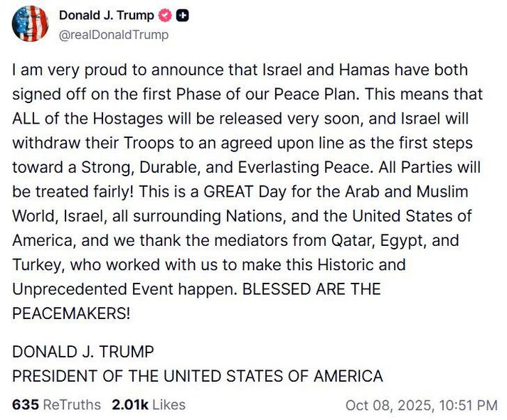 Í færslu sem hann birti á Truth Social, hans eigin samfélagsmiðli, segir Trump að með þessu eigi að mynda sterkan og varandi frið. Komið verði fram við alla af sanngirni og þakkar hann erindrekum Katar, Egyptalands og Tyrklands fyrir aðkomu þeirra að því að samkomulag hafi náðst. Viðræðurnar fóru fram í Egyptalandi. Færsla Trumps á Truth Social. Samkomulagið er meðal annars sagt fela í sér að Ísraelar sleppi palestínskum föngum úr þeirra haldi, hörfi með hermenn og opni aftur fyrir flæði neyðarhjálpar inn á Gasa. Þetta segir embættismaður frá Katar og segir hann að samkomulagið eigi að leiða til endaloka hernaðar Ísraela á Gasa. Frekari upplýsingar um samkomulagið verði veittar síðar. Í yfirlýsingu frá leiðtogum Hamas kalla þeir eftir því að Trump og aðrir ráðamenn í Mið-Austurlöndum og víðar, tryggi að Ísraelar framfylgi samkomulaginu. Að þeir tefji ekki framkvæmd þess eða fari ekki eftir því sem þeir hafi samþykkt. Þeir segja enn fremur að fórnir Palestínumanna verði ekki til einskis. Fjölmiðlar ytra segja að til standi að skrifa undir samkomulagið á morgun og að lifandi gíslum Hamas verði sleppt á laugardaginn eða á sunnudaginn. Rétti Trump miða um yfirlýsingu Marco Rubio, utanríkisráðherra Bandaríkjanna, gekk inn á fund sem Donald Trump, forseti, sat með íhaldssömum áhrifavöldum og blaðamönnum fyrr í kvöld og rétti forsetanum miða. Á mynd sem ljósmyndari náði af miðanum sést að Rubio var að biðja Trump um að gefa grænt ljós á færslu um samkomulag varðandi Gasaströndina væri í höfn. Það þyrfti Trump að gera svo hann gæti verið fyrstur til að tilkynna að samkomulag hafði náðst og það á Truth Social, hans eigin samfélagsmiðli. Á miðanum stóð að samkomulag væri „mjög nærri“. Marco Rubio, utanríkisráðherra Bandaríkjanna, með umræddan miða. Þar stendur að Trump þurfi að samþykkja færslu á Truth Social svo hann geti verið fyrstu til að segja frá samkomulagi.AP/Evan Vucci Í kjölfarið svaraði Trump nokkrum spurningum frá blaðamönnum meðan Rubio stóð óþreyjufullur nærri, samkvæmt AP fréttaveitunni. Þegar Trump stóð upp sagði hann að samkomulag væri nærri en neitaði að fara nánar út í það. „Ég þarf að fara núna, til að reyna að leysa vandamál í Mið-Austurlöndum,“ sagði hann. Secretary of State Marco Rubio whispers in the ear of President Donald Trump after handing him a note about a Middle East deal saying “Very close. We need you to approve a Truth Social post soon so you can announce deal first” pic.twitter.com/ISEJ2RsUOq— Evan Vucci (@evanvucci) October 8, 2025 Viðræður milli leiðtoga Hamas og Ísraela hafa farið fram í Egyptalandi undanfarna daga. Þeim er ætlað að binda enda á hernað Ísraela þar og sagði Trump fyrr í kvöld að hann myndi mögulega fara þangað um helgina. Trump lagði á dögunum fram tillögur að mögulegu friðarsamkomulagi sem samþykktar hafa verið af Ísraelum og nokkrum ríkjum Mið-Austurlanda. Tillögur Trumps voru mjög loðnar þegar kom að mögulegri stofnun ríkis Palestínu og tveggja ríkja lausn. Þær fólu einnig í sér að Hamas-liðar yrðu að leggja niður vopn og að þeir mættu ekki koma að stjórn Gasastrandarinnar í framtíðinni. Hvernig þetta mun líta út í samkomulaginu sem samþykkt var í kvöld á eftir að koma í ljós en hingað til hafa leiðtogar Hamas hafnað öllum kröfum um að leggja niður vopn. Sjá einnig: Hótar helvíti á jörð samþykki Hamas ekki tillögurnar Al Jazeera hefur eftir heimildarmanni sínum í Palestínu að leiðtogar Hamas hafi samþykkt að sleppa öllum gíslum sem eru í þeirra haldi, en ekki líkum sem þeir halda enn. Heimildarmaðurinn segir nokkurn árangur hafa náðst þegar kemur að skiptum á föngum og tryggingum um að Ísraelar hefji stríðið ekki aftur þegar gíslum hefur verið sleppt. Gíslunum verður mögulega sleppt um helgina, samkvæmt heimildum blaðamanns Times of Israel. Hamas will release the remaining living hostages on Saturday, two sources familiar with the negotiations tell The Times of Israel.The deal will be signed tomorrow in Egypt, the sources say. https://t.co/JNWm6okPTt— Jacob Magid (@JacobMagid) October 8, 2025 Palestínskir miðlar birtu fyrr í kvöld myndir af sendinefnd Hamas taka í hendur erindreka frá Katar og Tyrklandi. Myndirnar munu hafa verið teknar í Egyptalandi í kvöld. Fréttin hefur verið uppfærð og verður uppfærð frekar.