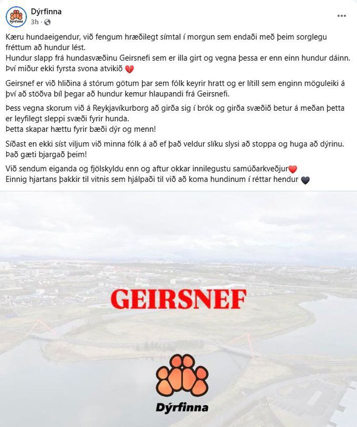 „Hundur slapp frá hundasvæðinu Geirsnefi sem er illa girt og vegna þessa er enn einn hundur dáinn. Því miður ekki fyrsta svona atvikið,” segir í færslu samtakanna á Facebook í dag. Eygló Anna O. Guðlaugsdóttir, sjálfboðaliði hjá samtökunum ítrekar í samtali við Vísi mikilvægi þess að aðbúnaður á svæðinu sé bættur. „Þessi hundur sem slapp í morgun var bara í lausagöngu á Geirsnefi, eins og svæðið leyfir. Það vill bara svo óheppilega til að hundurinn hleypur í burtu, ég veit ekki við hvernig aðstæður eða hvað gerist, en hann hleypur þarna strax út á Miklubrautina og lendir fyrir bíl. Þetta er ekki í fyrsta sinn sem þetta gerist,“ segir Eygló. Sjálfboðaliðasamtökin Dýrfinna birta samúðarkveðju og ákall til borgarinnar um úrbætur á samfélagsmiðlum í dag.Facebook Hún þekki óþarflega mörg dæmi þess að dýr hafi sloppið út af svæðinu, sem í sumum tilfellum hafi fundist aftur, en því miður séu einnig fleiri dæmi þess að hundar láti lífið þegar þeir verða fyrir bíl eftir að hafa sloppið út af svæðinu. „Eiginlega eina flóttaleiðin í burtu eru göturnar,“ segir Eygló sem bendir á að það séu ýmsar leiðir færar til að bæta öryggi hunda á svæðinu. „Það þarf að girða betur, þannig að dýrin komist ekki út af svæðinu. Flestöll bæjarfélög eru með gerði, en svo veit ég ekki hvort það væri betra að setja ristahlið, ef að hundarnir eru ólíklegri til að fara yfir það. Það eru margar leiðir betri en það sem er núna.“ Á meðan um er að ræða þar til gert hundasvæði þar sem lausaganga hunda er leyfileg sé lágmark að bjóða öruggari aðstæður fyrir hundana.