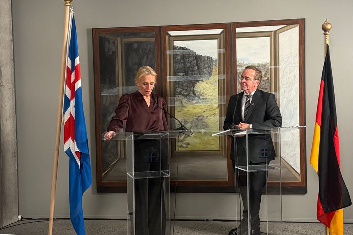 Á blaðamannafundi eftir undirritun sagði Þorgerður Katrín yfirlýsinguna eðlilegt næsta skref fyrir Íslendinga. Íslendingar og Þjóðverjar hafi átt náið og gott samband áratugum saman og innan NATO. Það samband sé styrkt enn frekar með þessari yfirlýsingu. Hún segir Þjóðverja nú leiðandi afl innan Evrópu og í heiminum í varnarmálum. „Það hefur verið mjög gott samband á milli okkar og Þýskalands en við ákváðum að formgera það og setja meiri þunga í þetta,“ segir Þorgerður Katrín um þessa yfirlýsingu og þetta samstarf. Það sé ljóst að Þýskaland hafi verið að sækja í sig veðrið þegar komi að öryggis- og varnarmálum og hafi, að hennar mati, tekið að sér leiðtogahlutverk í Evrópu í vörnum og fjárfestingum. „Enda eru þeir ekkert fjarri Rússlandi og þessum hættulega austurhluta.“ Hún segir þetta skipta verulegu máli fyrir Íslendinga. Þjóðverjar leggi, eins og við, mikla áherslu á Norður-Atlantshafið, öryggi í hafi og á norðurslóðum. Þeir fjárfesti miklu sem dæmi í kafbátum með Noregi. „Þetta samkomulag er einn liður í því að tryggja bæði öryggi okkar og varnir og um leið draga fram hvað við Íslendingar erum sterk á ákveðnum sviðum þegar kemur að þjónustu, uppbyggingu innviða, eins og til að mynda á Keflavíkurflugvelli og starfrækja íslenska loftrýmisgæslukerfið.“ Sinnum þjónustu við kafbáta og flugvélar Það sé það sem Ísland komi með að þessu samkomulagi. Það feli til dæmis í sér að hingað geti komið stórir kafbátar og flugvélar. Fyrir þetta þurfi að byggja ákveðna innviði eða styrkja þá sem þegar eru. „Við erum að sjá okkur koma sterk inn í þetta þjónustuhlutverk og ekki síður hitt að undirstrika landfræðilega legu okkar Íslendinga sem er gríðarlega mikilvæg, og náttúrulega stærsta framlag okkar til veru okkar í NATO. Þorgerður Katrín og Boris ræddu við fréttamenn að lokinni undirritun. Vísir/Bjarni Þorgerður segir ógnirnar færast nær okkur og þess vegna hafi verið lögð áhersla á að vera tilbúin og að fræða í stað þess að hræða. Einn liður í því að styrkja stöðu Íslands sé að gera tvíhliða samkomulag og marghliða samkomulag. Nú sé búið að semja við Þjóðverja og Finna um tvíhliða samkomulag. „Þetta er allt gert til að styrkja stöðu okkar Íslendinga þannig það verði auðveldara fyrir okkur að byggja upp mannafla, þekkingu, tækni og aðstöðu og sýna fram á að við erum öflugir bandamenn þegar á reynir.“ Hún segist hafa séð að það skiptir máli að Íslendingar standi við sínar skuldbindingar. Hún muni fylgjast með því hvernig aðrar norrænar þjóðir ætli að haga sínum vörnum í drónamálum. Hún segir NATO hafa verið að styrkja sig allt frá innrás Rússa í Úkraínu og að Evrópuríkin og Kanada séu sérstaklega að styrkja sig. Hægt er að horfa á viðtalið í heild sinni að ofan.
