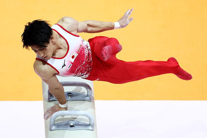 Dagur Kári náði 24. og þar með síðasta sætinu inn í úrslitin og hann endaði sömuleiðis í því sæti í úrslitunum, afar nálægt næsta manni. Dagur hlaut samtals 73,332 í einkunn og var aðeins 0,032 stigum á eftir Egyptanum Omar Mohamed. Dagur byrjaði á svifrá og fékk 11,333 í einkunn þar. Hann fékk svo 11,433 á gólfi, 12,133 á bogahesti, 11,500 í hringjum og 13,300 í stökki, en hlaut sína bestu einkunn á síðasta áhaldinu þegar hann fékk 13,633 á tvíslá. Það var Japaninn Daiki Hashimoto sem fagnaði heimsmeistaratitlinum, eftir afar spennandi keppni, og er hann aðeins annar maðurinn í sögunni til þess að vinna heimsmeistaratitilinn í fjölþraut þrisvar í röð, eftir að hafa einnig unnið 2022 og 2023. Daiki Hashimoto sýndi mögnuð tilþrif og tryggði sér heimsmeistaratitilinn.Getty/Yong Teck Ólympíumeistarinn frá því í fyrra, Shinnosuke Oke, hafnaði aðeins í fimmta sæti með 81,797 stig. Heimsmeistarinn frá árinu 2021, Boheng Zhang, veitti Hashimoto mesta keppni. Japaninn endaði með 85,131 í heildareinkunn en hinn kínverski Zhang með 84,333. Noe Seifert frá Sviss hlaut bronsið með 82,831 í einkunn.