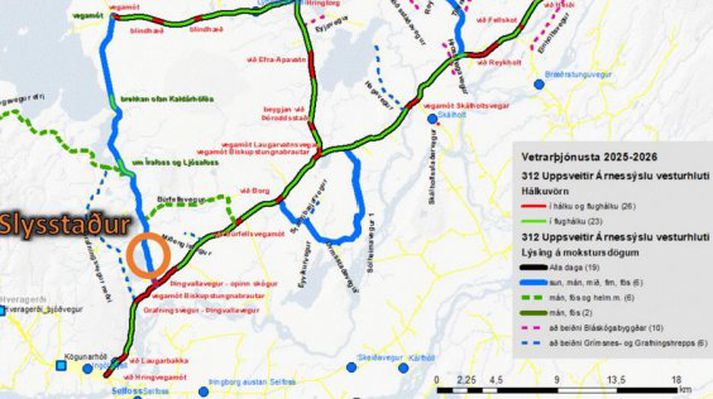 Sennilegt að ástand Þingvallavegar hafi haft áhrif á aðdraganda banaslyss Lovísa Arnardóttir skrifar 24. október 2025 10:58 Glerhálka var á veginum þegar slysið átti sér stað en einnig var ástand hans með þeim hætti að rannsóknarnefndin telur að það hafi haft áhrif á aðdraganda þess. Vegurinn hafði sigið töluvert, mest um 16 sentímetra. Rannsóknarnefnd samgönguslysa Rannsóknarnefnd samgönguslysa beinir því til Vegagerðar að endurskoða hálkuvarnir á Þingvallavegi með tilliti til vegarkaflans við Álftavatn og að Vegagerðin geri öryggisúttekt á undirbyggingu Þingvallavegs við Álftavatn. Það gerir nefndin í skýrslu um banaslys á Þingvallavegi í febrúar á þessu ári. Karlmaður á fimmtugsaldri lést í slysinu. Skýrsla rannsóknarnefndar var birt í dag. Banaslysið átti sér stað snemma morguns þann 20. febrúar á þessu ári. Þá var Mercedes Benz steypubíl ekið norður Þingvallaveg áleiðis að Álftavatni. Fram kemur í skýrslu rannsóknarnefndar að ökumaður missti stjórn á bílnum skömmu fyrir gatnamót við Vaðlækjarveg með þeim afleiðingum að bifreiðin snerist á veginum og valt. Slysið var tilkynnt til lögreglu klukkan 09:39 og viðbragðsaðilar fóru á vettvang. Fjarskiptamiðstöð lögreglunnar tilkynnti Rannsóknarnefnd samgönguslysa um slysið klukkan 09:58. Í skýrslu kemur einnig fram að undirlag klæðingar hafi gefið sig og vegurinn sigið niður í átt að vegarkanti. Þá voru sprungur í klæðingu vegarins. Lækkun var mest um 16 sentímetrar miðað við veghalla. Í skýrslu segir að í ljósi legu vegarins, aukins halla á hluta akreinarinnar, ferils ökutækisins fyrir slysið og stöðu þess eftir slysið sé sennilegt að ástand vegarins hafi haft áhrif á aðdraganda slyssins. Í skýrslunni segir um bílinn að hann hafi verið útbúinn ónegldum vetrarhjólbörðum og á honum hafi verið áföst tromla fyrir flutning á fljótandi steinsteypu. Ekkert fannst við skoðun á bifreiðinni sem gæti skýrt orsök slyssins og var heildarþyngd hennar innan leyfilegra marka. Samsett mynd úr skýrslunni sem sýnir brot í klæðingu og mælingu þar sem hluti eystri akreinar, í akstursstefnu vörubifreiðarinnar, hafði sigið niður.Rannsóknarnefnd samgönguslysa Engin merki um hemlun Samkvæmt ökurita bifreiðarinnar var henni ekið hraðast á 90 kílómetra hraða á klukkustund rétt fyrir slysið. Hámarkshraði á slysstað var 70 kílómetrar á klukkustund. Samkvæmt skýrslu sáust engin merki um hemlun en mat nefndar er að hálka á veginum hafi verið staðbundin og að erfitt hafi verið að sjá hana fyrir. Mikil hálka var á slysstað en vegarkaflinn liggur í lægð meðfram Álftavatni, þar sem auknar líkur eru á myndun glerhálku. Í skýrslunni kemur fram að glerhálka hafi verið á veginum og að ökumaðurinn hafi ekki verið spenntur í belti. Mat nefndarinnar er að áverkar ökumanns hefðu ekki verið lífshættulegir hefði hann verið spenntur í belti. Ökumaðurinn lenti að hluta undir steypubílnum þegar hann valt. Vegagerð endurskoði hálkuvarnir á veginum Rannsóknarnefnd samgönguslysa beinir þeirri tillögu til Vegagerðarinnar að endurskoða hálkuvarnir á Þingvallavegi með tilliti til vegarkaflans við Álftavatn. „Á vegarkaflanum um Álftavatn eru aðstæður í landslagi sem auka hættu á glerhálku í vetrarstillum en sá vegarkafli er ekki innan hálkuvarnarþjónustu Vegagerðarinnar. Vegurinn lækkar að vatnsyfirborði Álftavatns þar sem hann liggur næst vatninu. Aukinn raki og lækkun lofthita í stillum tengjast slíkum aðstæðum í landslagi. Því beinir nefndin þeirri tillögu til Vegagerðarinnar að meta hvort sá vegarkafli ætti að tilheyra varasömum stöðum sem falla undir hálkuvarnir,“ segir í skýrslu nefndarinnar. Þingvallavegur á slysstað er sýndur blár að lit en sá vegarkafli er ekki hálkuvarinn sbr. skýringar á myndinni. Slysstaður er merktur með hring. Mynd frá Vegagerðinni með viðbótarmerkingum frá RNSA. Þá beinir nefndin því til Vegagerðar að gera öryggisúttekt á undirbyggingu Þingvallavegs við Álftavatn. Ökumaðurinn hafi misst stjórn á bílnum á tiltölulega beinum um 130 metra löngum kafla þar sem undirbygging vegarins virðist hafa gefið sig. Langsum hæðarmismunur innan hægri akreinar í norðurátt hafi mestur verið 16 sentímetrar og halli mestur um 12 gráður. „Slík brot í vegi geta skapað hættuástand þegar glerhálka myndast,“ segir í tillögu nefndarinnar til Vegagerðar. Í skýrslunni segir að vetrarþjónusta Vegagerðar á veginum fari fram fimm daga vikunnar og að í því felist mokstursþjónusta en að vegurinn sé á þeim kafla sem slysið átti sér stað ekki hálkuvarinn. Veðurupplýsingar sem lágu fyrir um Suðurland að kvöldi 19. febrúar og fram eftir nóttu þann 20. febrúar báru með sér að litlar sem engar líkur væru fyrir þörf á vetrarþjónustu daginn eftir, en gert var ráð fyrir rigningu, vindi og hita yfir frostmarki. Ökumenn séu vakandi fyrir hálku og noti belti Rannsóknarnefndin hefur auk þess tvær mikilvægar ábendingar til bæði ökumanna og Vegagerðar í kjölfar slyssins. Annars vegar um akstur í hálku og glerhálku og hins vegar um notkun öryggisbelta. Um hálkuna segir að ísing myndist oft á blautum vegum þegar smám saman kólnar. „Ísing sem þessi getur líkst blautum vegi, en myndar spegilslétta og nær ósýnilega þekju á yfirborðinu og því getur verið erfitt fyrir ökumenn að átta sig á aðstæðum. Slíkur ís á vegum er oft kallaður glerhálka eða glæra. Rannsóknarnefnd samgönguslysa hvetur ökumenn til þess að vera vakandi fyrir hálku og við hvaða aðstæður hún myndast helst. Ökumenn ættu að vera sérstaklega á varðbergi þegar lofthiti er undir 4°C og vegur virðist blautur.“ Hvað varðar notkun öry