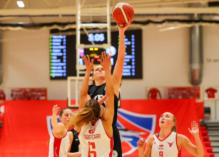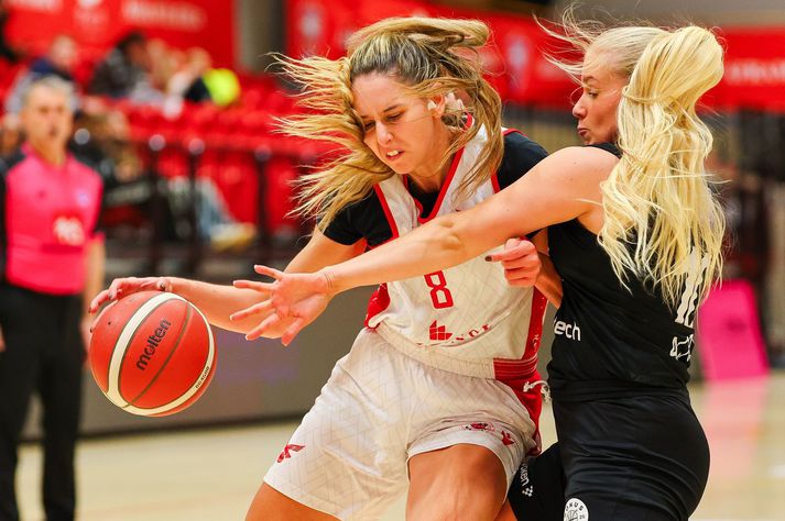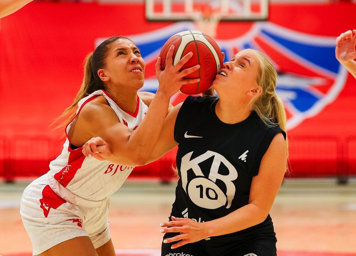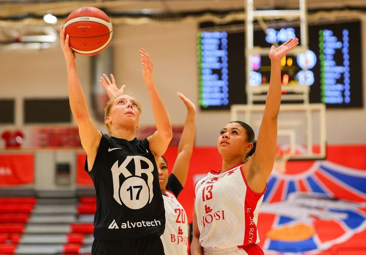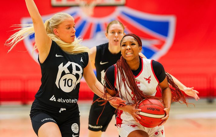 Það sannkallaður grannaslagur á Hlíðarenda þegar Valur tók á móti KR í Bónu-sdeild kvenna í kvöld. Úr varð fínasta skemmtun og mikið skorað en leikurinn endaði 93-100 gestunum í vil. Reshawna Rosie Stone var stigahæst Valsara.Vísir/Anton Brink Valskonur voru skrefinu á undan í byrjun leiks og litu miklu betur út. Voru að fá auðveldar körfur og spila fínan varnarleik en KR megin var Molly Kaiser að halda lífi í sínum konum og þá aðallega með körfum af millifærinu en það leit út eins og hún gæti ekki klikkað. Staðan eftir 1. leikhluta var 30-20 og öll stemmingin hjá Valskonum. Alyssa Marie Cerino sækir á vörn KR og fær óblíðar móttökur.Vísir/Anton Brink Í 2. leikhluta var stemmingin svo öll KR megin. Val gekk illa að skora meðan það opnuðust einhverjar glufur í vörninni hjá þeim sem KR-ingar nýttu sér vel og voru búnir að minnka forskotið niður í þrjú stig þegar leikhlutinn var hálfnaður og stóðu síðan leikar jafnir í hálfleik 52-52. Eve Brasils var drjúg í kvöld eins og oft áður.Vísir/Anton Brink Restin af leiknum var mikið fram og til baka. Bæði liðin skiptust á forystu og að koma með áhlaup en yfirleitt var það KR að auka forystuna og síðan Valur að minnka muninn og komast síðan yfir. Sem fyrr hefur komið fram þá dró Molly Kaiser vagninn fyrir KR og á loka sekúndum leiksins var boltanum komið í hendurnar á henni. Hún sótti að körfunni og dró tvo varnarmenn í sig. Náði á einhvern hátt að búa sér til opnun á millifærinu og skora sem kom KR sex stigum yfir, 93-99, með 27 sekúndur á klukkunni. Valskonur fóru í sókn, náðu ekki að skora og brutu strax á Molly. Hún skoraði úr öðru vítinu og lokatölur því 93-100. KR fara með sigurinn yfir læk og á topp deildarinnar. Atvik leiksins Atvik leiksins er þegar Molly klárar leikinn með skotinu sínu. Valsmenn vildu fá sóknarvillu dæmda á hana og er alveg hægt að færa rök fyrir því að svo hafi verið en þetta var karfan sem kláraði leikinn. Dómarar Kristinn Óskarsson fór fyrir sínum mönnum í tríóinu í kvöld en með honum voru Dominik Zielinski og Guðmundur Ragnar. Þeir leystu sitt hlutverk bara vel. Nokkrir vafadómar sem hægt er að kvarta yfir en heilt yfir voru þeir með fína stjórn á leiknum. Stemming Maður hefur verið í meiri stemningu á Hlíðarenda en hún var fín. Þurfum að sjá meira fólk á vellinum samt sem áður. Stjörnur og skúrkar Stjarna leiksins var Molly Kaiser. Hún skilaði 44 stigum sem er næstum því helmingur stiga KR og gerði hún það með 63% skotnýtingu sem verður að teljast ágætt. Rebekka Rut átti stórleik í kvöld.Vísir/Anton Brink Skúrkurinn er bara Valsvörnin í heild sinni en það ætti að duga til sigurs að skora 93 stig í einum leik. Viðtöl Jamil Abiad: „Við leyfðum tveim leikmönnum að vinna okkur“ Jamil Abiad er þjálfari Valskvenna.Vísir/Anton Brink Jamil Abiad, þjálfari Vals, var svekktur með spilamennsku sinna kvenna í kvöld. „Glatað að tapa. Við mættum ekki í dag og sérstaklega varnalega. Þetta var í fyrsta skipti sem við fáum á okkur 100 stig. Við leyfðum tveim leikmönnum að vinna okkur. Við fórum ekki eftir leikplani. Við vorum góðar í 1. leikhluta en eftir það hættum við að spila vörn og niðurstaðan eftir því. Við skorum 93 stig sem á að vera meira en nóg til að vinna hvaða lið sem er.“ En fyrsti leikhluti var einmitt frábær hjá þeim en restin af leiknum fannst honum þær eiga að gera betur. „Þær fengu bara það sem þær vildu. Allt sem við töluðum um fyrir leik gerðum við ekki. Molly setti nokkur erfið skot en svo voru þetta eiginlega bara sniðskot við hringinn. Hlutir sem við erum stolt af. Það er varnarleikurinn og við sýndum það ekki megnið af leiknum.“ - Sagði Jamil ósáttur við sýnar konur en sóknarlega voru Valskonur fínar. Sóknarvilla?Vísir/Anton Brink „93 stig er flott en við erum varnarlið. Allir þekkja okkur sem varnarlið og við þurfum bara fara aftur í það. Ekki leyfa hinum að skora auðveldar körfur og sérstaklega í lok leikja.“ - Sagði Jamil að lokum.
