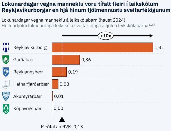 „Á haustönn 2024 voru 1,3 lokunardagar á hvert barn í borgarreknum leikskólum en 0,13 dagar að meðaltali í leikskólum annarra sveitarfélaga,” segir meðal annars í inngangsorðum tilkynningar Viðskiptaráðs um niðurstöður úttektarinnar sem ráðið birtir í morgun. Engin lokun í Kópavogi Ráðið hafi sent fyrirspurn um fjölda lokunardaga vegna manneklu og skipulagðra lokunardaga til sex stærstu sveitarfélaga landsins, það er Reykjavíkurborgar, Garðabæjar, Reykjanesbæjar, Hafnarfjarðar, Akureyrar og Kópavogs. Niðurstöður úttektarinnar byggja á svörum sveitarfélaganna auk upplýsinga sem fyrir liggja á heimasíðum þeirra og könnunum um ánægju íbúa með þjónustu þeirra. Þá er tekið fram að úttektin nái aðeins til leikskóla sem reknir eru af sveitarfélögum en sjálfstætt starfandi leikskólar eru undanskildir. Viðskiptaráð „Lokunardagar vegna manneklu voru 1,3 á hvert barn á borgarreknum leikskólum haustið 2024 en slíkir dagar voru að jafnaði 0,13 á barn í hinum sveitarfélögunum. Í leikskólum Garðabæjar voru lokunardagar vegna manneklu næst flestir, eða 0,36 á hvert barn, en það eru tæplega fjórfalt færri dagar á barn en hjá Reykjavíkurborg,“ segir meðal annars í tilkynningu ráðsins en myndin hér að ofan sýnir betur fjölda lokunardaga á hvert leikskólabarn vegna manneklu eftir sveitarfélögum. Engir lokunardagar voru í leikskólum Kópavogs á tímabilinu og næst fæstir voru lokunardagar á Akureyri. „Lokunardagar vegna manneklu reiknast sem fjöldi barna sem þurfa að vera heima í hvert skipti sem deild lokar. Ef 10 barna deild lokar í 2 daga telst það til dæmis sem 20 lokunardagar. Lokunardagar eru reiknaðir í heilsdagsígildi en ef lokun er hluta úr degi telst það sem hálfur lokunardagur og telst þá aðeins sá fjöldi barna sem er heima að hverju sinni þegar deild lokar,“ segir um aðferðarfræðina við útreikning fjölda lokunardaga á hvert barn. Einn af hverjum fjórum leikskólum með lokunardaga Þá var hlutfallslega mest um lokanir vegna manneklu í Reykjavík á umræddu tímabili þar sem deild var lokað í þremur af hverjum fimm leikskólum. Aftur voru engar lokanir í Kópavogi en myndin hér að neðan sýnir betur hvernig hlutfallið var eftir sveitarfélögum á tímabilinu hvað þetta varðar. Viðskiptaráð Um fjörutíu börn heima í næstum mánuð Tæplega fjögur hundruð börn sem eru á leikskóla í Reykjavík voru heima í tvær leikskólavikur eða meira sökum manneklu í fyrrahaust. Samkvæmt svörum borgarinnar við fyrirspurn Viðskiptaráðs þurftu ríflega 40% barna á leikskólum borgarinnar að fara heim einhvern tímann á tímabilinu, ýmist hluta úr degi eða í heilan dag. Þá þurfti fjórða hvert barn að vera heima oftar en einu sinni á tímabilinu og 39 börn voru heima í átján leikskóladaga á tímabilinu, eða tæpar fjórar vikur. Viðskiptaráð „Heildarfjöldi lokunardaga nam 10.769 hjá leikskólum Reykjavíkurborgar haustið 2024. Það þýðir að ófyrirséðar lokanir hafa raskað rúmlega 10.000 dögum fjölskyldna í Reykjavík með tilheyrandi neikvæðum áhrifum á atvinnu- og fjölskyldulíf. Ef tíðni lokana er sambærileg á vorönn má gera ráð fyrir tvöföldum þeim dagafjölda yfir veturinn í heild,“ segir í tilkynningunni. Ánægja með þjónustu Reykjavíkurborgar liggur ekki fyrir Samkvæmt árlegri þjónustukönnun Gallup mælist ánægjan mest í Garðabæ af sveitarfélögunum sex árið 2024. Þá næst koma Hafnarfjörður og Akureyri og síðan Kópavogur þar sem ánægjan mælist á pari við landsmeðaltal. Ánægjan í Reykjanesbæ mælist undir meðaltali en tekið er fram í tilkynningu Viðskiptaráðs að niðurstöður um ánægju íbúa í Reykjavík með leikskólaþjónustu liggi ekki fyrir þar sem borgin hafi árið 2016 ákveðið að hætta þátttöku í þjónustukönnunum Gallup. Sökum þessa liggi ekki fyrir samanburðarhæfar niðurstöður um þetta efni. Flestir skipulagðir lokunardagar í Reykjanesbæ Loks var skoðaður fjöldi skipulagðra lokunardaga á leikskólum sveitarfélaganna en þar kemur í ljós að að jafnaði eru slíkir dagar 26 talsins, það er sumarleyfisdagar ásamt skipulagsdögum. Fjöldi þessara daga reyndist svipaður í flestum sveitarfélögum, en flestir eru þeir 29 í Reykjanesbæ og fæstir 25 í Garðabæ. Viðskiptaráð