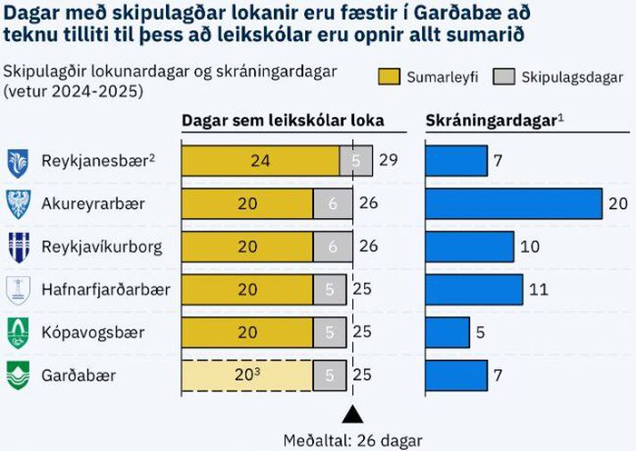 Reykjavík Reykjanesbær Hafnarfjörður Garðabær Kópavogur Akureyri Leikskólar Mest lesið Segir þaggað niður í starfsfólki og hyggst ekki snúa aftur Innlent Sonurinn sefur enn með kylfu undir rúminu Innlent „Versta martröð Trumps“ kjörin borgarstjóri New York Erlent Féll til jarðar rétt eftir flugtak Erlent Fundu 1,7 tonn af kókaíni í kafbát á miðju Atlantshafi Erlent Íslenskum fulltrúum á loftslagsráðstefnu hríðfækkar milli ára Innlent Lokunardagar leikskóla í Reykjavík tíu sinnum algengari en í öðrum stórum sveitarfélögum Innlent Tali ekki fyrir unga Miðflokksmenn Innlent Sjö látnir eftir flugslysið í Kentucky Erlent Gat keypt afmælisblómin eftir að ókunnugur mætti með skóflu Innlent Fleiri fréttir Gat keypt afmælisblómin eftir að ókunnugur mætti með skóflu Íslenskum fulltrúum á loftslagsráðstefnu hríðfækkar milli ára Lokunardagar leikskóla í Reykjavík tíu sinnum algengari en í öðrum stórum sveitarfélögum Sonurinn sefur enn með kylfu undir rúminu Segir þaggað niður í starfsfólki og hyggst ekki snúa aftur Tali ekki fyrir unga Miðflokksmenn Flestir vantreysta ráðherrum Flokks fólksins Eltihrellir lögreglukvenna situr inni fyrir morð Þjófarnir margfölduðu upphæðir við millifærslur Taldi sig sjá bát hvolfa og þyrla og björgunarsveit kölluð út Ákærður fyrir að skjóta að dróna Fiskistofu Grunaðir um hundruð milljóna króna þjófnað en ganga lausir Hundruð kennara nýta gervigreind til að undirbúa kennslu „Upp er runninn Kristrúnar Frostaveturinn mikli“ Starfsmaður Múlaborgar ákærður Gleðiefni að útkomuspá ársins sé á núlli Stefnt að leiðtogaprófkjöri eftir áramót og kunnugleg nöfn mögulega í pottinum Miðflokkurinn með eigið útspil í öryggis- og varnarmálum „Menn eiga ekki að vera að hnýsast í gögn sem þeim koma ekki við“ Reikna með tæplega nítján milljarða afgangi á næsta ári Tekinn í tíunda skipti dópaður og réttindalaus Uppsagnir hjá Icelandair og borgin kynnir fjárhagsáætlun næsta árs „Lífsgæðin mín hafa verið tekin aftur í burtu frá mér“ Bein útsending: Kynnir sína fyrstu fjárhagsáætlun Ölvaður en ekki barnaníðingur Líklegast að Reykjavíkurleiðin taki breytingum eftir umsagnir Harpa Elín Haraldsdóttir er látin Snúin staða Sönnu og sameiginlegt framboð virðist ekki í kortunum Lögreglan innsiglaði Flóka „Við vorum komin með súrefniskúta heim“ Sjá meira
