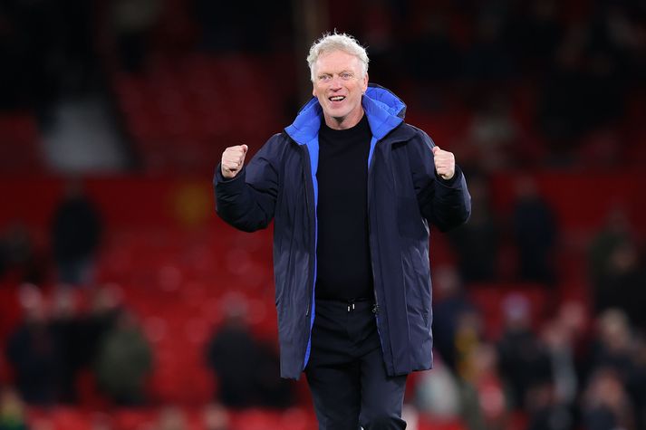 Þrátt fyrir að vera manni færri í 77 mínútur vann Everton United, 0-1, þökk sé marki Kiernans Dewsbury-Hall í fyrri hálfleik. Þetta var fyrsti sigur Moyes sem stjóri gestaliðs á Old Trafford. „Það hefur verið mjög erfitt sem stjóri gestaliðsins að koma og vinna United á útivelli í gegnum árin svo þetta var óvænt í dag, sérstaklega eftir að við urðum manni færri, en við verðskulduðum þetta,“ sagði Moyes við Hjörvar. „Leikmennirnir sýndu mikla þrautseigju og samstöðu og við fengum líka stórkostlegan stuðning hérna.“ Hugsaði um að taka framherjann út af Moyes gerði ekki skiptingu eftir að Gueye fékk rauða spjaldið en nokkru áður hafði Séamus Coleman meiðst og Jake O'Brien kom inn á í hans stað. „Við hugsuðum um að breyta og möguleikinn var kannski að taka framherjann út af og setja Iliman [Ndiaye] jafnvel fram og þétta liðið en Thierno Barry gerði mjög vel og leiddi framlínuna vel,“ sagði Moyes. Kiernan Dewsbury-Hall fagnar marki sínu gegn Manchester United ásamt Iliman Ndiaye.getty/Alex Livesey „Það var áfall að missa Séamus því þetta var fyrsti leikurinn hans. Hann meiddist á læri og því þurftum við að breyta. Ég er vonsvikinn fyrir hans hönd því hann er svo góður strákur.“ Vill koma Everton aftur í Evrópukeppni Hjörvar spurði Moyes hvort Everton gæti endað meðal fimm efstu liða ensku úrvalsdeildarinnar og krækt sér í Meistaradeildarsæti. „Ef þú hefðir sagt það við mig í síðustu viku hefði ég sennilega sagt nei út af liðunum sem eru fyrir ofan okkur en ég ætla að vera jákvæður og vil koma Everton aftur í Evrópukeppni. Ég veit ekki hvort við getum það eða fáum nógu mörg stig. En ég gerði það hjá West Ham. Fyrst björguðum við okkur frá falli og tímabilið þar á eftir komust við í Evrópukeppni,“ sagði Moyes. Moyes stýrði Everton á árunum 2002-13 og tók svo aftur við liðinu í janúar á þessu ári.getty/James Gill „Það yrði frábært fyrir stuðningsmennina að komast aftur í Evrópukeppni. Ég vil gera það. En það er mjög erfitt að spila á fimmtudegi og sunnudegi. Við höfum möguleika á meiri endurheimt líkt og Manchester United. Þeir eru heldur ekki í Evrópukeppni.“ Verður að lifa með sögunni og væntingunum Að lokum spurði Hjörvar Moyes hvort hann hefði samúð með Ruben Amorim, knattspyrnustjóra United. Moyes hefur auðvitað reynslu af því að stýra Rauðu djöflunum en hann tók sem kunnugt er við af Sir Alex Ferguson fyrir tólf árum en entist ekki lengi í starfi á Old Trafford. „Þegar þú kemur til Manchester United verðurðu að lifa með sögunni og væntingunum. Ég þurfti að gera það. Þetta er sérstakt og frábært félag, kröfurnar eru miklar sem og stuðningurinn og allt þetta hangir á þér.“ Að lokum kastaði Moyes kveðju á alla vini sína á Íslandi en fjölskylda hans hefur sterk tengsl við landið. Horfa má á viðtalið við Moyes í spilaranum hér fyrir ofan.