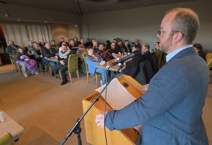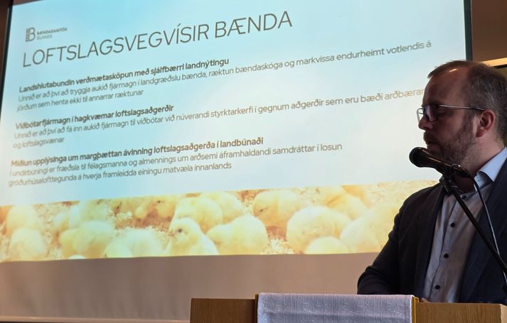 „Fara þarf í raunverulegar aðgerðir“ Magnús Hlynur Hreiðarsson skrifar 27. desember 2025 13:05 Trausti Hjálmarsson, formaður Bændasamtaka Ísland í ræðustól á fundinum á Flúðum. Magnús Hlynur Hreiðarsson „Fara þarf í raunverulegar aðgerðir, sem skila raunverulegum árangri í loftlagsmálum”, segir formaður Bændasamtakanna og bætir við að það hafi verið jákvæð skref í vetur þegar veittur var fjárfestingastuðningur til ylræktarbænda til að draga úr orkukostnaði. Trausti Hjálmarsson, formaður Bændasamtakanna var nýlega með fundarherferð um landið þar sem hann og nokkrir starfsmenn samtakanna funduðu með bænum um málefni landbúnaðarins. Loftlagsmálin voru ofarlega á baugi hjá Trausta. „Og breytingin, sem hefur orðið á allri umræðu við stjórnvöld, þá á ég sérstaklega við Jóhann Pál, umhverfis- og loftlagsráðherra að fyrir ekki mörgum árum snerist öll umræða um loftslagsmálin um skatta og landbúnað. Í dag erum við hins vegar í samtali við þennan ráðherra, ágæta ráðherra, sem er hinn uppáhalds ráðherrann okkar, að fá fjármagn, að það verði bara farið í eins og hann segir sjálfur, raunverulegar aðgerðir, sem skila raunverulegum árangri,” sagði Trausti á fundi á Flúðum en hér vísar hann í ylræktarbændur, sem rækta grænmeti í gróðurhúsum sínum. Fundurinn var vel sóttur af bændum.Magnús Hlynur Hreiðarsson „Hann tók nú fyrsta skrefið í því í vetur þegar hann veitti fjárfestingastuðning í ylræktina til þess að draga úr orkukostnaði og þetta eru jákvæð skref. Þetta eru kannski ekkert endilega stærstu skrefin í upphafi en það skiptir máli að fá gott veður og halda áfram að vinna og stærsta atriðið í þessu er að geta verið á þeim stað að ráðuneyti, séu ekki að taka ákvörðun um starfsskilyrði landbúnaðarins án okkar aðkomu,” bætti Trausti við í ræðu sinni. Hressir og kátir bændur úr uppsveitum Árnessýslu á fundinum.Magnús Hlynur Hreiðarsson Ein af glærunum frá Traust á fundinum.Magnús Hlynur Hreiðarsson Forsvarsmenn Bændasamtakanna og Hrunamannahrepps á fundinum á Flúðum.Magnús Hlynur Hreiðarsson Landbúnaður Loftslagsmál Hrunamannahreppur Mest lesið Hrindir af stað söfnun fyrir föður drengsins Innlent Árekstur á Suðurlandsbraut Innlent Noregur hyggst innleiða samfélagsmiðlabann Erlent Jarðskjálfti við Kleifarvatn Innlent Röð stunguárása í neðanjarðarlestinni Erlent Leita í rústum íbúðahúsa Erlent Ísrael viðurkennir sjálfstæði Sómalílands fyrst allra landa Erlent Brenndu rangt lík Erlent Stöðvuðu menn í ofbeldishug við landamærin Innlent Handteknir grunaðir um framleiðslu fíkniefna Innlent Fleiri fréttir Frumkvæðisvinna lögreglu að loka fjórum afhendingarstöðum „Fara þarf í raunverulegar aðgerðir“ Hrindir af stað söfnun fyrir föður drengsins Kjartan sækist ekki eftir endurráðningu sem bæjarstjóri Landeldi í vexti og lögregla lokar áfengisverslunum Árekstur á Suðurlandsbraut Ekki talinn tengjast aukinni eldvirkni Handteknir grunaðir um framleiðslu fíkniefna Jarðskjálfti við Kleifarvatn Lögreglumenn eltu lausa hesta Lögregla lokaði Smáríkinu og Nýju vínbúðinni Stöðvuðu menn í ofbeldishug við landamærin Piltur skilinn eftir ber að ofan og skólaus eftir hrottafengna árás Dæmdur fyrir líkamsárás í matsalnum Engir ælupokar notaðir, þetta var núllpokaflug Hafði komið sér fyrir á háalofti hótels Tap upp á 130 milljónir og neikvætt eigið fé upp á aðrar 26 Umferðin róleg í kirkjugörðunum Töpuðu tæpum hundrað milljónum Milljónir í sekt fyrir að bakka á konu Þörf á að skerpa á verklagi spítalans í heimilisofbeldismálum Engin jólamessa vegna rafmagnsleysis Klæðning fauk af Stjórnsýsluhúsinu og skemmdi bíla Gleðileg jól, kæru lesendur Einn fluttur á sjúkrahús eftir bílslys Skiluðu hagnaði á kosningaári Hátíðarveisla á kaffistofu Samhjálpar: „Það er ró og friður yfir fólki“ Björgunarsveitin kölluð út í fokverkefni Grjóthrun undir Eyjafjöllum Fátækari eftir að hafa svindlað á ferðakonum Sjá meira