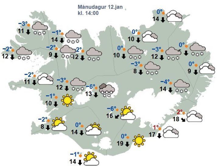 Gæti slegið í storm og hringvegurinn lokaður Atli Ísleifsson skrifar 12. janúar 2026 07:15 Gular viðvaranir eru í gildi á sunnan- og austanverðu landinu. Vísir/RAX Alldjúp lægð við Færeyjar beinir norðlægri átt til landsins í dag sem víðast verður 10 til 18 metrar á sekúndu. Á Suðausturlandi og Austfjörðum má hins vegar búast við hvassviðri eða stormi og einnig getur slegið í storm í staðbundnum vindstrengjum á Suðurlandi og við Faxaflóa. Í hugleiðingum veðurfræðings á vef Veðurstofunnar segir að norðanáttinni fylgi snjókoma eða él víða um land og líkur séu á að færð spillist í skafrenningi fyrir austan. Sunnanlands verður lengst af úrkomulítið. Gular viðvaranir eru í gildi á Suðurlandi, Austurlandi að Glettingi, Austfjörðum, Suðausturlandi og Miðhálandi fram eftir degi en til morguns á Suðaustur- og Austurlandi. Hringvegurinn á milli Kirkjubæjarklausturs og Hafnar er enn lokaður og stendur til að athuga málið aftur klukkan tíu. Veginum var lokað í gærkvöldi klukkan níu vegna óveðurs sem þar gengur nú yfir. Frost á landinu verður á bilinu núll til sex stig.„Í fyrramálið verður lægðin fyrir norðaustan land og heldur farin að grynnast. Áttin verður því norðvestlæg, víða 13-20 m/s, en hægari vestantil. Nýjustu spár gera ráð fyrir áframhaldandi ofankomu á Norðurlandi, en yfirleitt þurru veðri syðra. Herðir á frosti. Þegar líður á daginn dregur svo smám saman úr vindi,“ segir á vef Veðurstofunnar. Spákort fyrir klukkan 14.Veðurstofan Veðurhorfur á landinu næstu daga Á þriðjudag: Norðvestan 13-20 m/s, en mun hægari um landið vestanvert. Él norðaustanlands, annars þurrt að kalla. Frost 3 til 12 stig. Dregur smám saman úr vindi eftir hádegi. Á miðvikudag: Norðaustlæg eða breytileg átt 5-13. Lítilsháttar snjókoma norðantil, en lengst af þurrt í öðrum landshlutum. Frost 1 til 10 stig. Á fimmtudag og föstudag: Norðvestan og norðan 5-10 og él, en þurrt um landið sunnanvert. Áfram svalt. Á laugardag: Vaxandi suðaustanátt. Hlýnar sunnan- og vestanlands seinnipartinn með slyddu og síðar rigningu, en þurrt um landið norðaustanvert. Á sunnudag: Suðlæg átt og skúrir eða él, en rigning austantil. Veður Mest lesið Sturla Böðvarsson er látinn Innlent Danir standi á krossgötum Erlent Sérsveitaraðgerð á Selfossi Innlent Segir Kúbu að semja áður en það verður of seint Erlent Gæti slegið í storm og hringvegurinn lokaður Veður Draumur að skipuleggja kvennaverkfall í Þýskalandi Innlent Átti í útistöðum við Frú Ragnheiði Innlent Forsjá varla ákveðin útfrá erfðafræðilegum tengslum Innlent Útkoman mikill skellur eftir að vonarneisti kviknaði Innlent Trump íhugar íhlutun í Íran Erlent Fleiri fréttir Gæti slegið í storm og hringvegurinn lokaður Óvissustig á vegi milli Kirkjubæjarklausturs og Jökulsárlóns Gular veðurviðvaranir framundan Útlit fyrir hríðarveður á austasta hluta landsins í kvöld Frost og hægur vindur Norðaustlæg átt og allvíða él Veginum lokað við Skaftafell og fólk leitar í fjöldahjálparstöð Vara við eldingum á Suðausturlandi Gular viðvaranir vegna norðaustan hríðar Áfram kalt á landinu Óvenjulega hlýr desember Áfram kalt og lægðir sækja að landinu Hægir vindar og snjókoma norðan- og austantil Þykknar upp og snjóar Allt að tuttugu stiga frost en bjart víða Rólegt veður en kalt næstu daga Kólnar verulega á fyrstu dögum ársins Gular viðvaranir taka gildi Hvessir þegar líður á daginn Spáin fyrir gamlárskvöld að teiknast upp Frystir norðaustantil í kvöld Væta vestantil eftir hádegi Kuldaskil á leið yfir landið Fyrstu þreifingar áramótaveðurspár Gefur lítið fyrir staðhæfingar um nýfallið hitamet Hitinn fór í 19,8 stig og desembermetið slegið Jólin verða rauð eftir allt saman Gengur í langvinnt hvassviðri seinni partinn Hiti geti mest náð átján stigum Vara við hættu á skriðuföllum og krapaflóðum Sjá meira