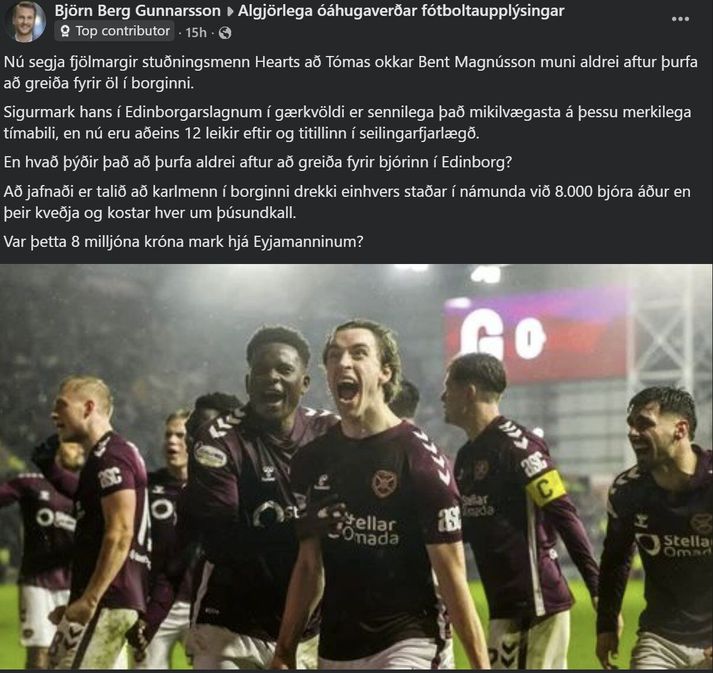 Hetjan Tómas þyrfti aldrei að greiða fyrir öl: „Ég drekk ekki“ Aron Guðmundsson skrifar 12. febrúar 2026 08:32 Tómas fagnar hér mikilvægu marki sínu gegn erkifjendum Hearts í liði Hibernian. Vísir/Getty Ætla má að sigurmark Tómasar Bent Magnússonar í Edinborgarslagnum í fótbolta hafi skipað honum sess í hjörtum stuðningsmanna Hearts um ókomna tíð. Markið, sem Tómas tileinkar dóttur sinni sem von er á í heiminn hvað úr hverju, gæti reynst afar mikilvægt fyrir liðið í baráttunni um skoska meistaratitilinn. Það ætlaði gjörsamlega allt um koll að keyra á Tynecastle Park leikvanginum á þriðjudaginn þegar að Tómas Bent, sem hafði komið inn á sem varamaður í seinni hálfleik, tryggði Hearts sigur í Edinborgarslagnum gegn erkifjendunum í Hibernian, með marki undir lok venjulegs leiktíma. „Þetta er náttúrulega bara geðveikt, svona margir að tryllast og það að þetta hafi gerst í þessum leik,“ segir Tómas í samtali við íþróttadeild Sýnar. „Þessi sigurleikur hefur aðeins meiri þýðingu fyrir stuðningsmenn heldur en aðrir leikir, að vinna þennan Edinborgarslag.“ Og stigin þrjú sem Tómas tryggði sínu liði gætu reynst afar dýrmæt í lok tímabils en Hearts vermir toppsæti skosku deildarinnar um þessar mundir og er í seilingarfjarlægð frá risunum í Rangers og Celtic. Komið fram yfir settan dag Tómas tileinkaði dóttur sinni, sem von er á í heiminn á hverri, stundu markið með fagni þar sem Tómas lét eins og hann væri að vagga barni. Settur dagur var á föstudaginn síðastliðinn. Fagn Tómasar var úthugsaðVísir/Getty „Ég var búinn að ákveða það fyrir að ég myndi fagna svona ef ég myndi skora. Það er lítil stelpa á leiðinni, hún gæti bara komið hvenær sem er. Þetta var tileinkað henni. Þetta er allt nýtt fyrir mér. Fyrsta barn og maður er bara þokkalega nýkominn hingað út. Þetta eru ákveðin viðbrigði en bara gaman að vera í þessu öllu, ég er spenntur fyrir föðurhlutverkinu.“ Græðir lítið á því að þurfa ekki að kaupa bjór Í færslu á samfélagsmiðlum benti fjármálaráðgjafinn Björn Berg Gunnarsson, sem jafnframt er mikill áhugamaður um skoska boltann, að margir stuðningsmenn Hearts segðu Tómas Bent aldrei aftur þurfa greiða fyrir öl í borginni eftir sigurmarkið í Edinborgarslagnum. „Ég verð þá að byrja að drekka. Ég drekk ekki. Það er ákveðið klúður ef þetta er það sem maður fær fyrir að skora í þessum leik. En það er bara flott ef fólk splæsir á mig einhverjum drykk.“ Það fylgdi sigri Hearts gegn Hibernian ákveðinn meistarabragur. Ljóst er að baráttan verður hörð um skoska meistaratitilinn allt til loka tímabilsins. „Það er alveg búið að tala um það þannig, að geta sótt þessa sigra þó svo að leikurinn sé ekki fallegur. Þetta var einn af þeim sigrum og við höfum náð þeim fyrr á tímabilinu. Vonandi getum við haldið áfram að vinna leiki, tekið þetta leik fyrir leik.“ Skoski boltinn Mest lesið Forsætisráðherra og fleiri krefjast afsökunarbeiðni frá eiganda Man. United Enski boltinn Ólympíumeistarinn sem fer eigin leiðir og keppir undir söng Laufeyjar Sport Vonn á batavegi eftir þriðju aðgerðina Sport Stal kreditkorti liðsfélaga og fagnaði gulli fyrir framan hana Sport Hetjan Tómas þyrfti aldrei að greiða fyrir öl: „Ég drekk ekki“ Fótbolti Fyrrverandi kærasta Sturlu tjáir sig: „Sárt að þurfa að standa í þessu“ Sport Liverpool fyrsta liðið til að sækja sigur gegn Sunderland Enski boltinn Orri fagnaði sætum bikarsigri í Baskalandi Fótbolti Nottingham Forest rak stjórann í þriðja sinn á leiktíðinni Enski boltinn Shabazz á Krókinn Körfubolti Fleiri fréttir Sjáðu sigurmark Liverpool, markaveislu City í fyrri og tvö sjálfsmörk sem réðu öllu Hetjan Tómas þyrfti aldrei að greiða fyrir öl: „Ég drekk ekki“ Nottingham Forest rak stjórann í þriðja sinn á leiktíðinni Forsætisráðherra og fleiri krefjast afsökunarbeiðni frá eiganda Man. United Real Madrid lúffar fyrir UEFA í deilum um Ofurdeildina Guðrún gerði sér góða ferð til Portúgal Orri fagnaði sætum bikarsigri í Baskalandi Liverpool fyrsta liðið til að sækja sigur gegn Sunderland Heppnin með Bayern á leið í langþráð undanúrslit Burnley sótti lygilegan sigur og Villa vann þökk sé sjálfsmarki Sverrir heimsótti óvinnandi vígi Viktor fór illa með færin en fagnaði sigri gegn Ísaki Sjö marka skellur hjá Blikum í Svíþjóð City kláraði Fulham fagmannlega í fyrri hálfleik Hörður Björgvin fiskaði rautt en féll úr leik í bikarnum „Þetta er allt annað dæmi“ Atvinnulaus Jóhann kallaður í landsliðið Íslenska deildin byrjar langsíðust Hætti við að panta flug til London og samdi í staðinn til 2028 Frank rekinn frá Tottenham Mætt í fyrsta sinn til Evrópu og klár í erfiða áskorun með Blikum í dag Sjáðu ótrúlega dauðafærið sem Palmer klúðraði og öll mörkin úr enska Mögulegur framtíðarstjóri Manchester United missir starfið Finnst ólukkan elta Liverpool Engin klipping því Manchester United gerði jafntefli Tómas hetjan á dramatískan hátt í Edinborgarslagnum Tottenham í tómu tjóni Chelsea glutraði niður góðri forystu gegn Leeds United Stórsér á Jóni Degi eftir fyrstu dagana í Brann Ræddu mögulegan arftaka Pep Sjá meira
