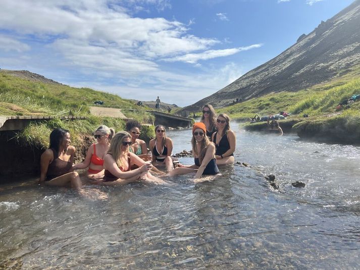 Vinkonuferð til Íslands tók óvænta stefnu Auður Ösp Guðmundsdóttir skrifar 16. febrúar 2026 09:01 Avery átti allra síst von á að finna ástina hér á landi. Aðsend Avery Francis fór í stelpuferð til Íslands, eftir ár sem hún lýsir sem því versta í sínu lífi. Skipbrot í starfi, kulnun og áföll í einkalífi höfðu tekið sinn toll og hún hafði verið einhleyp í sex ár. Hún var ekki að leita að sambandi. Síðasta kvöldið í ferðinni kynntist hún íslenskum manni í miðbæ Reykjavíkur og þar kviknaði eitthvað óvænt. Þau hittust aftur ári síðar, fyrir einskæra tilviljun. Nú eru þau hjón og Avery býr hér og skipuleggur kvennaferðir til Íslands, sem hún kallar besta stað í heimi. Avery ólst upp í Kanada, nánar tiltekið í bænum Caledon, skammt norðvestur af Toronto. Hún lærði skapandi markaðsfræði og auglýsingagerð í háskóla og fór svo út á vinnumarkaðinn, þar sem hún starfaði í rúman áratug í mannauðsmálum. Árið 2017 var mjög afdrifaríkt ár í lífi hennar. „Hún varð fyrir kynferðislegu ofbeldi á vinnustað og það varð algjör vendipunktur á ferlinum mínum. Mér leið eins og mér hefði hreinlega verið ýtt út af vinnumarkaðinum og ég upplifði mig algjörlega vanmáttuga. Á sama tíma þurfti ég að hafa tekjur til að lifa af, borga reikninga og húsaleigu, en ég gat ekki lengur séð fyrir mér að starfa í hefðbundnu vinnuumhverfi.“ Þetta varð til þess að Avery ákvað að stofna sitt eigið fyrirtæki, sem fékk nafnið Bloom. „Bloom varð í grunninn til út frá minni eigin reynslu. Fyrir manneskju sem starfaði í mannauðsmálum var þessi reynsla sjokkerandi og það setti mig algjörlega úr skorðum.“ Fyrirtækið leggur áherslu á stefnumótandi mannauðsstjórnun, fræðslu og þjálfun þegar kemur að kúgun og misrétti á vinnustöðum og aðstoðar fyrirtæki og stofnanir við að þróa og bæta reglur og verklag. „Í Kanada vorum við fyrsta fyrirtækið, svo ég viti til, til að innleiða fjögurra daga vinnuviku og setja á fót sérstakan fjárhagsramma fyrir blæðingar og tíðavörur. Þetta voru mál sem ég brann virkilega fyrir. Við höfum unnið með stórum stofnunum og kanadískum stjórnvöldum, og líka stórum fyrirtækjum eins og Spotify, Smart Suites og Shopify. Í kjarna Bloom er fræðsla. Við kennum fólki hluti sem við ættum í hreinskilni sagt að hafa lært í skóla. Það er gífurlegt bil í menntun og fræðslu, sérstaklega í fjölmenningarlegu landi eins og Kanada.“ Varð ástfangin af Íslandi Árið 2015 heimsótti Avery Ísland í fyrsta skipti – og kolféll fyrir landinu og þjóð. „Það er næstum hálfvandræðalegt að viðurkenna það en ég kom til Íslands af því að ég sá færslu sem Beyoncé deildi á Instagram. Ég man þegar hún birti mynd af sér í Bláa lóninu. Það var það sem kom hugmyndinni af stað. Þegar ég sá hana hugsaði ég bara: „Guð minn góður. Ég veit ekki hvar hún er, en ég verð að fara þangað.“ Ég sannfærði tvær vinkonur mínar um að koma með mér og við skipulögðum stelpuferð en við vissum allar mjög lítið um landið. Þetta var fyrsta stelpuferðin sem ég hafði farið í. Við fórum í bakpokaferðalag um landið og enduðum á tónlistarhátíð í Reykjavík. Mér fannst ég svífa, mér leið svo dásamlega. Ég var bara svo hamingjusöm. Við þrjár enduðum á því að dansa á borði á hátíðinni og ég man að ég hugsaði: „Þetta er besti dagur lífs míns,“ segir Avery og bætir við: „Ég hef farið í stórar vinkvennaferðir til Grikklands, Spánar, Króatíu og á aðra staði. En sama hvert ég hef farið, þá er eitthvað við Ísland sem er öðruvísi. Það er eitthvað við landið hér sem er svo græðandi og það er eitthvað sérstakt við náttúruna á Íslandi sem fyllir mann algjörri lotningu.“ Avery varð ástfangin af Íslandi í fyrstu ferð sinni hingað árið 2015.Aðsend Næstu tvö ár á eftir heimsótti Avery Ísland reglulega. „Árið 2022 skipulagði ég síðan ferð til Íslands fyrir mig og sjö kvenna teymi úr fyrirtækinu mínu, og það var ótrúleg ferð.“ Síðan leið rúmt ár og á þeim tíma gekk Avery í gegnum afar krefjandi tíma, bæði í starfi og einkalífi. „Þetta var versta ár ævi minnar. Það voru alls konar litlir streituvaldar sem komu upp á sama tíma og svo varð algjört upplausnarástand í teyminu í fyrirtækinu mínu. Samskiptin breyttust og á nokkrum mánuðum breyttist allt teymið mitt. Sjálfstraustið var algjörlega í molum af því að sjálfsmyndin mín var svo nátengd vinnunni minni. Þegar allt fór að hrynja fannst mér ég vera algjörlega misheppnuð. Ég upplifði kulnun, svik og sorg sem hlóðust ofan á hvort annað.“ Upplifði ró og öryggi Síðar kom Avery aftur til Íslands ásamt níu kvenna hópi, sem í þetta sinn voru ekki samstarfsfélagar hennar heldur vinkonur. Þær dvöldu hér á landi í fjóra daga og gistu í húsi í útjaðri Reykjavíkur. „Ferðin átti upphaflega að vera önnur ferð með Bloom teyminu, en eftir það sem gekk á árið 2022 þá hugsaði ég með mér: „Ókei, ég breyti þessu bara í vinkonuferð í staðinn.“ Engin af þeim hafði komið til Íslands áður.“ Á meðan á ferðinni stóð fóru vinkonurnar í fjallgöngur og skoðuðu eldgos. „Í fyrsta sinn í marga mánuði var ég ekki límd við símann eða með vinnuna á heilanum. Ég var ekki einhvers staðar annars staðar í huganum, ég var fullkomlega til staðar. Ég hló, svaf vært og leyfði konunum sem þekkja mig best að halda utan um mig. Og mér fannst ég aftur verða ég sjálf.“ Vinkonurnar heimsóttu gosstöðvarnar.Aðsend Örlagaríkt kvöld Þegar komið var að síðasta kvöldi ferðarinnar skelltu vinkonurnar sér út á lífið í miðbæ Reykjavíkur og fóru á