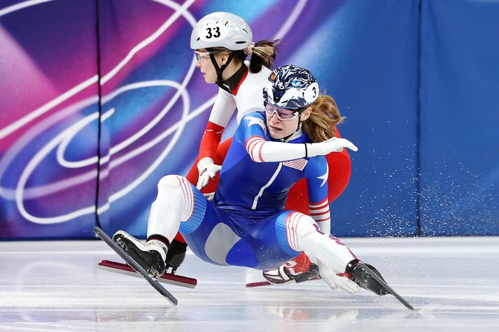 Hin 24 ára gamla Stoddard missti þar af verðlaunum eins og fyrir fjórum árum þegar hún nefbrotnaði við fall í 500 metra skautasprettinum en hún keppir í skautaati. Nú þurfti hún enn og aftur að sætta sig við fall. Mætti með miklar vonir og drauma „Ég kom til Ólympíuleikanna 2026 með miklar vonir og drauma um að koma heim með mörg verðlaun, miðað við hversu vel mér gekk á heimsbikartímabilinu. Það hefur því miður ekki gengið eftir,“ skrifaði Stoddard. Það þarf lítið til að detta í hamaganginum í skautaatinu og hér steinliggur Corinne Stoddard í 1000 metra sprettinum.Getty/ Sarah Stier Hún hafði unnið ellefu verðlaun á heimsbikarnum á tímabilinu 2025-26 og vann tólf verðlaun tímabilið á undan. Hún vann líka eitt silfur og tvenn bronsverðlaun á heimsmeistaramótinu 2024. „Ég er ekki viss um hvað hefur verið í gangi. Hluti af mér heldur að ég hafi ekki ráðið við pressuna og væntingarnar sem ég setti á sjálfa mig. Hinn hlutinn af mér finnur fyrir svo mikilli líkamlegri þreytu í hvert skipti sem ég reyni að keppa,“ skrifaði Stoddard. Kiknað á Ólympíusviðinu, aftur og aftur „Öll þessi reynsla hefur verið ótrúlega óheppileg og ég skammast mín fyrir hversu oft ég hef dottið, sérstaklega þar sem ég er ekki íþróttamaður sem er þekktur fyrir að detta oft. Ég skammast mín líka fyrir hversu oft ég hef kiknað undan álagi á Ólympíusviðinu, aftur og aftur. Þetta er ekki það sem ég ætlaði að sýna heiminum að ég gæti,“ skrifaði Stoddard. Hún á samt eftir eina keppni á þessum leikum. „Ég bið vini mína og fjölskyldu afsökunar á því að hafa horft á mig þjást svo oft síðustu vikuna. Ég á eitt síðasta tækifæri þann 20. febrúar (1500 m) og þá lýkur Ólympíuleikunum 2026 fyrir mitt leyti. Takk allir sem hafið haldið áfram að vera til staðar fyrir mig. Fyrirgefðu að ég hef ekki verið ég sjálfur,“ skrifaði Stoddard. View this post on Instagram A post shared by Corinne Stoddard (@c0rie815)