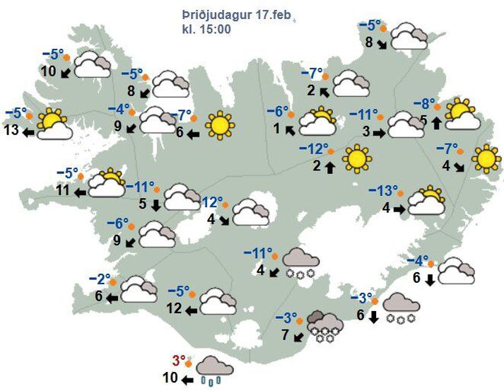 Útlit fyrir hríðarbyl á Suðurlandi Atli Ísleifsson skrifar 17. febrúar 2026 07:10 Frost verður þrjú til átján stig og kaldast inn til landsins. Vísir/Vilhelm Veðurstofan gerir ráð fyrir fremur hægri norðanátt og dálitlum éljum norðanlands í dag. Spáð er hægt vaxandi austan- og norðaustanátt og mun þykkna upp vestanlands. Gera má ráð fyrir 13 til 20 metrum á sekúndu og snjókomu sunnanlands undir kvöld. Er útlit fyrir hríðarbyl á Suðurlandi í nótt og framan af morgundegi. Frost verður þrjú til átján stig og kaldast inn til landsins. Frostlaust allra syðst í kvöld. „Bætir í vind norðanlands síðdegis á morgun með samfelldri snjókomu. Frostlaust allra syðst en annars frost 0 til 8 stig. Enn er nokkur óvissa um hvar staðsetning úrkomubakkana og er fólk hvatt til að fylgast vel með spám,“ segir í hugleiðingum veðurfræðings. Spákort fyrir klukkan 15 í dag.Veðurstofan Veðurhorfur á landinu næstu daga Á miðvikudag: Norðlæg átt 5-13 m/s, en hvassari á stöku stað. Él um landið norðan- og vestanvert, en snjókoma suðaustanlands. Frost 0 til 10 stig, kaldast inn til landsins. Á fimmtudag: Norðaustan 8-15 m/s norðvestantil en annars hægari norðlæg átt. Snjókoma eða él um landið norðanvert en annars þurrt að kalla. Hiti breytist lítið. Á föstudag: Norðaustan 5-15 m/s, hvassast norðvestantil og með austurströndinni. Él um landið norðanvert, en bjarviðri syðst. Dregur heldur úr frosti. Á laugardag: Austlæg átt, 3-10 m/s. Smáél fyrir norðan og austan en annars víða léttskýjað. Sums staðar frostlaust við sjóinn en kalt inn til landsins. Á sunnudag: Austan og norðaustan 8-15. Rigning, slydda eða snjókoma en úrkomulítið norðantil. Hiti víða 0 til 4 stig syðst, en annars vægt frost. Á mánudag: Útlit fyrir austlæga eða breytilega átt. Skýjað og dálítil úrkoma í flestum landshlutum. Allvíða frostlaust við ströndina en annars vægt frost. Veður Mest lesið „Maður eiginlega skammast sín eftir á að hafa verið stressaður“ Innlent Nýr samfélagsmiðill bara fyrir Íslendinga Innlent Seldi Pokémon-spjald á yfir tvo milljarða Erlent Földu fíkniefni í morgunkornspökkum og fengu send Innlent Skoða að ná Lúðvík upp áður en sprungan verður fyllt Innlent Útlit fyrir hríðarbyl á Suðurlandi Veður Opinbera komið til móts við fimm ábendingar af 23 Innlent „Alveg hræðilegt ástand“ Innlent „Ég vil bara að þetta sé sanngjarnt. Að komið sé eins fram við alla“ Erlent Grunaður fíkniefnasali stöðvaður fyrir að tala í síma Innlent Fleiri fréttir Útlit fyrir hríðarbyl á Suðurlandi Draga kalt heimskautaloft yfir landið næstu daga Vara við snörpum vindhviðum Köldu heimskautalofti enn beint til landsins Kaldri norðlægri átt beint til landsins Dálítil él norðan- og austantil en annars bjart að mestu Dregur úr vindi og kólnar í kvöld Vindasamt víða á landinu Áfram léttskýjað á Suðvesturhorninu Éljagangur og slabb í kortunum Skil að ganga yfir landið með tilheyrandi úrkomu Ekkert lát á austlægum áttum Allhvass vindur og svalari en síðustu daga Áfram austanátt og kólnar í kvöld Ekkert óvenjulegt við kalt og bjart veður Hvassast við suðurströndina Má búast við skúrum eða éljum Víðast úrkomulítið en skúrir og slydduél austantil Mildri austanátt beint til landsins Áfram hvasst með suðurströndinni Slær áfram í storm á suðurströndinni Djúp lægð veldur stormi syðst á landinu Þurrt og bjart víða um landið Hvasst syðst á landinu Kólnandi veður og víða bjart Ákveðin austanátt á landinu öllu og víða snarpar hviður Víða rigning með köflum og bætir í vind í kvöld Róleg austanátt en hvessir á morgun Víða rigning og kólnar í veðri Minnkandi norðlæg átt en bætir í vind á morgun Sjá meira
