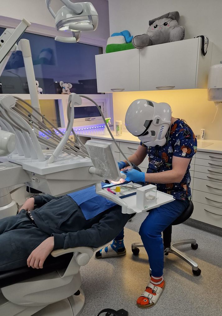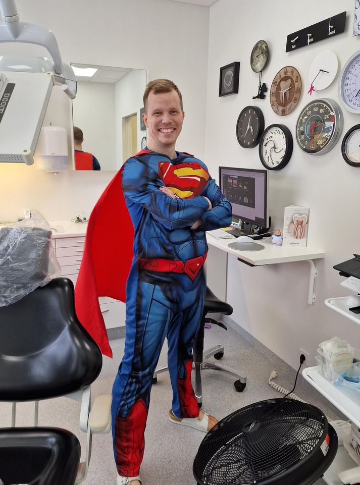 „Já, það var tannkrem þetta árið aðallega af því að það er svo erfitt að vera tannþráður. Ég hef klæðst í alls konar búninga á öskudaginn síðustu ár. Búningarnir vekja alltaf athygli og viðskiptavinirnir taka þeim vel. Öskudagurinn er alltaf i miklu uppáhaldi hjá mér“, segir Sverrir Örn, kátur og hress með daginn. Öskudagurinn eitt árið hjá Sverri.Aðsend Sverrir Örn við vinnu sína á tannlæknastofnunni í búningi einn öskudaginn.Aðsend