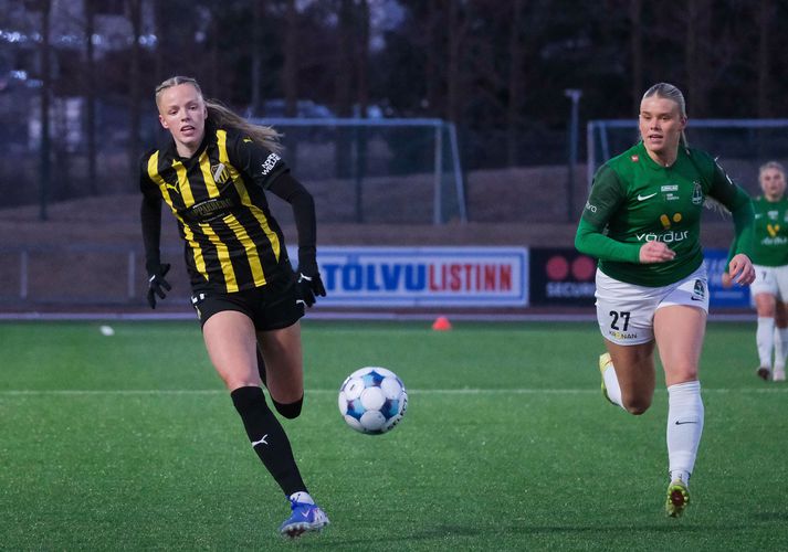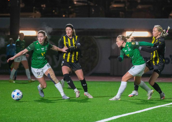 Elísa skoraði glæsimark hjá Fanneyju en Blikar töpuðu 11-1 samanlagt Óskar Ófeigur Jónsson skrifar 18. febrúar 2026 19:54 Elísa Viðarsdóttir skoraði sitt fyrsta mark fyrir Blika og það var ekkert smámark. Hér fagna liðsfélagar hennar með henni eftir markið. Víisr/Anton Breiðablik er úr leik í Evrópubikar kvenna í fótbolta eftir þriggja marka tap í seinni leiknum á móti Svíþjóðarmeisturum Häcken, 4-1, á Kópavogsvellinum í kvöld. Häcken vann fyrri leikinn 7-0 og var því komið áfram í raunheimum en þessi seinni leikur snérist því meira um heiðurinn og samkeppnishæfni Íslandsmeistaranna. Blikar hafa misst marga leikmenn í vetur, alla sókndjörfustu leikmennina og klettinn inni á miðjunni svo eitthvað sé nefnt. Það er ljóst að sá missir þýddi að Blikarnir áttu enga möguleika í þessu einvígi á móti Häcken. 4-1 tap þýðir að Blikar töpuðu 11-1 samanlagt. Häcken tryggði sér leiki á móti Eintracht Frankfurt í undanúrslitum keppninnar. Thelma Karen Pálmadóttir á ferðinni í leiknum í kvöld.Vísir/Anton Tvær íslenskar landsliðskonur voru í byrjunarliði Häcken eins og í fyrri leiknum. Fanney Inga Birkisdóttir stóð í markinu og Thelma Karen Pálmadóttir var úti á hægri kanti. Thelma Karen fór út af í hálfleik en hafði skapað nokkrum sinnum hættu í fyrri hálfleiknum. Paulina Nyström var búin að koma Häcken í 1-0 strax með hniðmiðuðu skoti fyrir utan teig á annarri mínútu leiksins og það stefndi því í annað hryllingskvöld. Miðvörðurinn Emma Östlund skoraði annað markið á 18. mínútu eftir hornspyrnu frá Tabby Tindell. Blikar minnkuðu muninn í seinni hálfleik með frábæru marki frá Elísu Viðarsdóttur. Hún fékk þá boltann frá Edith Kristínu Kristjánsdóttur og lét vaða. Boltinn fór beint upp í fjærhornið, óverjandi fyrir Fanneyju Ingu í marki Häcken. Sænska liðið svaraði með flottu skoti þegar bakvörðurinn Alva Selerud lét vaða og skoraði flott mark. Fjórum mínútum síðar var staðan orðin 4-1 eftir annað skot rétt utan vítateigs, nú frá Monicu Jusu Bah. Vísir/Anton Evrópubikar kvenna í fótbolta Breiðablik Mest lesið Skíðasambandinu fannst Halldór of slæm fyrirmynd Sport Rikki G kafnaði aftur í beinni útsendingu Fótbolti Stækkaði typpi skíðastökkvara Sport Undir pressu vegna tengsla við Epstein: „Ég get ekki rekið hann“ Sport Hélt að hundurinn sem hljóp inn á brautina væri úlfur Sport Fær um þrjátíu milljónir í sárabætur frá ríkasta manni Úkraínu Sport Þurfti að flauta af æfingar áður en hann slasaði menn Körfubolti Skýtur skökku við: Beindi spjótum sínum að Mourinho Fótbolti „Breiðablik búið að vera mígandi utan í mig í mörg ár“ Íslenski boltinn Stutt gaman hjá stelpunum okkar í brekkunni Sport Fleiri fréttir Elísa skoraði glæsimark hjá Fanneyju en Blikar töpuðu 11-1 samanlagt Gordon bakarameistarinn í bökun í Bakú Bodø/Glimt - Inter | Ná Norðmenn að stríða risa í vetrarríkinu? Wolves - Arsenal | Mega ekki misstíga sig gegn botnliðinu „Af hverju ætti hann að vera að setja treyjuna yfir munninn?“ Sverrir frá Eyjum til FH Benítez valtur í sessi og gamall lærisveinn hans gæti stýrt Sverri Sparar ekki stóru orðin í garð Íslendingsins sem gæti farið alla leið í boltanum Sjáðu mörkin úr Meistaradeildinni: Dansinn hjá Vinicius, draumaleikur Doué og fimmfaldur fögnuður Valdimar fer ekki til Mexíkó Skýtur skökku við: Beindi spjótum sínum að Mourinho Segist ekki hafa kallað Vinicius apa og Benfica bakkar hann upp „Breiðablik búið að vera mígandi utan í mig í mörg ár“ Rikki G kafnaði aftur í beinni útsendingu Draumabyrjun hjá Dortmund eftir frestun PSG sneri skelfilegri stöðu í Mónakó Madrídingar sóttu sigur eftir mikil læti í Lissabon Saka verður sá launahæsti Klopp hringdi bjöllu og hitti hetjuna sína á ÓL Sagði starfi sínu lausu en fær ekki að fara Gamla konan fékk slæman skell en Galatasaray skellihlær Salah og trúfélagar fá drykkjarhlé í miðjum leikjum Luis Enrique segir orð gullknattarhafans „einskis virði“ Mikel Arteta óttast að tímabil Arsenal stefni í kunnuglega átt Þrjátíu leikja bann: Hljóp reiður inn á og í áttina að Elíasi Stjörnum prýtt lið Englands endurheimtir sterka leikmenn fyrir leik gegn Íslandi Utan vallar: Eins og að missa ljósleiðarann og þurfa að nota aftur gamla módemið „Við vitum hvað við gerðum við konunga Meistaradeildarinnar“ Lærisveinar Lampard höfðu betur í toppslagnum FH hafði betur gegn Stjörnunni Sjá meira