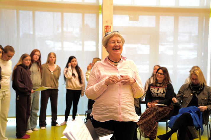 Kórstjórinn sem ól upp kynslóðir Kársnesbúa: „Sönglaus skóli er hjartalaus skóli“ Magnús Jochum Pálsson skrifar 7. mars 2026 07:01 Tóta Björns stýrði þúsundum barna í starfi sínum sem kórstjóri Skólakárs Kársness yfir margra áratuga tímabil. Vísir/Lýður Kórstjórinn Þórunn Björnsdóttir, Tóta eins og hún er yfirleitt kölluð, stofnaði Skólakór Kársness fyrir fimmtíu árum síða, 7. mars 1976. Næstu fjóra áratugina eftir það ól hún upp heilu kynslóðirnar af börnum gegnum kórstarfið. Meðal þeirra sem stigu sín fyrstu skref hjá Tótu eru Emilíana Torrini, Halla Tómasdóttir, Gissur Páll Gissurarson og Erpur. Tóta er fyrsti íslenski grunnskólakennarinn sem fékk kórstarfið inn í stundarskrá og segir sönglausa skóla vera hjartalausa skóla. Skólakór Kársness var stofnaður formlega 7. mars 1976 og fagnar því fimmtíu ára afmæli í dag. Af því tilefni verða haldnir þrennir tónleikar í Salnum í dag þar sem 300 kórbörn úr Kársnesskóla og Barnaskóla Kársness koma fram auk fyrrverandi kórbarna. Fyrstu tveir tónleikarnir, með blönduðum kórahópum úr skólunum, eru klukkan 13 og 14:30 og svo stígur Stjörnukór Kársness á svið klukkan 16:30 en það er opin æfing fyrir fyrrverandi kórfélaga. Í tilefni afmælisins sótti blaðamaður Tótu heim í íbúð hennar í Tryggvagötu en hún flutti þangað fyrir nokkrum árum eftir að hafa búið á Kársnesinu í áratugi. „Þá skaltu bara læra það“ Tóta hætti að stýra Kársneskórnum fyrir nokkrum árum og settist í helgan stein en hefur stokkið til og stýrt honum þegar í hana er kallað. Þess utan hefur hún nóg að gera, ferðast innan- sem utanlands og ver miklum tíma með barnabörnunum. Þegar blaðamaður bankaði upp á var fjögurra ára sonardóttirin Magnea einmitt í heimsókn og þær stöllur að spila. Meðan Magnea lék sér settist Tóta niður með blaðamanni og ræddi Skólakór Kársness, æviferilinn og stöðu tónlistarkennslu í íslenskum grunnskólum. „Ég er búin að segja þessa sögu svo oft,“ segir Tóta þegar blaðamaður biður um að heyra söguna af því hvernig Skólakór Kársness varð til. En hún lætur samt segjast. Umfjöllun um Skólahljómsveit Kópavogs í Þjóðviljanum 1974. „Þetta byrjar þannig að ég var í skólahljómsveit Kópavogs og við æfðum alltaf úti í Kársnesskóla. Ég var komin í tónmenntakennaradeildina og fékk þá símtal frá Birni Guðjónssyni sem sagði: „Þú átt að koma út í Kársnesskóla á morgun og hitta Gunnar skólastjóra“.“ „Til hvers?“ hafi Tóta svarað. „Þú átt að stjórna kór,“ svaraði hann. „Ég kann það ekki, Björn.“ „Þá skaltu bara læra það.“ Tóta var þá 21 árs gömul og á öðru ári við tónmenntakennaradeild Tónlistarskóla Kópavogs. „Þannig byrjaði þetta og fyrsti hópurinn minn voru sextíu börn, frá sjö upp í tólf ára gömul. Þetta var ótrúlega mikil lífsreynsla og það hjálpaði mér að ég hafði verið dugleg að passa börn og hafði verið að vinna í leikskólum,“ segir hún. Tóta stýrði lúðrasveit í kvennaverkfallinu 1975. „Ég hafði ekkert verið að kenna af viti, var í kennaradeildinni og hafði verið að spila sjálf og stjórnaði stundum yngstu lúðrasveitinni í Skólahljómsveit Kópavogs. Ég var búin að æfa þau veturinn áður en það var bara allt öðruvísi, því þá eru allir með sitt hljóðfæri og blása í það, en þarna þurfti ég að kenna lög og nótur,“ segir Tóta. „Þetta var öðruvísi og ég var skíthrædd við tólf ára strákana. Mér fannst þeir svo nálægt mér í aldri. En svo eru þeir algjörir perluvinir mínir enn í dag, þessir krakkar.“ „Svo þurfti maður að vera svo skemmtilegur því þetta var svo stór hópur og breitt aldursbil. Síðan hélt ég áfram, var að æfa mig og læra þetta og er ennþá að læra,“ segir hún. Mynd frá tónleikum skólakórsins árið 1983. Tvennt gjörbreytti starfinu Tóta spilaði þetta eftir eyra, fékk frjálsar hendur og leyfði sönggleðinni að leiða hana áfram. Þá reyndust eldri kórstjórar afar hjálpsamir, hún gat alltaf hringt í Egil í Öldutúni og Guðfinnu Þóru í Garðabæ og fengið nótur. „Ég var komin með hálfa stöðu þegar ég var á lokaárinu mínu í Kársnesskóla. Mér leið svo vel þar að mér fannst ég vera komin heim, þetta voru svo dásamlegir samkennarar og samstarfsfólk og ég hef aldrei getað hugsað mér að vinna nokkurs staðar annars staðar,“ segir Tóta. Tóta með Álfheiði sem tók við skólakórnum.Vísir/Lýður „Ég var einmitt á kóræfingu með Álfheiði kórstjóra upp í skóla um daginn og þegar ég kom inn á kennarastofu sagði ég hátt og snjallt: „Ég botna ekkert í því af hverju ég hætti að kenna.“ Ég skemmti mér svo vel,“ segir hún. En ef við spólum aftur á byrjunina á seinni hluta áttunda áratugarins þá varð skólakórinn strax mjög vinsæll í Kársnesskóla. „Það var ekkert mikið að gerast í félagsstarfi hjá börnum á þessum tíma þannig þetta voru risastórir hópir. Við skiptum þessu og það voru komnir þrír-fjórir aldursskiptir hópar,“ segir hún. Tóta stýrir stelpunum.Vísir/Lýður Tvennt gjörbreytti starfinu hjá Tótu og átti þátt í að festa skólakórinn í sessi og fá hann til að blómstra. „Þegar skólinn var tvísetinn óskuðu foreldrar eftir skólaakstri fyrir krakkana sem bjuggu niðri í Sæbólshverfi til þess að komast á kóræfingar. Þá sagði Kópavogsbær að það kæmi ekki til greina og skólastjórinn yrði að koma þessu inn á stundaskrá,“ segir Tóta sem varð þar með fyrsti kórstjórinn til að koma kórstarfi inn í stundaskrá. „Þannig þróaðist þetta og var orðið svo mikið hjá mér að Kópavogur bauð mér loksins, eftir t