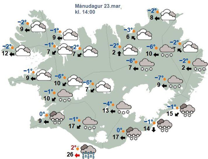 Gular veðurviðvaranir verða í gildi vegna þessa frá hádegi og sleppa fáir landshlutar við vonskuveðrið um tíma í það minnsta. Á hádegi tekur viðvörun gildi á Suðurlandi og svo koll af kolli um mestallt landið fram til hádegis á morgun. Aðeins höfuðborgarsvæðið og Breiðafjörður sleppa við gula viðvörun að þessu sinni. Vegagerðin hefur sett fjölda vega á óvissustig í dag frá því fyrir hádegi vegna vonskuveðursins, þar á meðal á Mosfellsheiði, Í Þrengslum, Hellisheiði, Kjalarnesi og á Reykjanesbraut en óvissustig þýðir að vegurinn gæti lokast með skömmum fyrirvara.Sömu sögu er að segja frá Vesturlandi og þá er vegurinn um Ólafsfjarðarmúla lokaður vegna snjóflóðs sem féll á hann í gærkvöldi. Gular veðurviðvaranir verða í gildi vegna óveðurs frá hádegi. Veðurstofan „Undir kvöld má búast við talsverðri ofankomu á Austurlandi, en þá fer að draga úr vindi og úrkomu sunnanlands. Hiti yfirleitt um eða undir frostmarki. Það er því útlit fyrir leiðindaveður víða um land þegar líður á daginn og gular viðvaranir taka gildi í flestum landshlutum. Við suðurströndina hvessir strax í kringum hádegi, en á Norðurlandi taka viðvaranirnar gildi undir kvöld.Norðlæg átt á morgun, víða 8-15 m/s og él, en 13-20 og snjókoma á Austurlandi fyrri part dags. Suðvestantil verður hins vegar þurrt að mestu. Frost 1 til 7 stig,“ segir á vef Veðurstofunnar. Spákort fyrir klukkan 14 í dag.Veðurstofan Veðurhorfur á landinu næstu daga Á þriðjudag: Norðan 13-20 m/s og snjókoma eða él, en 10-18 seinnipartinn og dregur úr ofankomu. Þurrt að mestu suðvestanlands. Frost 1 til 7 stig. Á miðvikudag: Breytileg átt 3-10, en norðvestan 13-20 austantil fram eftir degi. Víða líkur á dálitlum éljum, en bjart að mestu á Suðausturlandi. Frost 2 til 10 stig. Á fimmtudag: Gengur í suðaustan 18-25 með snjókomu og síðar rigningu eða slyddu, en úrkomulítið norðaustantil og hægari vindur þar fram eftir degi. Hlýnar talsvert. Dregur úr vindi sunnan- og vestantil seinnipartinn með skúrum eða slydduéljum. Á föstudag: Suðvestanátt og slydda eða snjókoma með köflum, en þurrt að kalla austanlands. Hiti um eða yfir frostmarki. Á laugardag: Suðlæg eða breytileg átt og slydda eða rigning, en úrkomulítið norðaustantil. Hlýnar heldur. Á sunnudag: Norðvestan- og vestanátt og víða líkur á éljum. Kólnar í veðri.